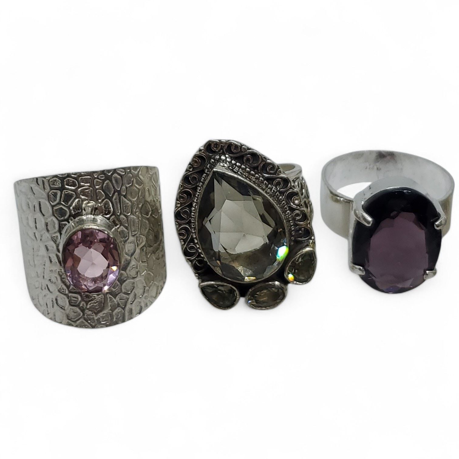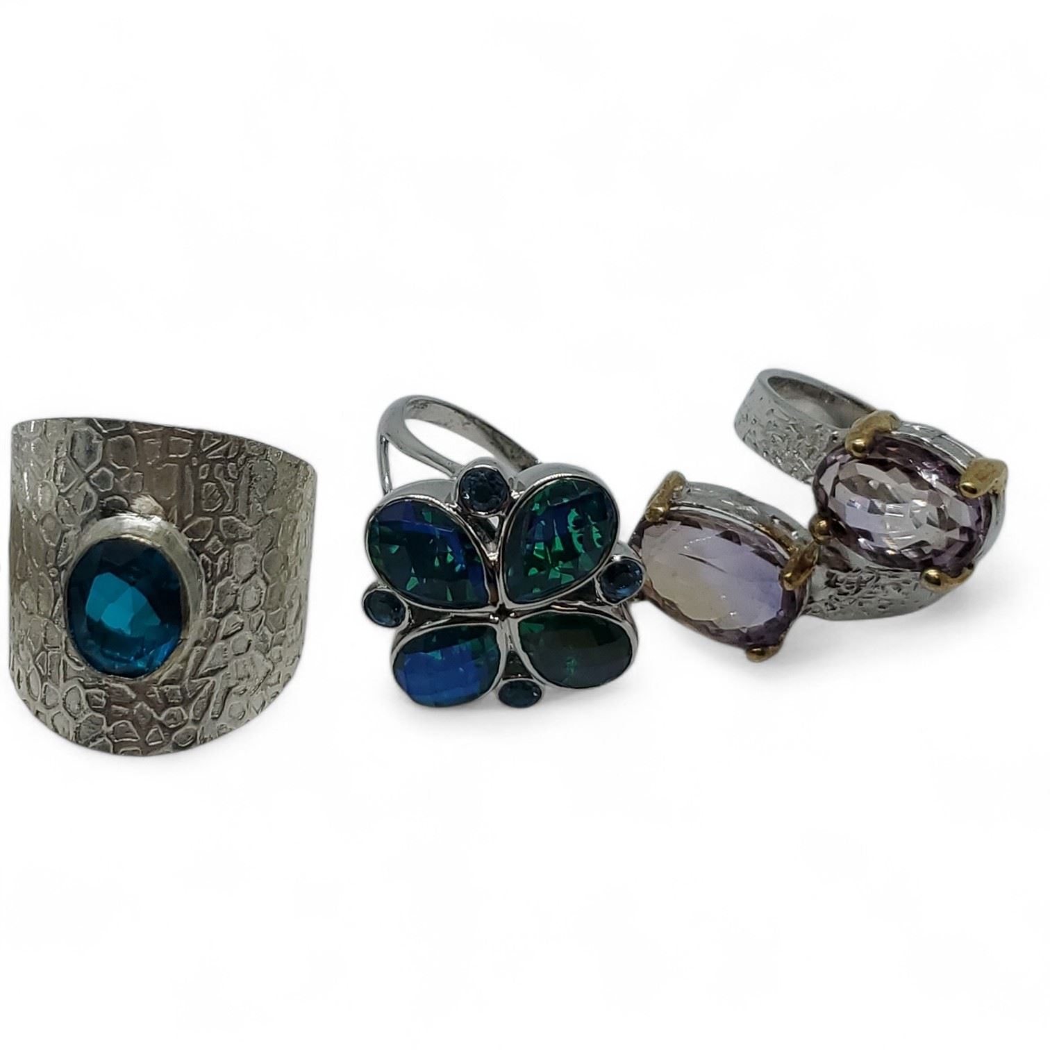 6 New Faceted Peridot, Amethyst. Pink Morganite & Blue Crystal & Quartz Rings in Silver Settings * all stamped .925 (longest ring is 26 mm) * Total weight: 42.3 grams
