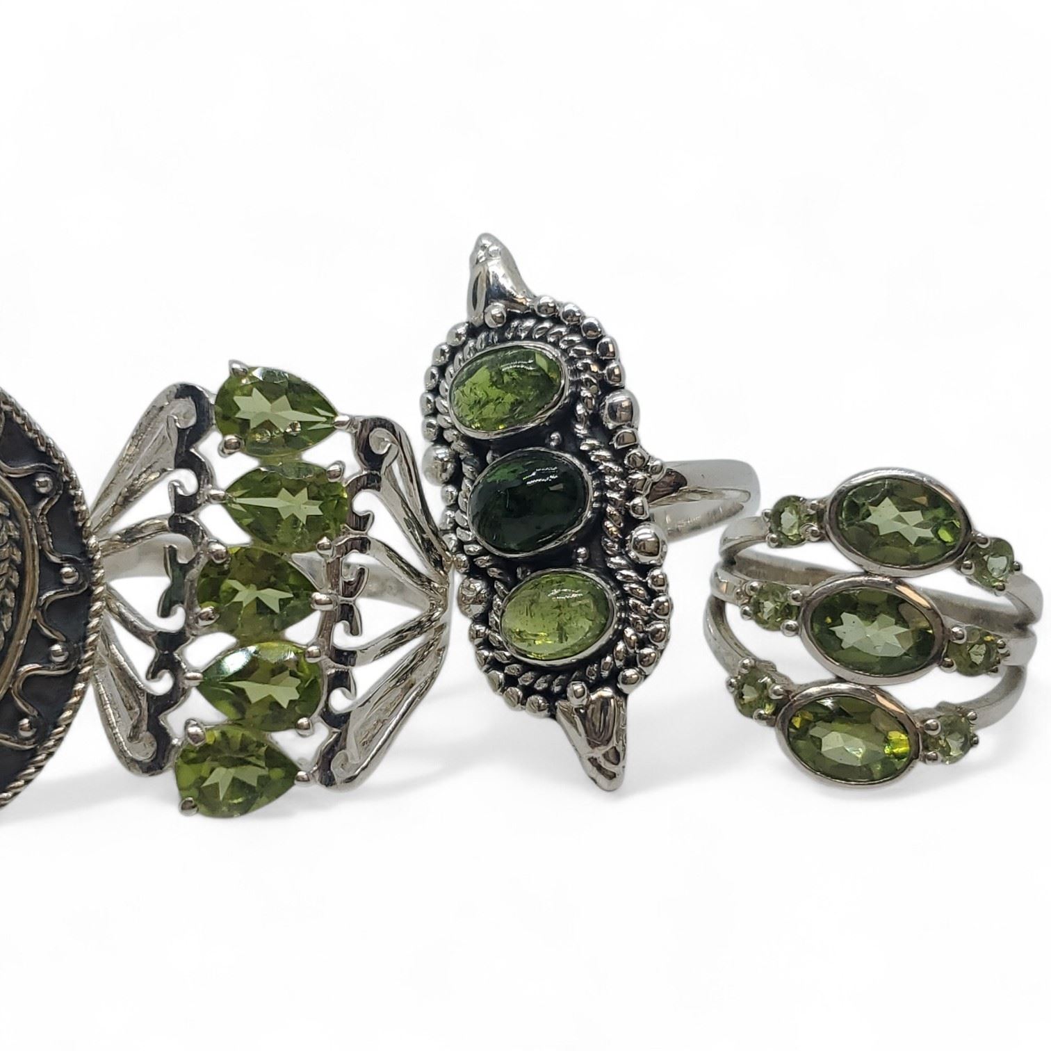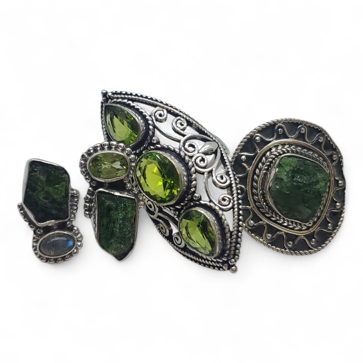 6 New Faceted Peridot Crystal & Raw Moldavite Rings in Silver Settings * all stamped .925 (longest ring is 44 mm) * Total weight: 45.6 grams