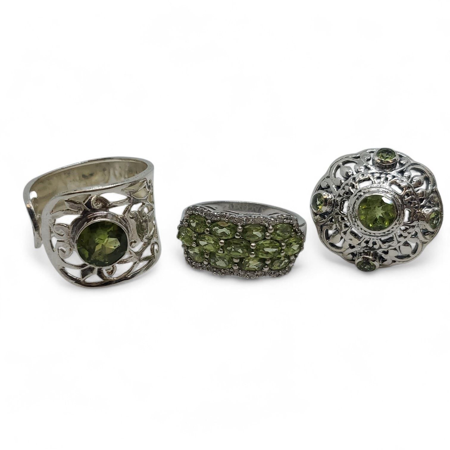 6 New Faceted Peridot & Emerald Crystal Rings in Silver Settings * all stamped .925 (longest ring is 38 mm) * Total weight: 53.7 grams