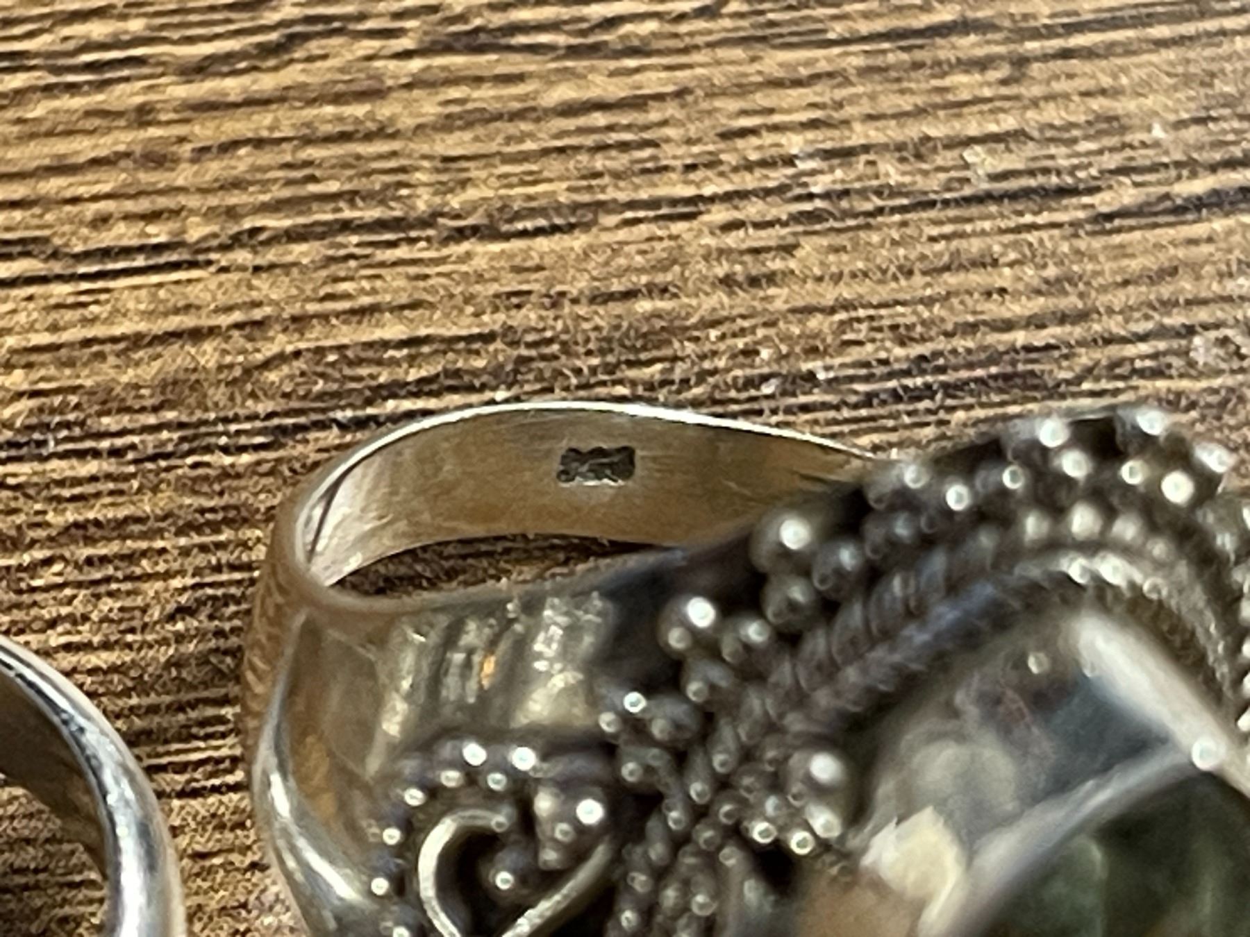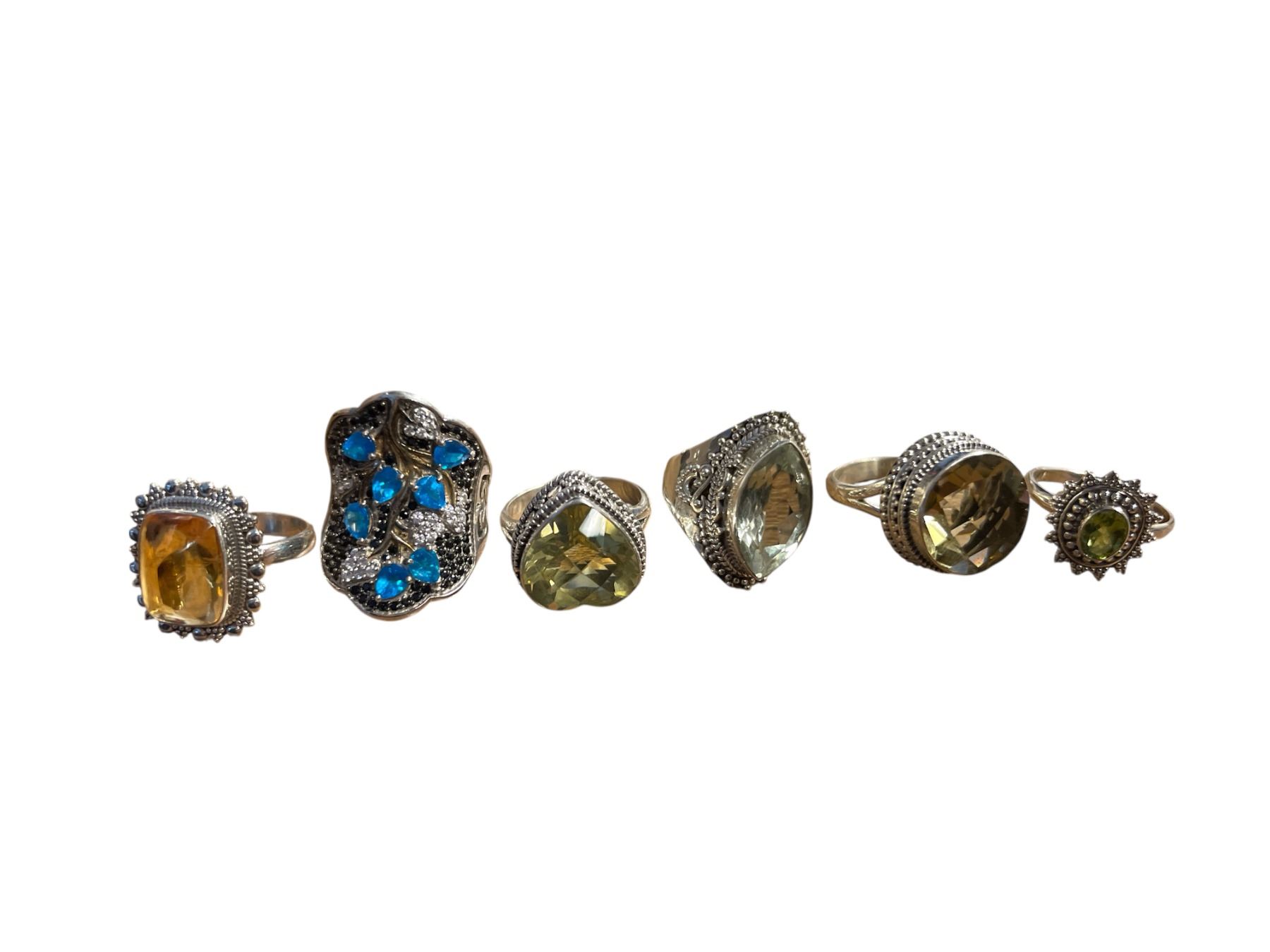 6 New Faceted Topaz, Peridot & Citrine Crystal Rings in Silver Settings - all stamped .925 (longest ring is 30 mm) Total weight: 49.0 grams