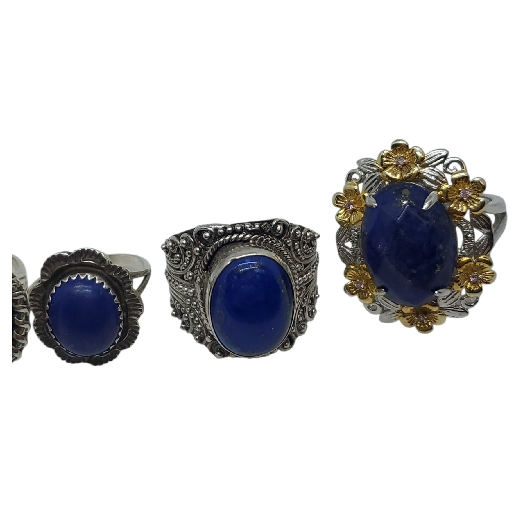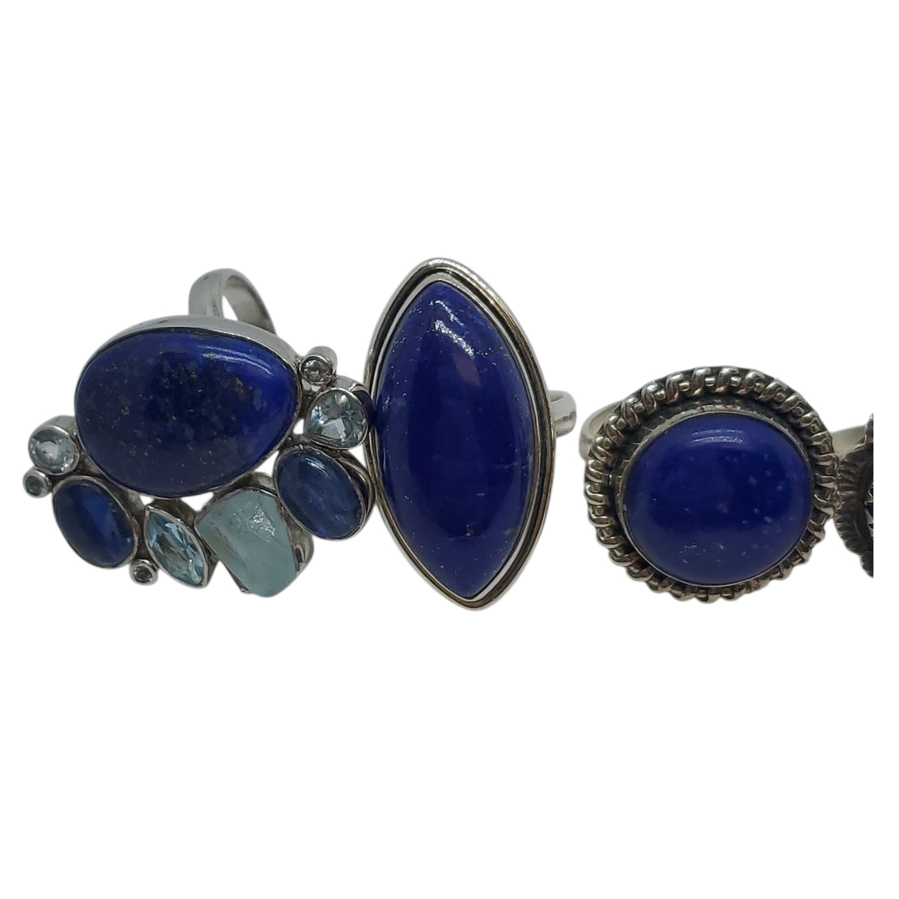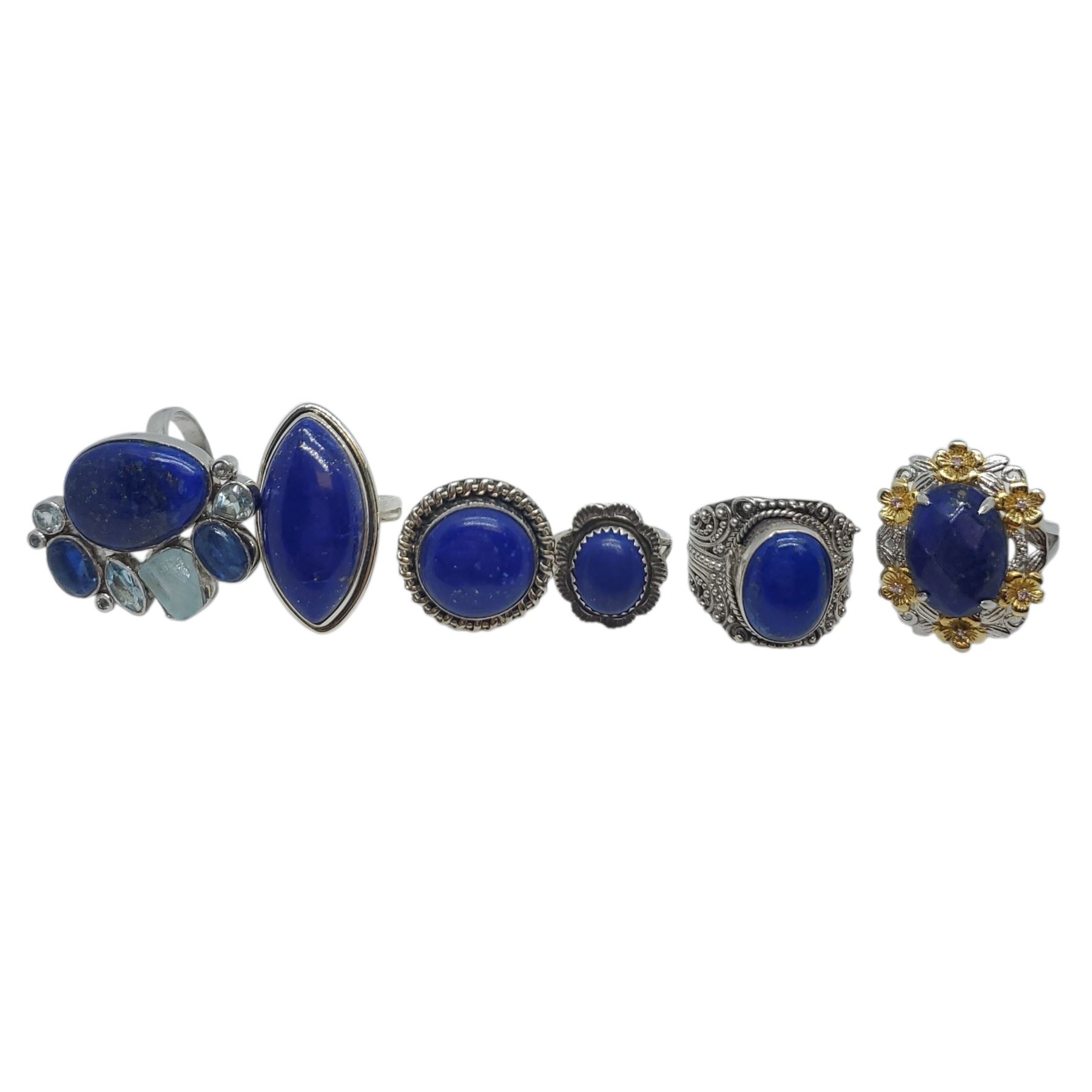 6 New Lapis Lazuli Ring in Silver Settings * all stamped .925 * 1 has brass accents and 1 has faceted crystals (longest ring is 34 mm) * Total weight: 52 grams