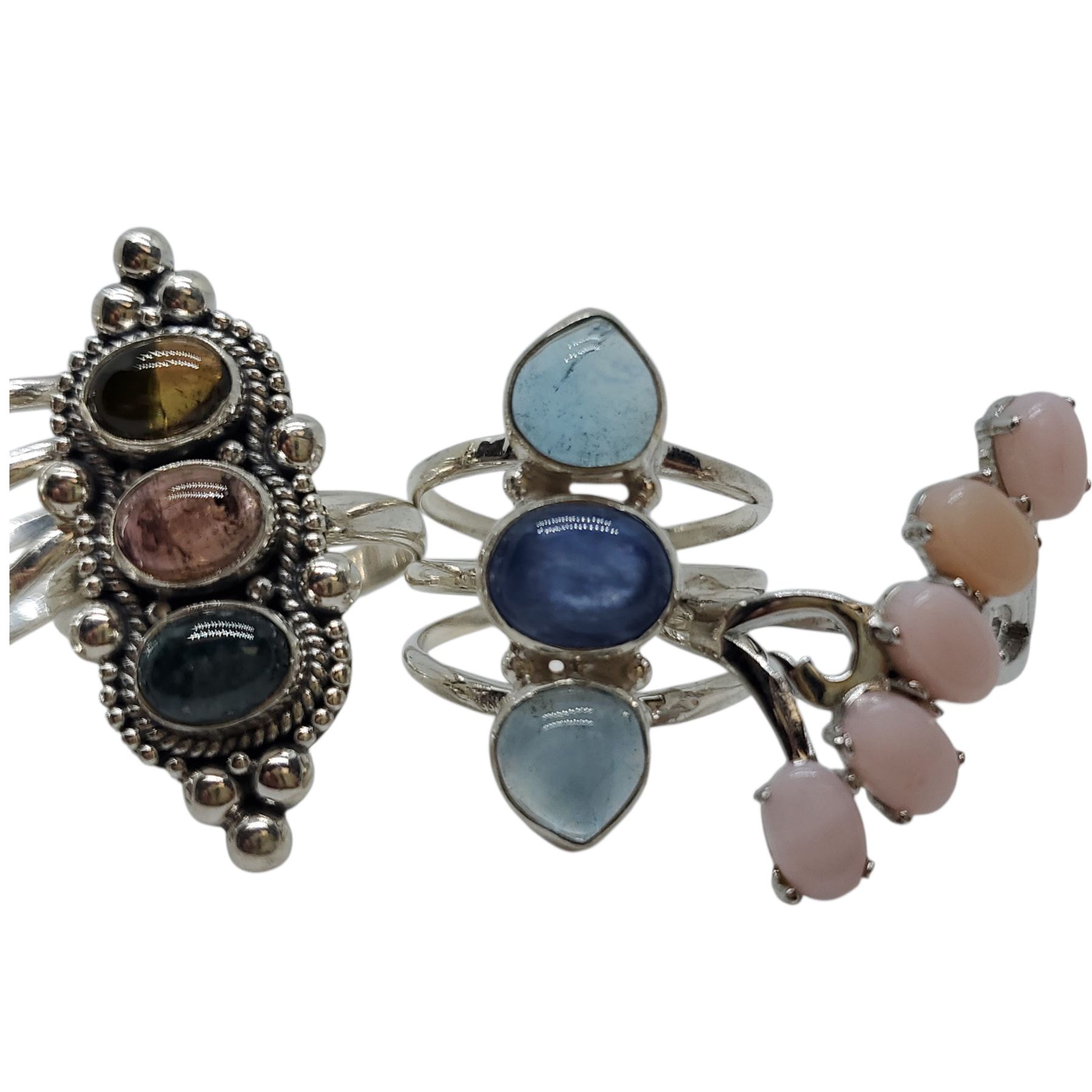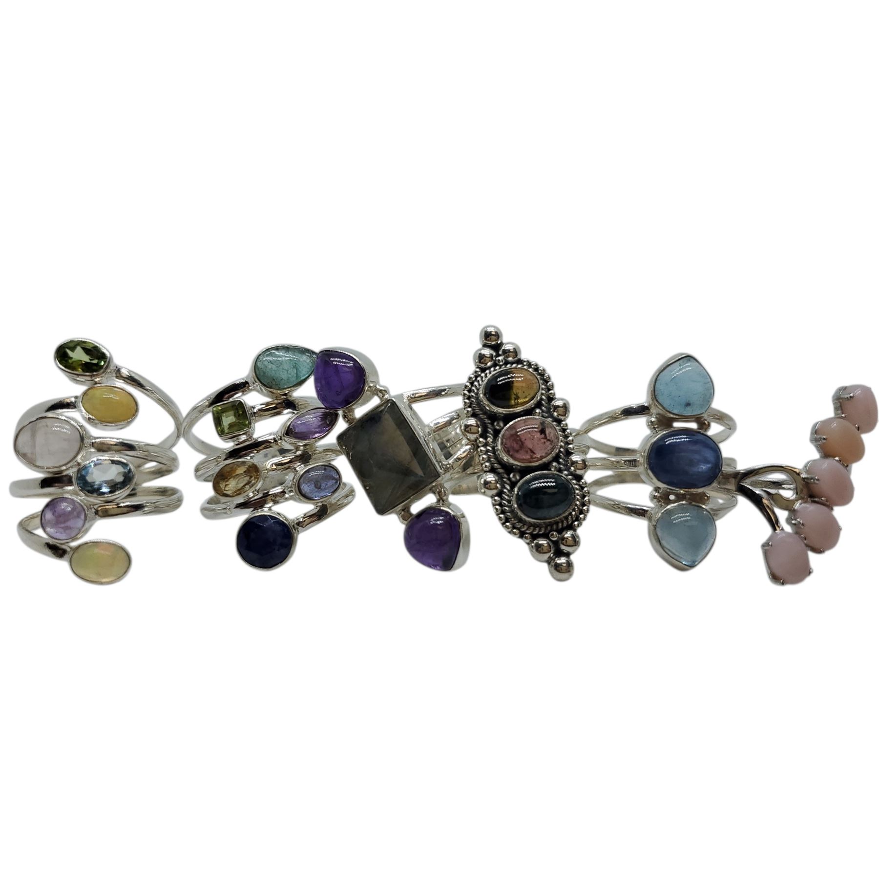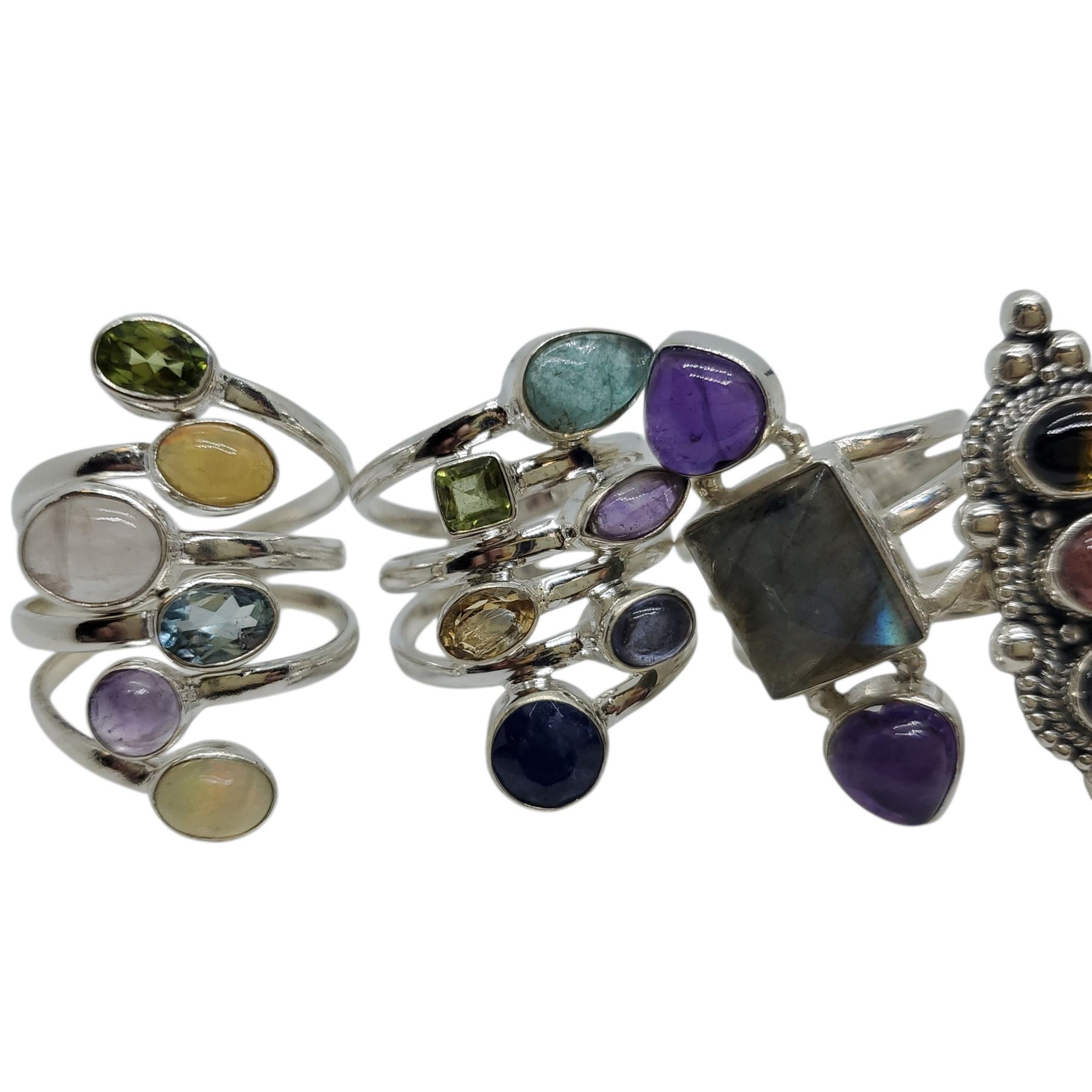 6 New Multi-Gemstone Rings in Silver Settings * all stamped .925 (Amethyst, Topaz, Labradorite, Peridot and more) (longest ring is 34 mm) Total weight: 42.2 grams
