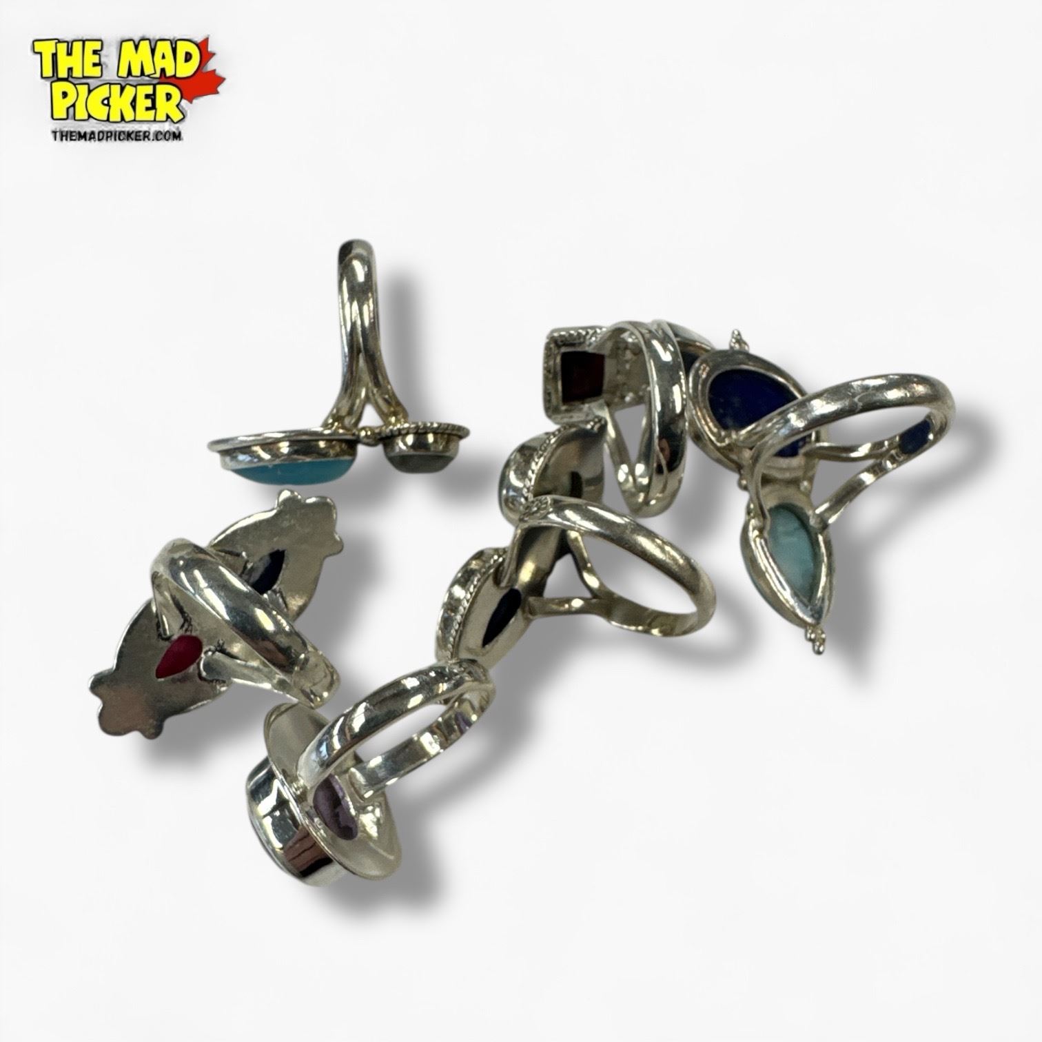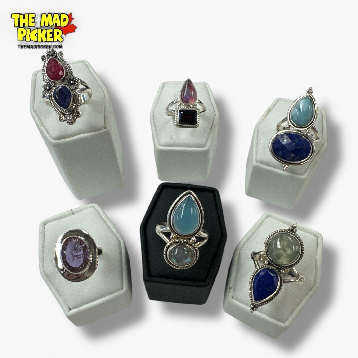 6 New Natural Stone, Gemstone & Faceted Crystal Rings in Silver Settings - all stamped .925 (Lapis, Amethyst, Garnet, Moonstone and Peridot) Total weight: 43.1 grams
