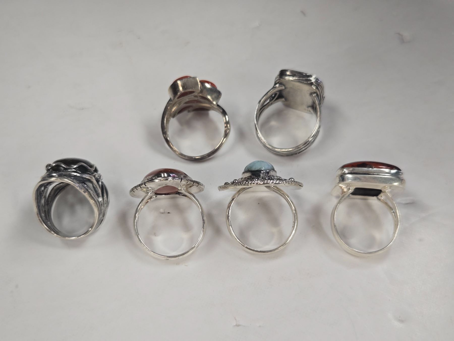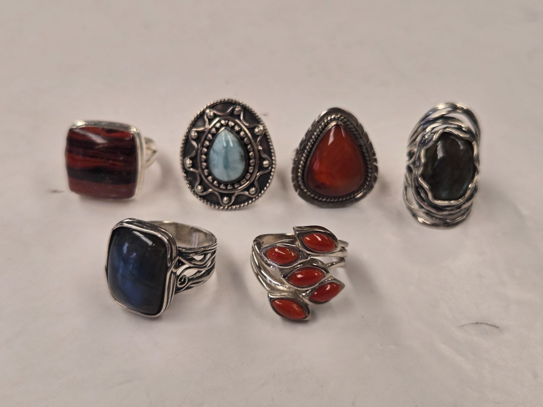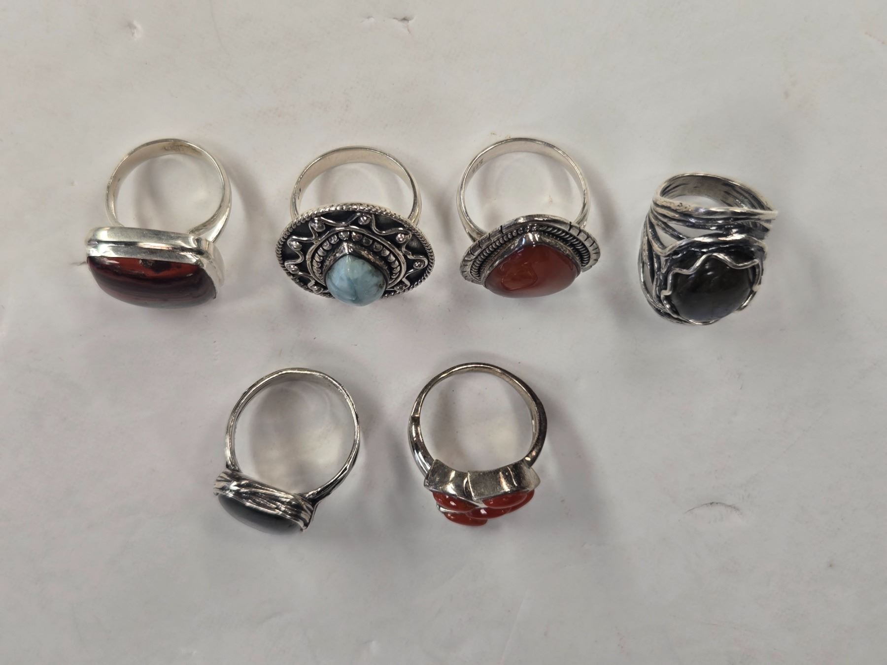 6 New Natural Stone Rings in Silver Settings - all stamped .925 (Iron Tiger Eye, Labradorite, Red Jasper, and Larimar) Total weight: 62.2 grams