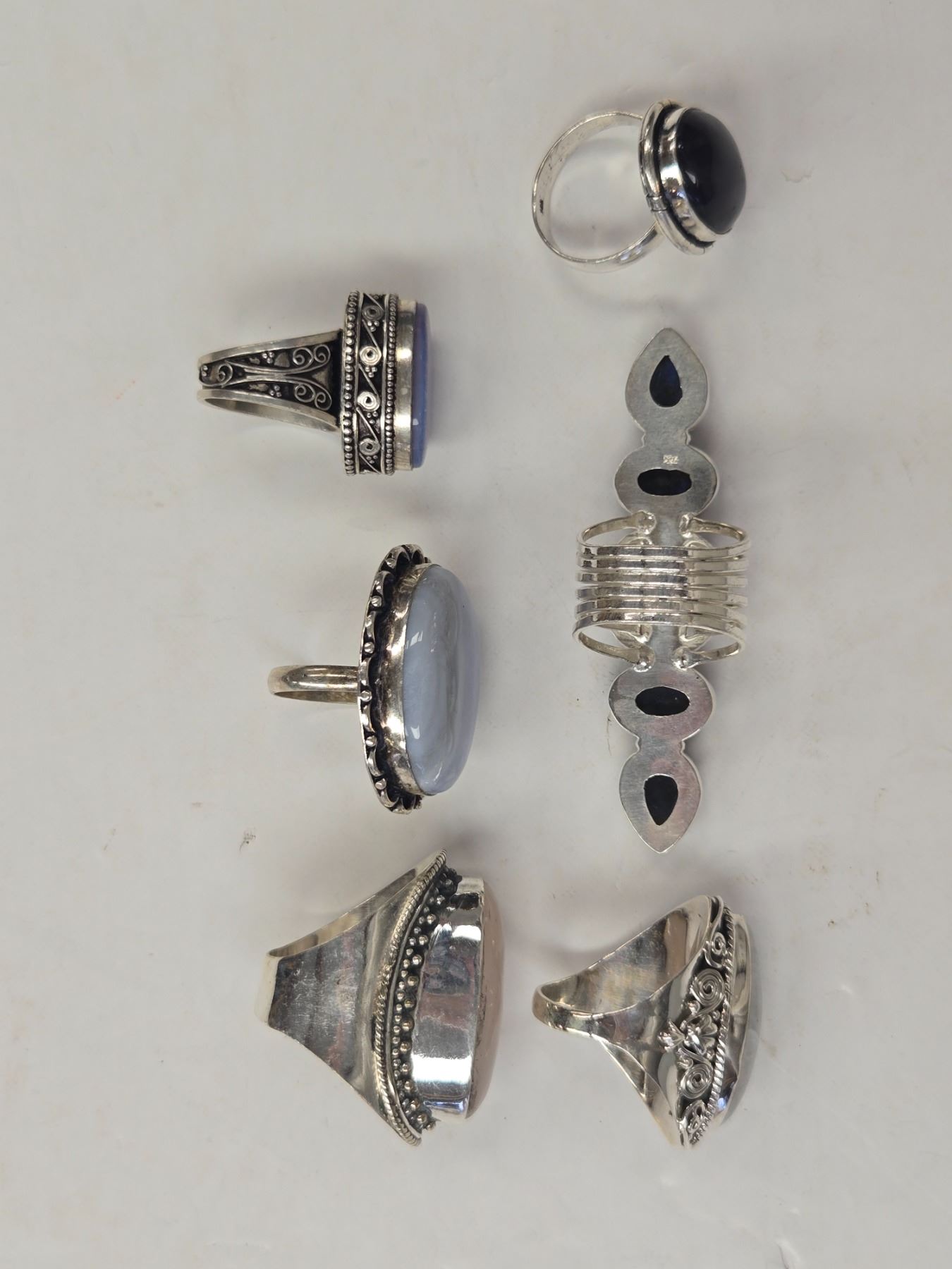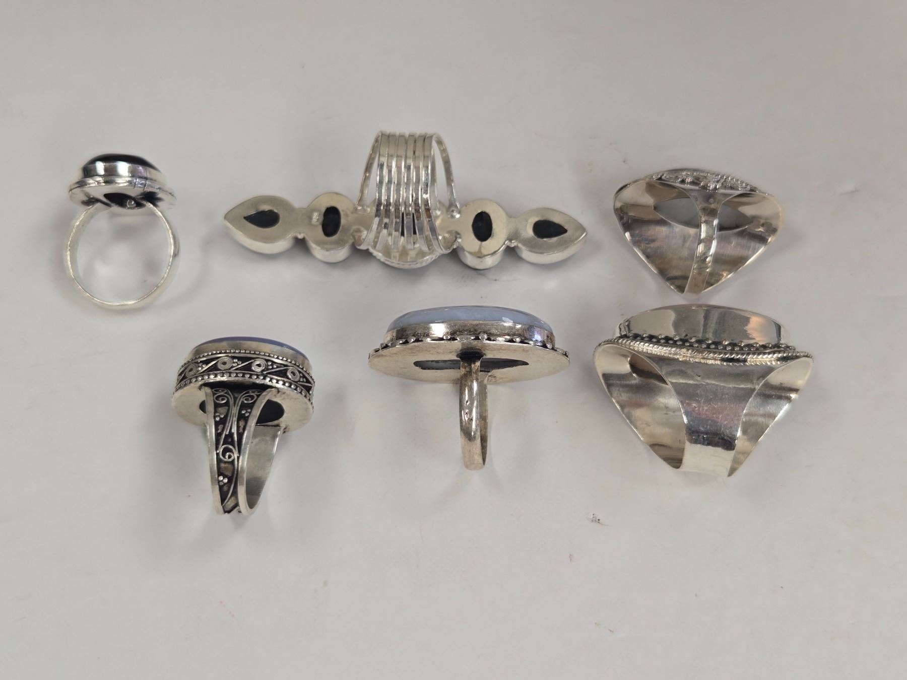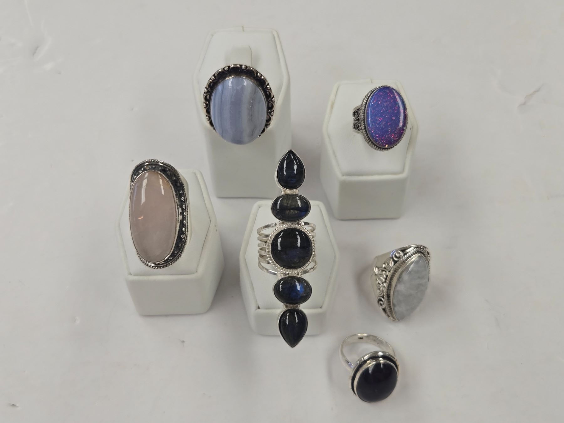 6 New Natural Stone Rings in Silver Settings - all stamped .925 (Labradorite, Triplet Opal, Larimar, Agate, & Rose Quartz) Total weight: 81.4 grams