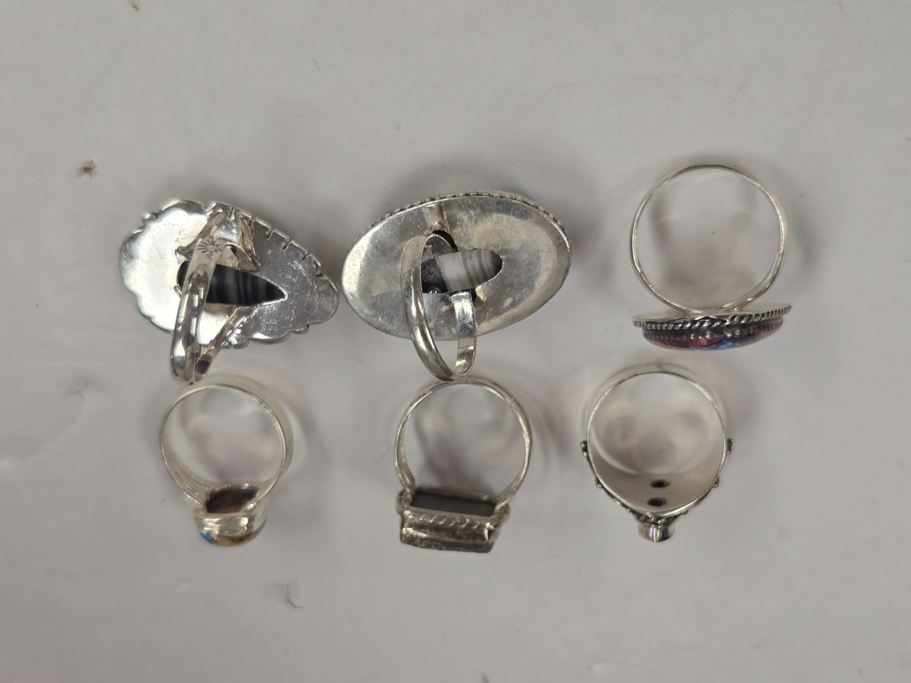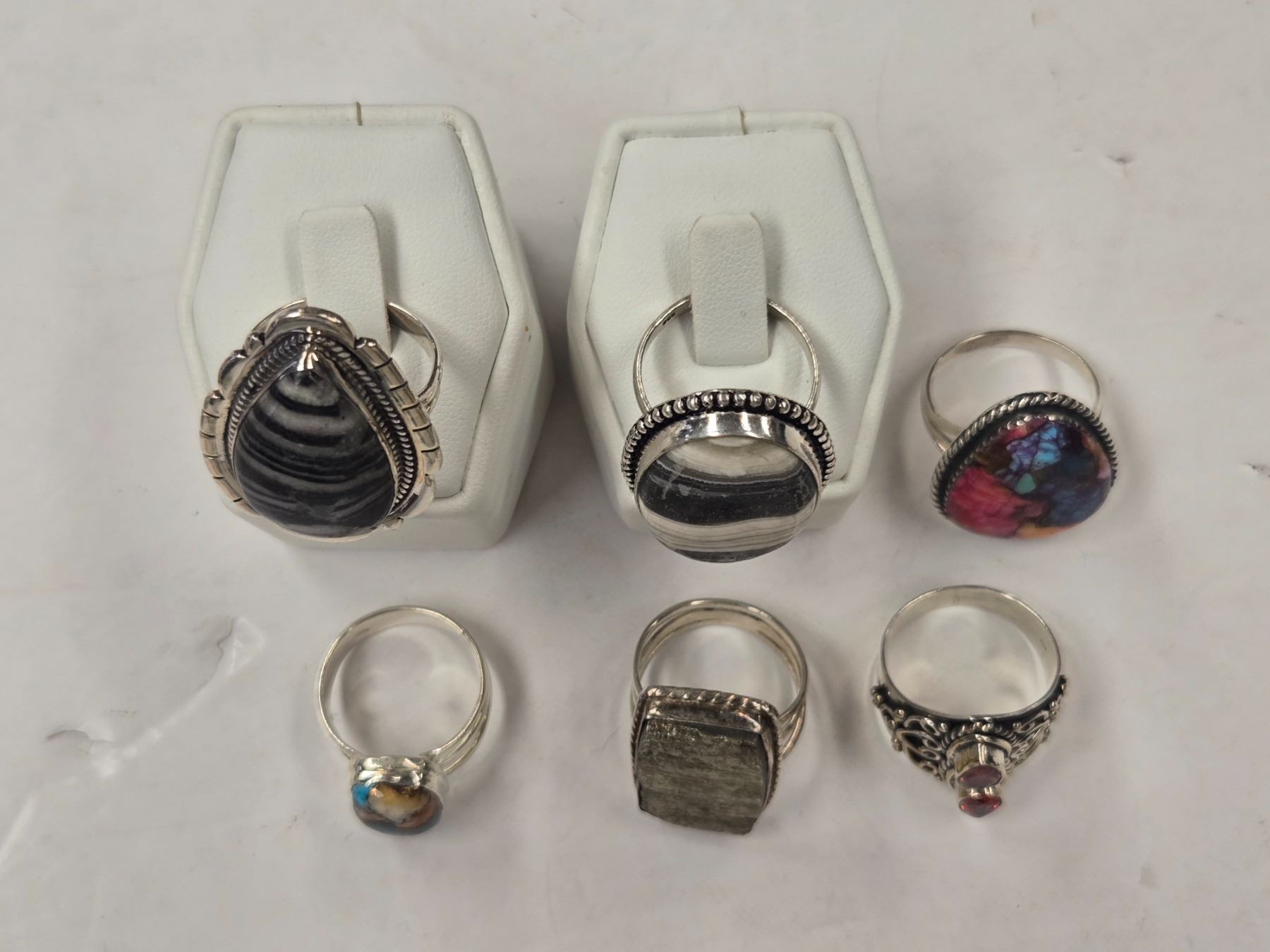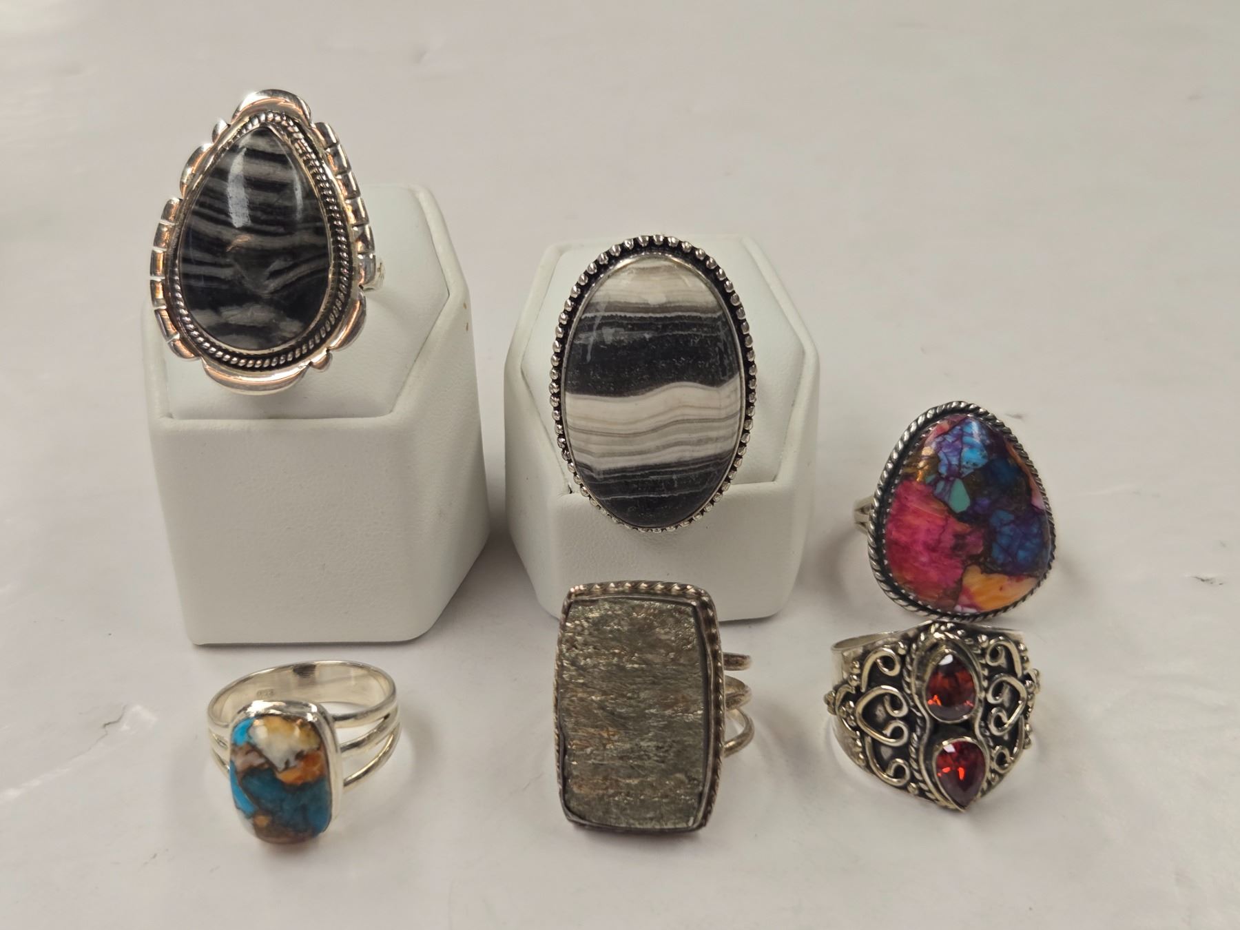 6 New Natural Stone Rings in Silver Settings - all stamped .925 (Oyster Copper Turquoise, Garnet Crystal, Pyrite, & Zebra Agate) Total weight: 58.0 grams