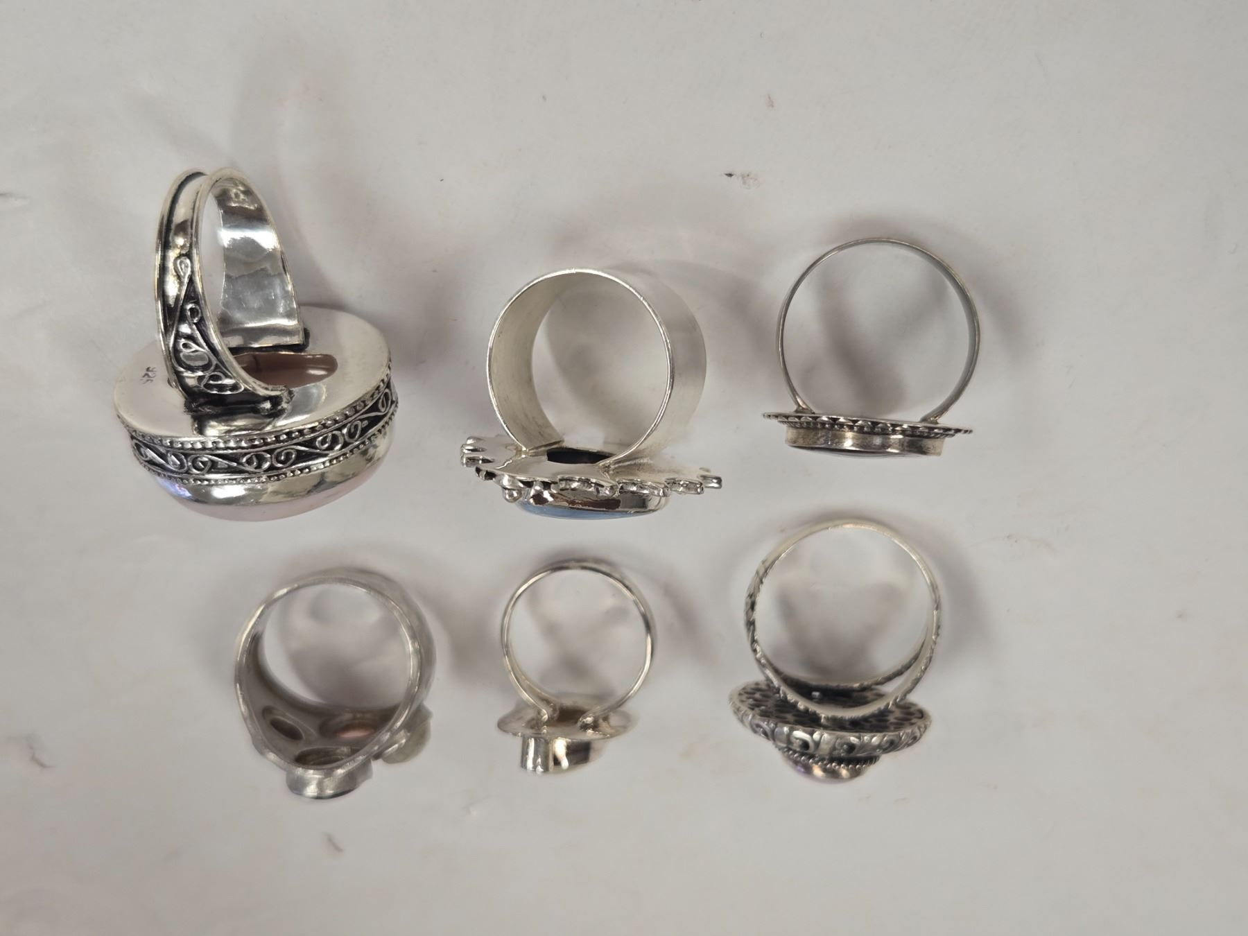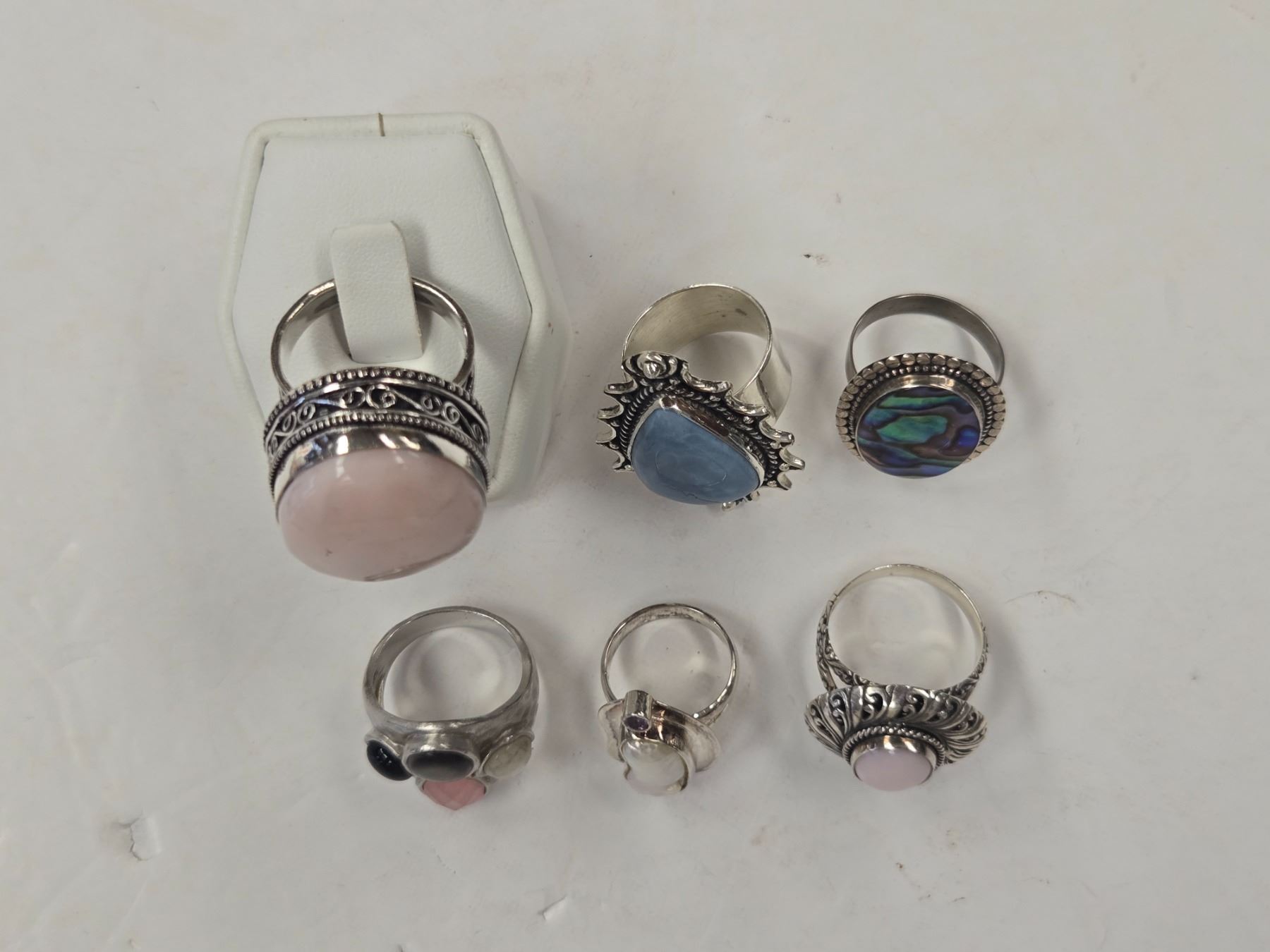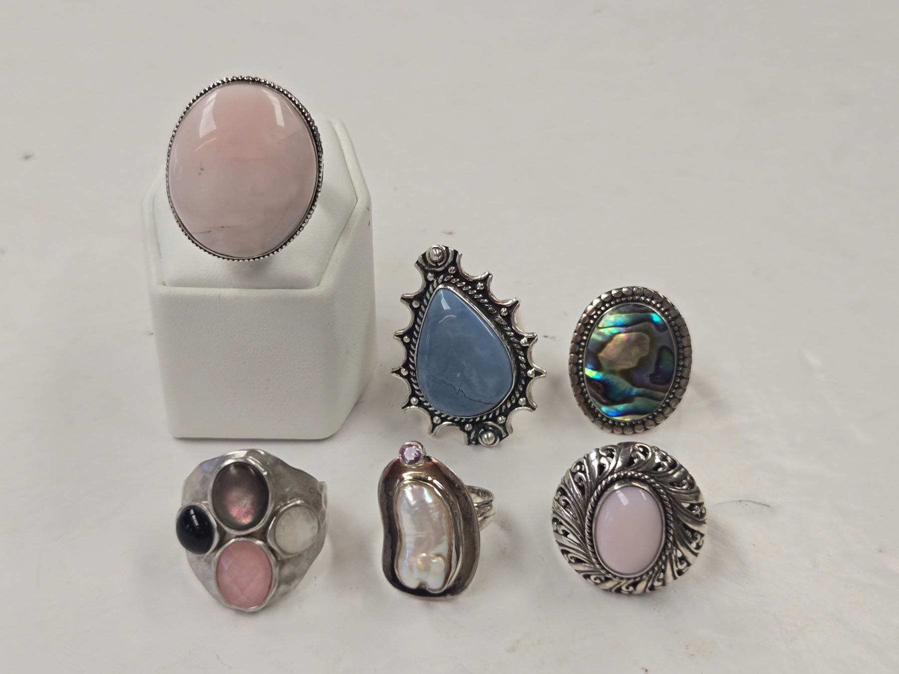6 New Natural Stone Rings in Silver Settings - all stamped .925 (Pink Andean Opal, Abalone, Mabe Pearl, Larimar, & Multi-Gemstone) Total weight: 51.9 grams
