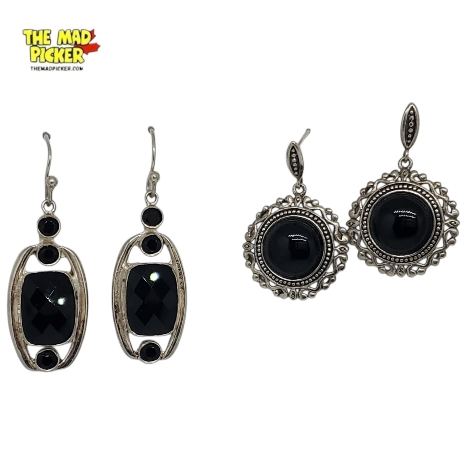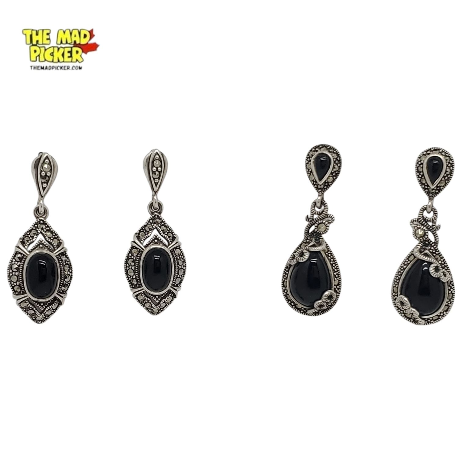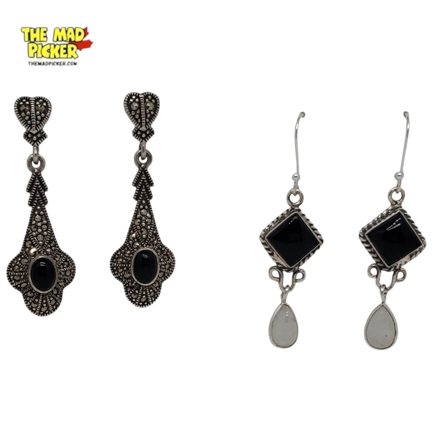 6 New Pairs of Sterling Silver Onyx Earrings for Pierced Ears - Some with Marquisates and 1 Pair with Moonstones (all stamped .925) Total weight: 41.3 grams