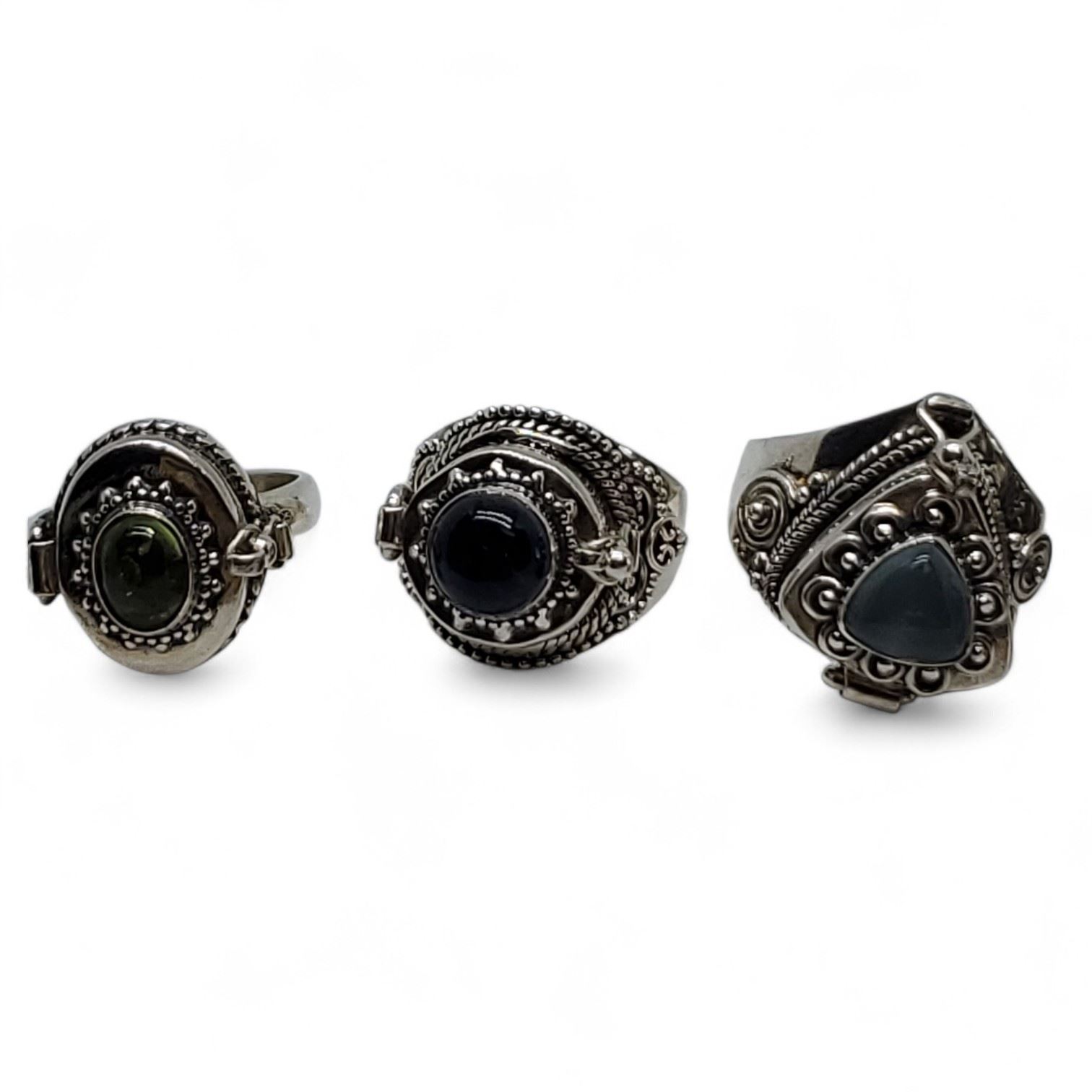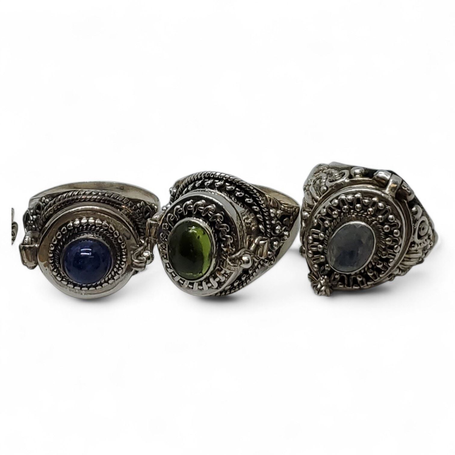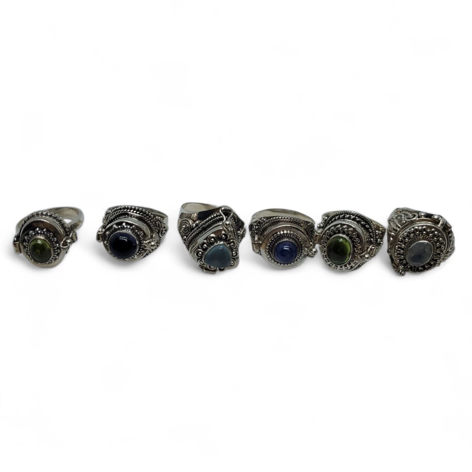 6 New Poison Compartment Gemstone Rings in Silver Settings - all stamped .925 (longest ring is 21 mm) Total weight: 52.0 grams