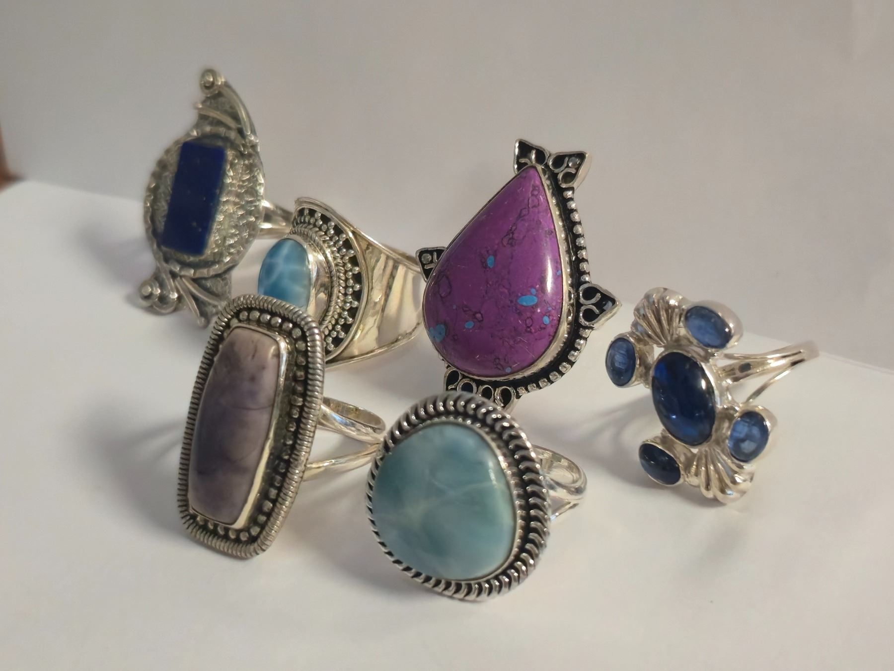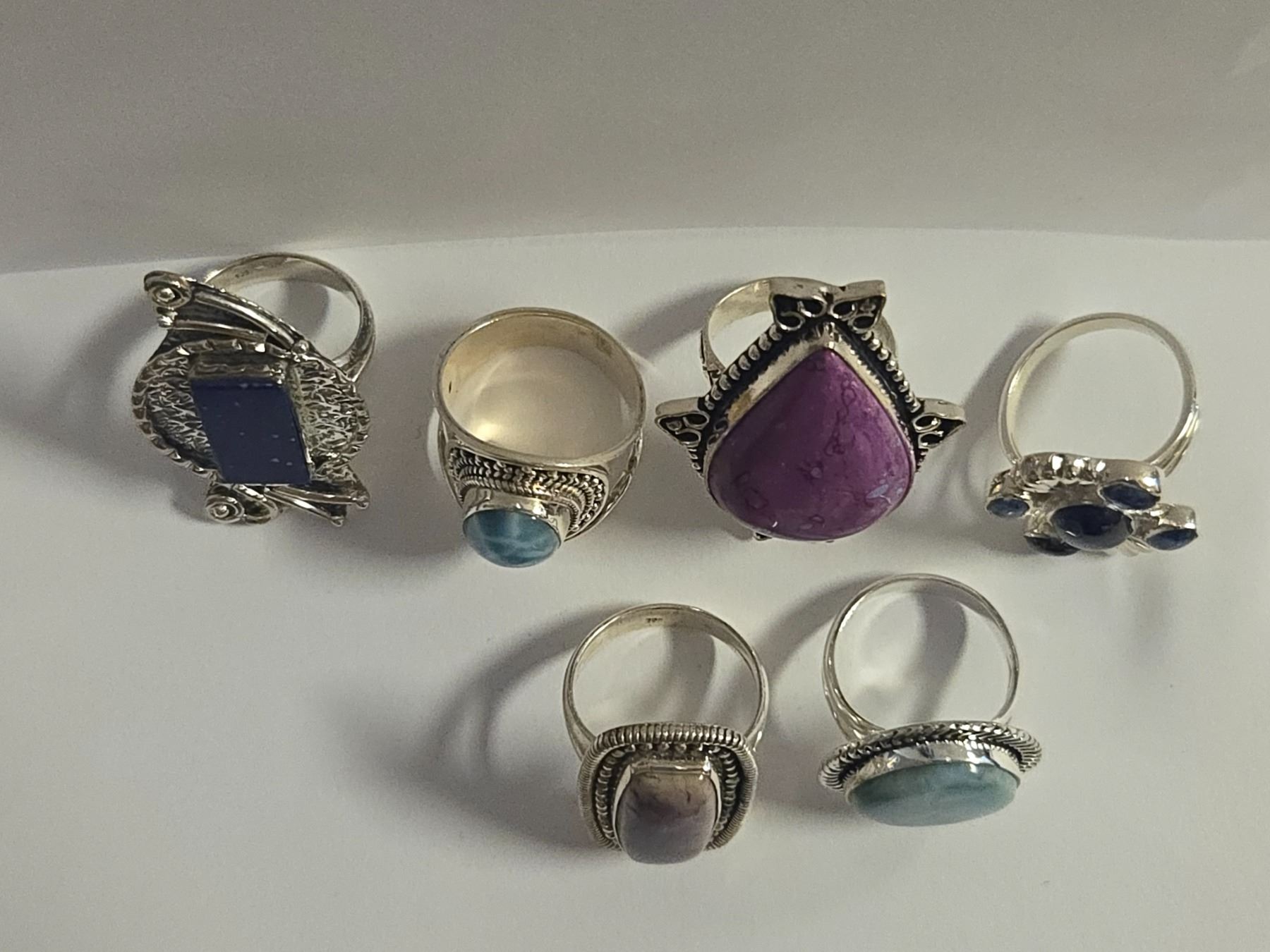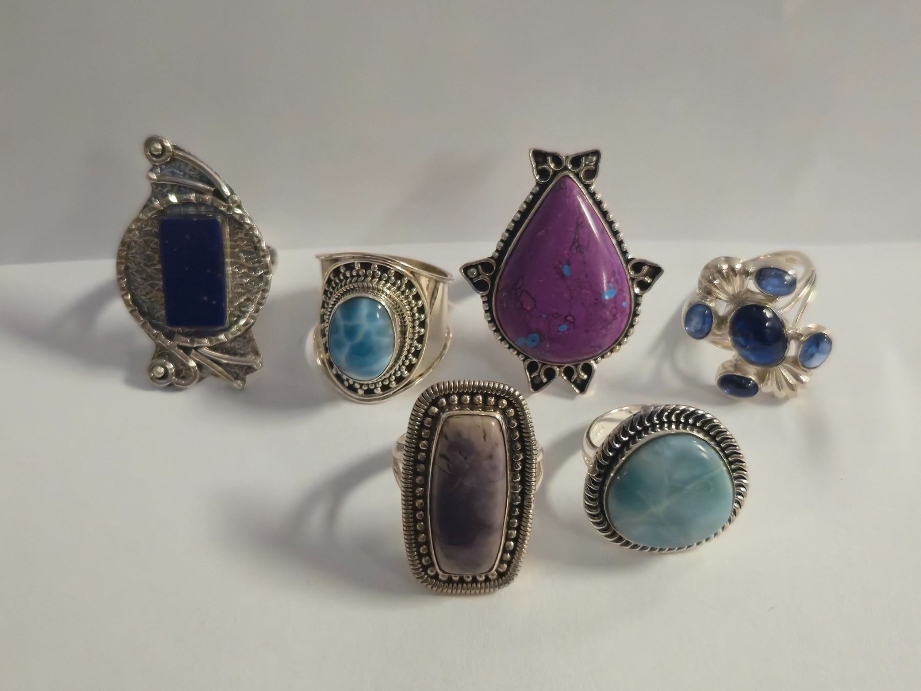 6 New Polished, Agate, Charoite, Lapis & Larimar Rings in Silver Settings - all stamped .925 (longest ring is 37 mm) Total weight: 52.1 grams