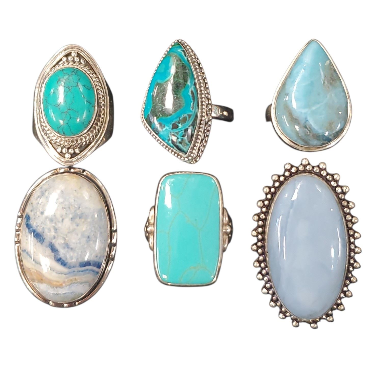 6 New Polished Agate & Gemstone Rings (all stamped .925) *Ocean Agate, Blue Scheelite, Turquoise, Royston Turquoise & Larimar * Total weight: 57 grams * Display tray not included