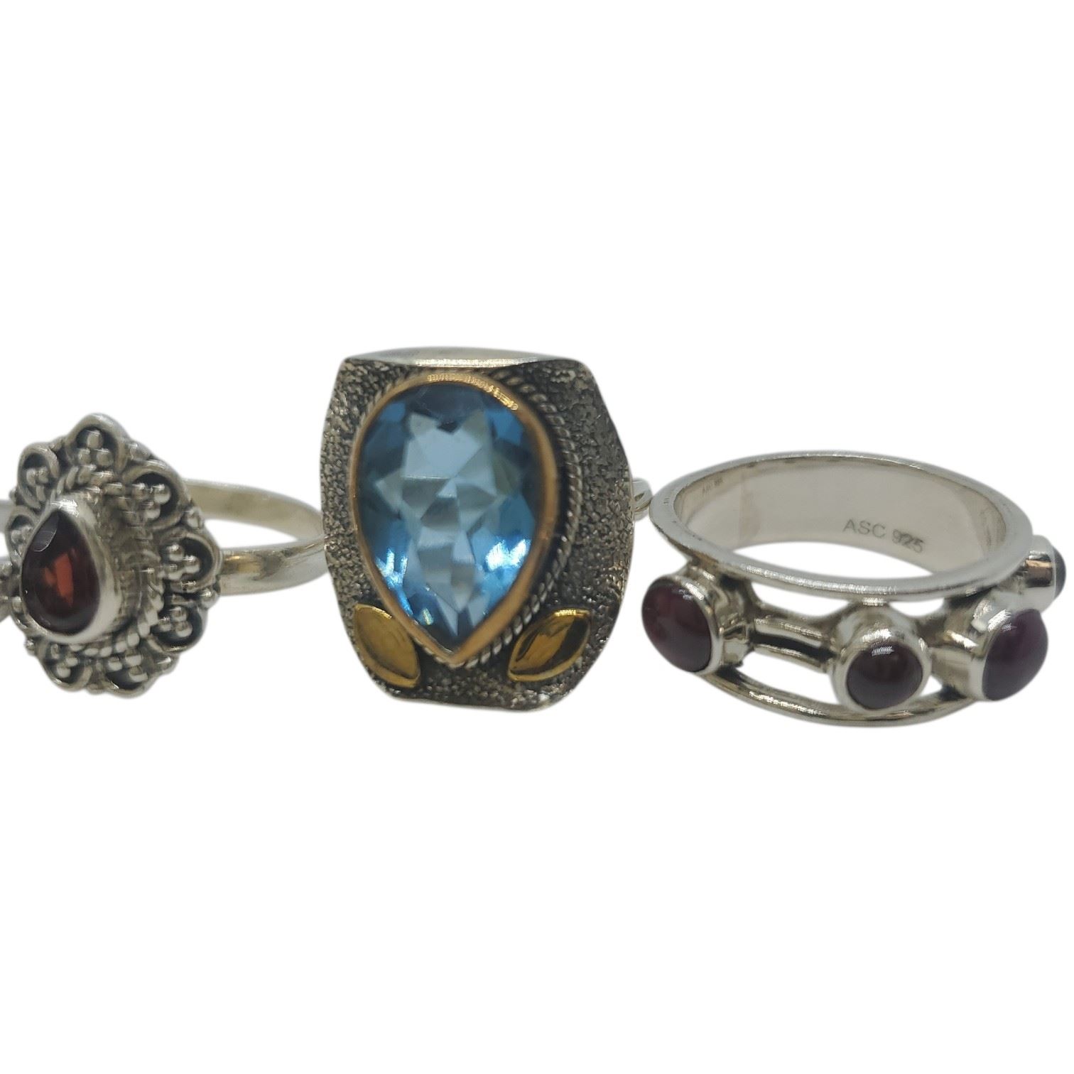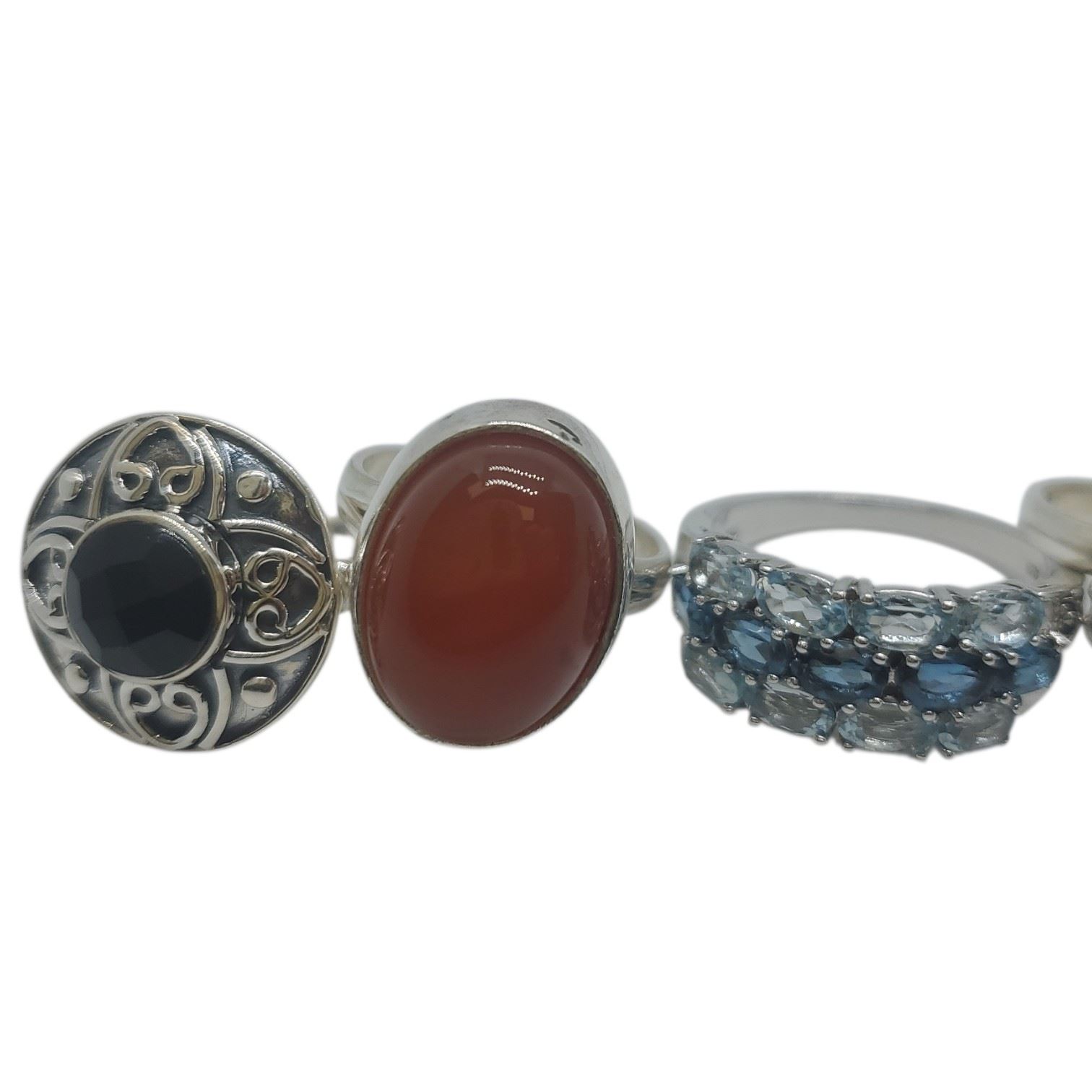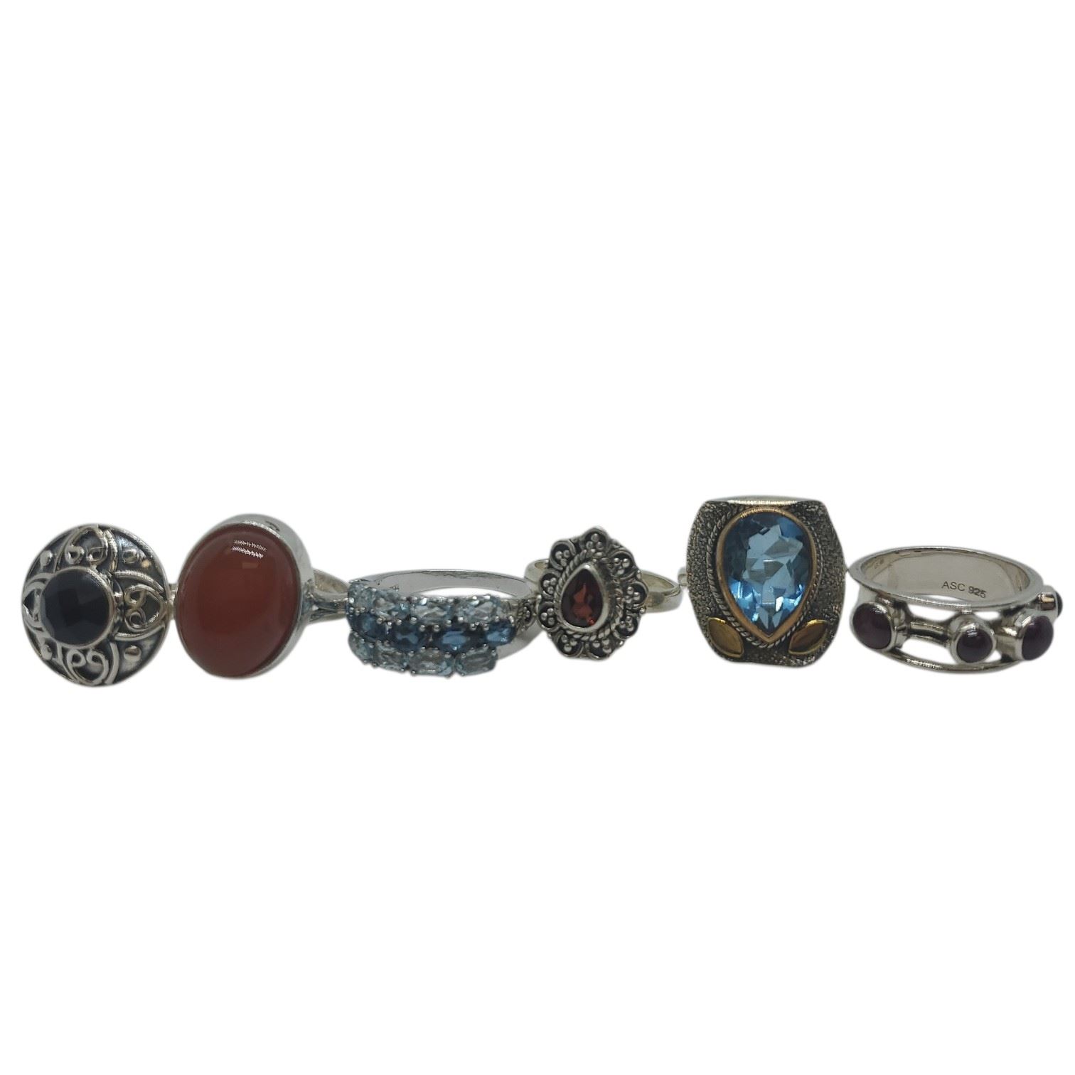 6 New Polished & Faceted Crystal and Gemstone Rings in Silver Settings * all stamped .925 (Garnet, Red Onyx, Citrine, Topaz and Aquamarine) (longest ring is 18 mm) * Total weight: 29.2 grams