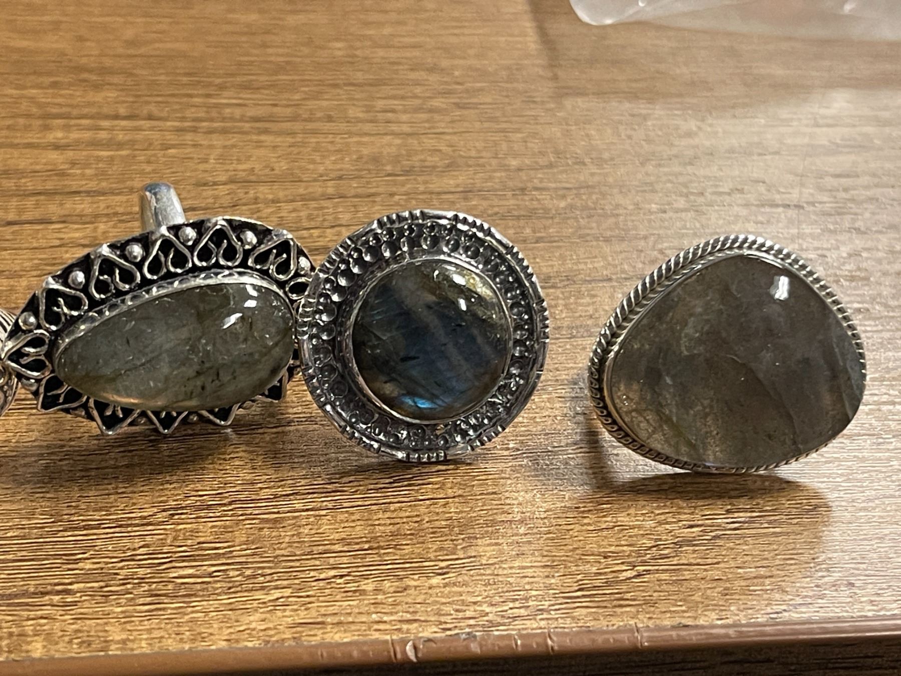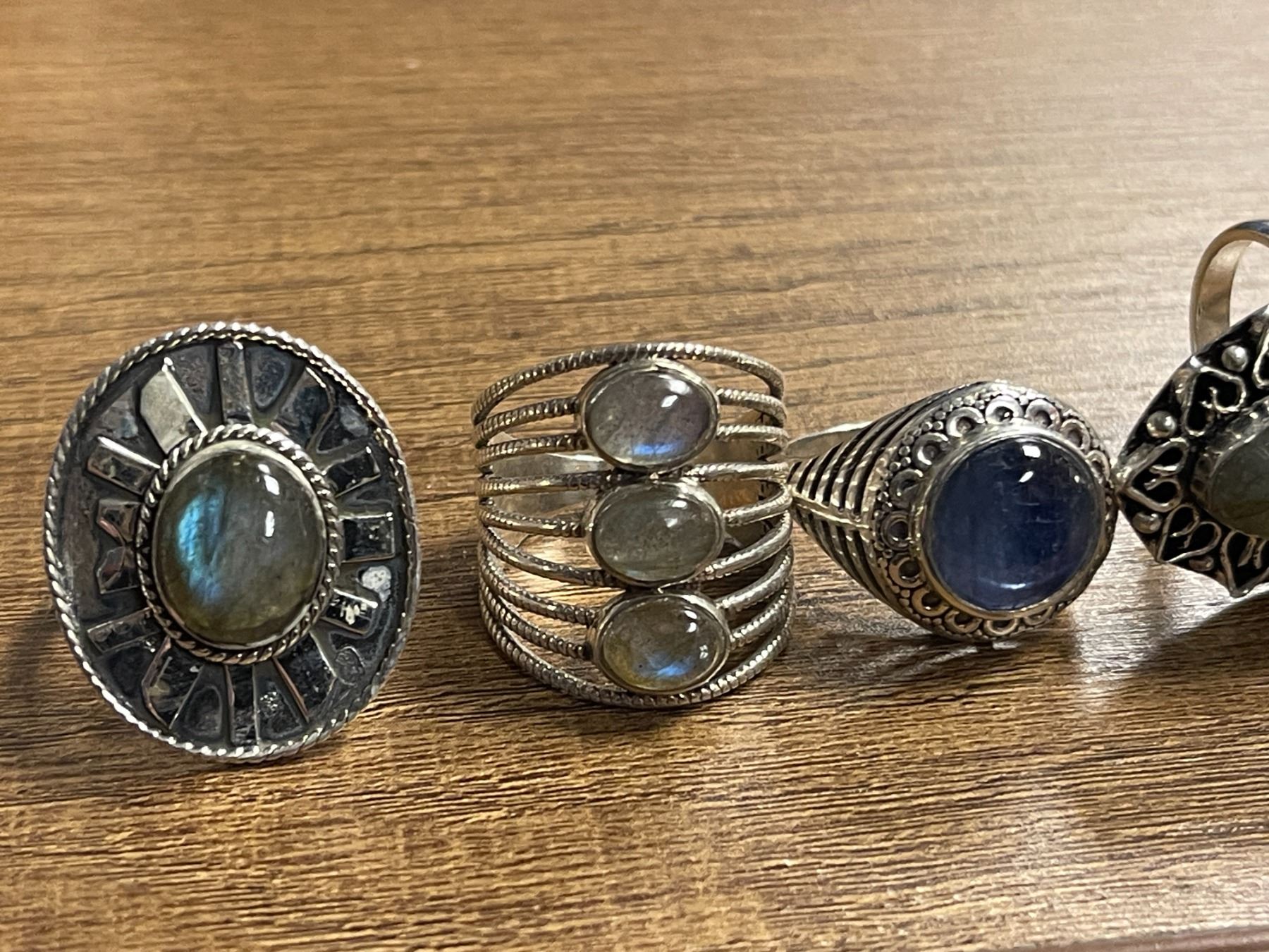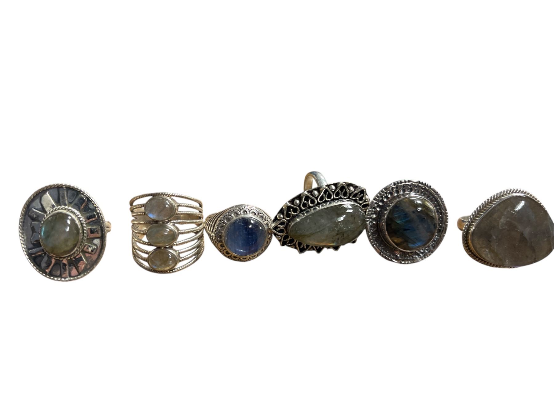 6 New Polished Labradorite Rings in Silver Settings - all stamped .925 (longest ring is 34 mm) Total weight: 54.6 grams