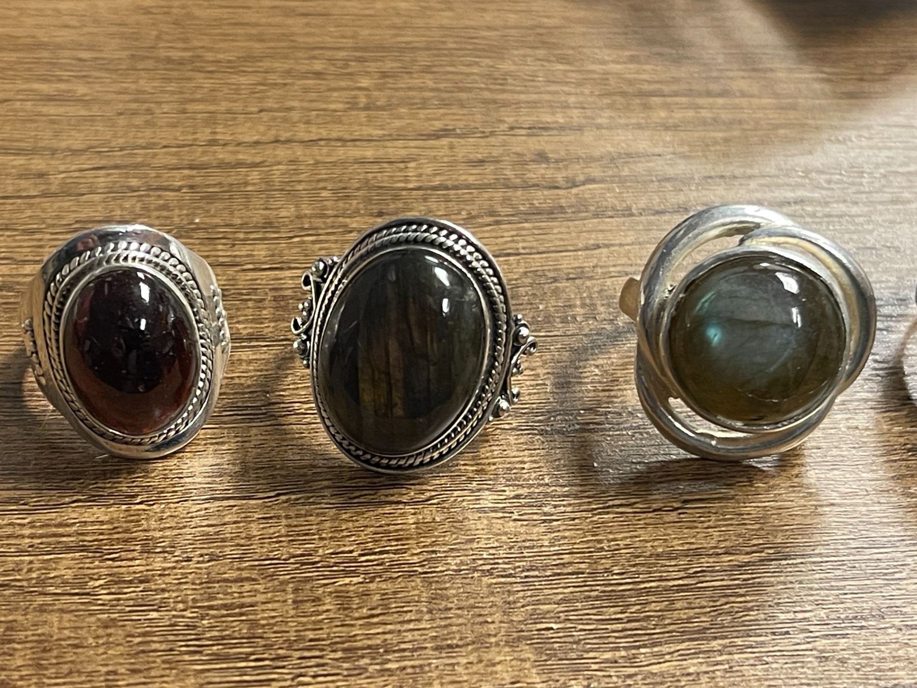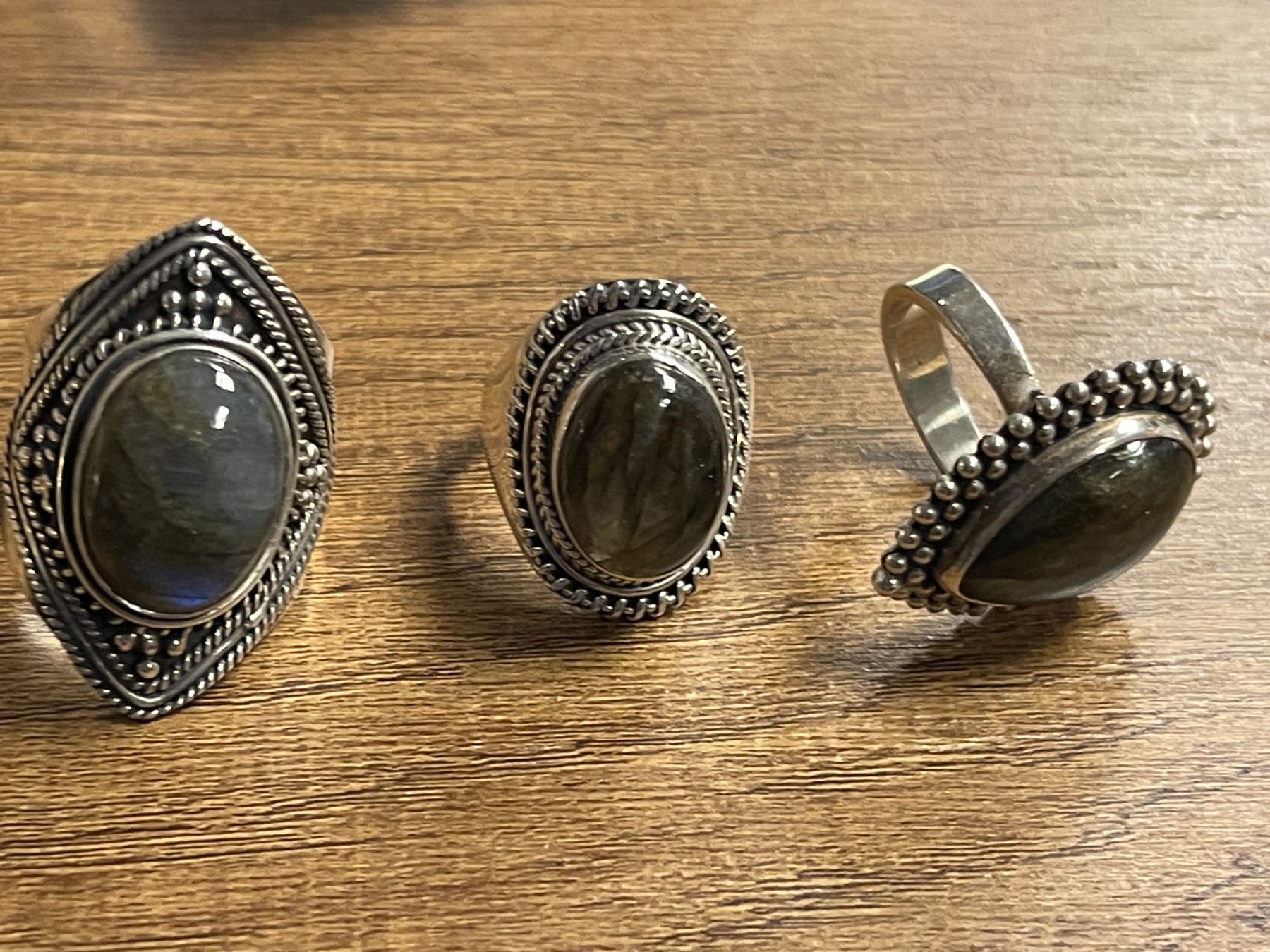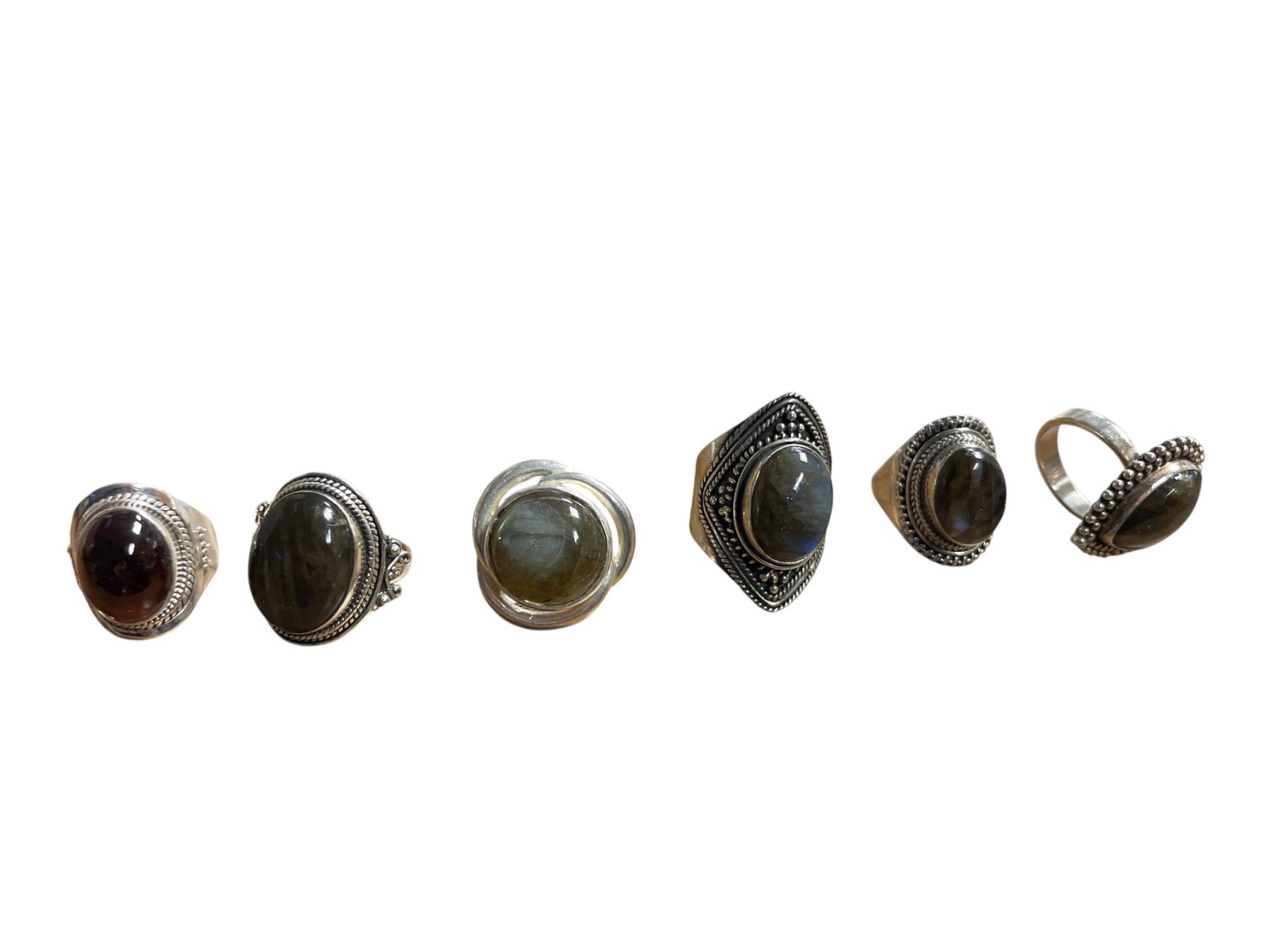 6 New Polished Labradorite Rings in Silver Settings - all stamped .925 (longest ring is 35 mm) Total weight: 62.0 grams