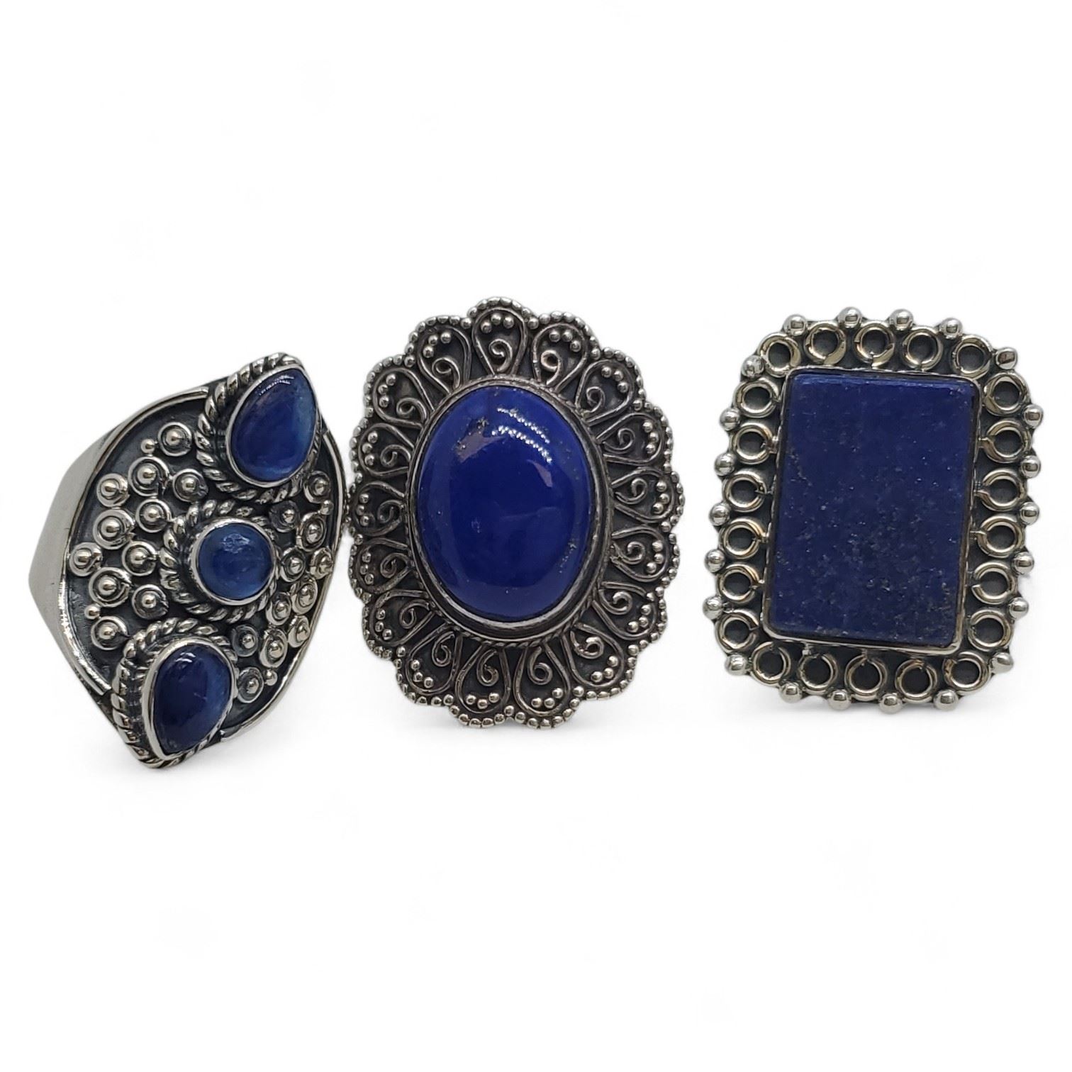 6 New Polished Lapis Lazuli Rings in Silver Settings * all stamped .925 (longest ring is 26 mm) * Total weight: 51.0 grams