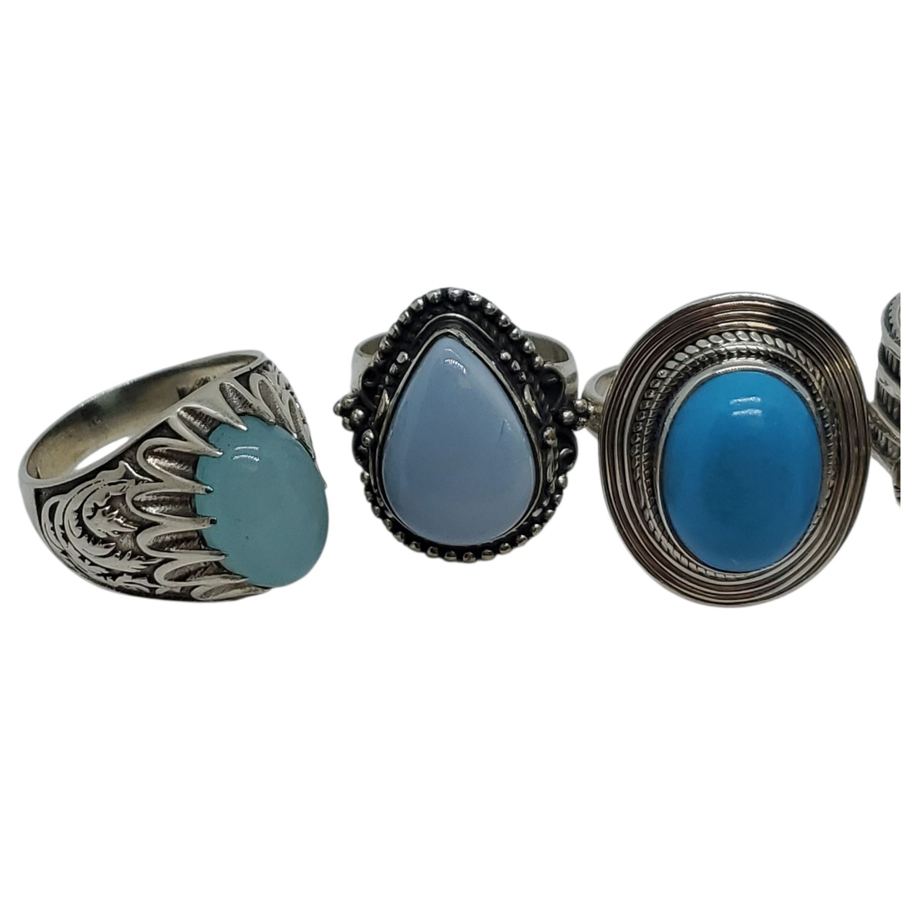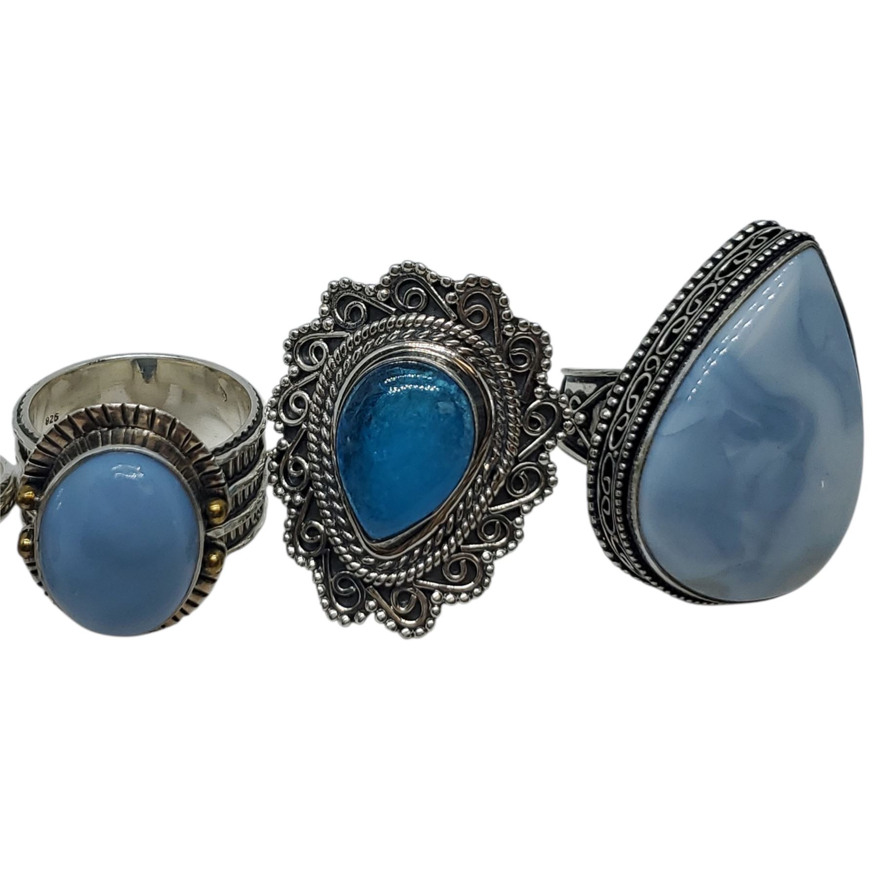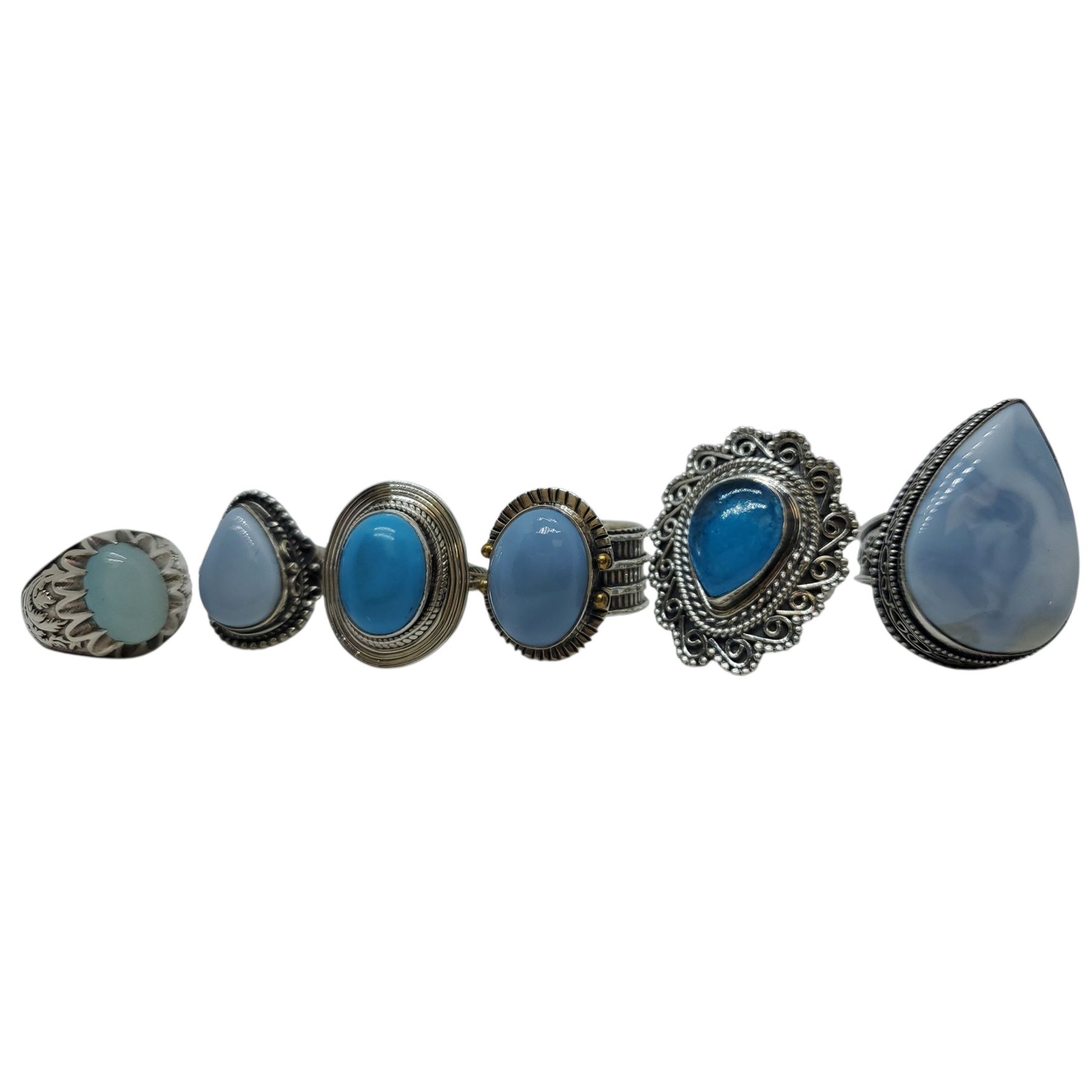 6 New Polished Larimar, Blue Lace Agate, Chalcedony & Blue Kyanite Rings in Silver Settings * all stamped .925 (longest ring is 33 mm) * Total weight: 59.6 grams