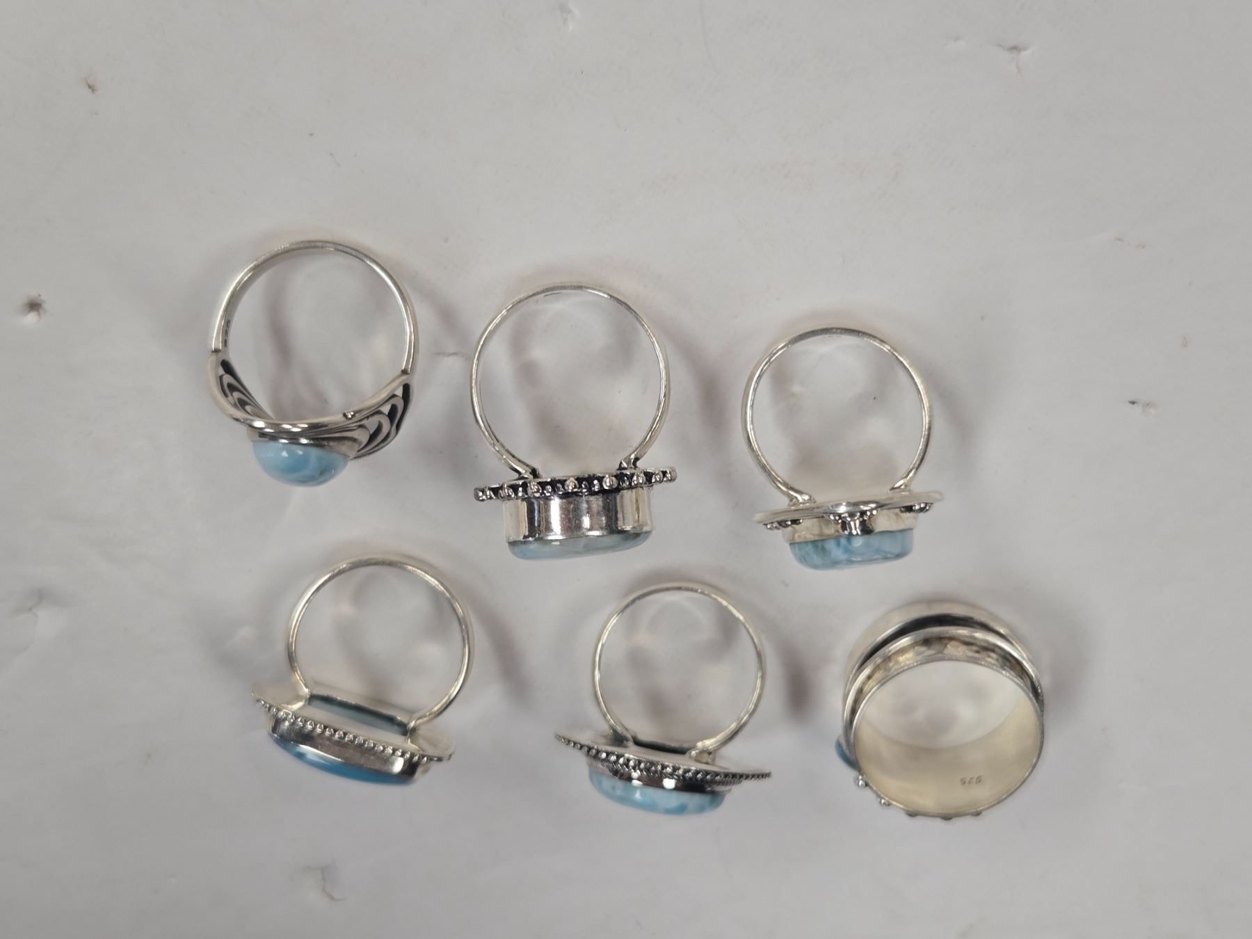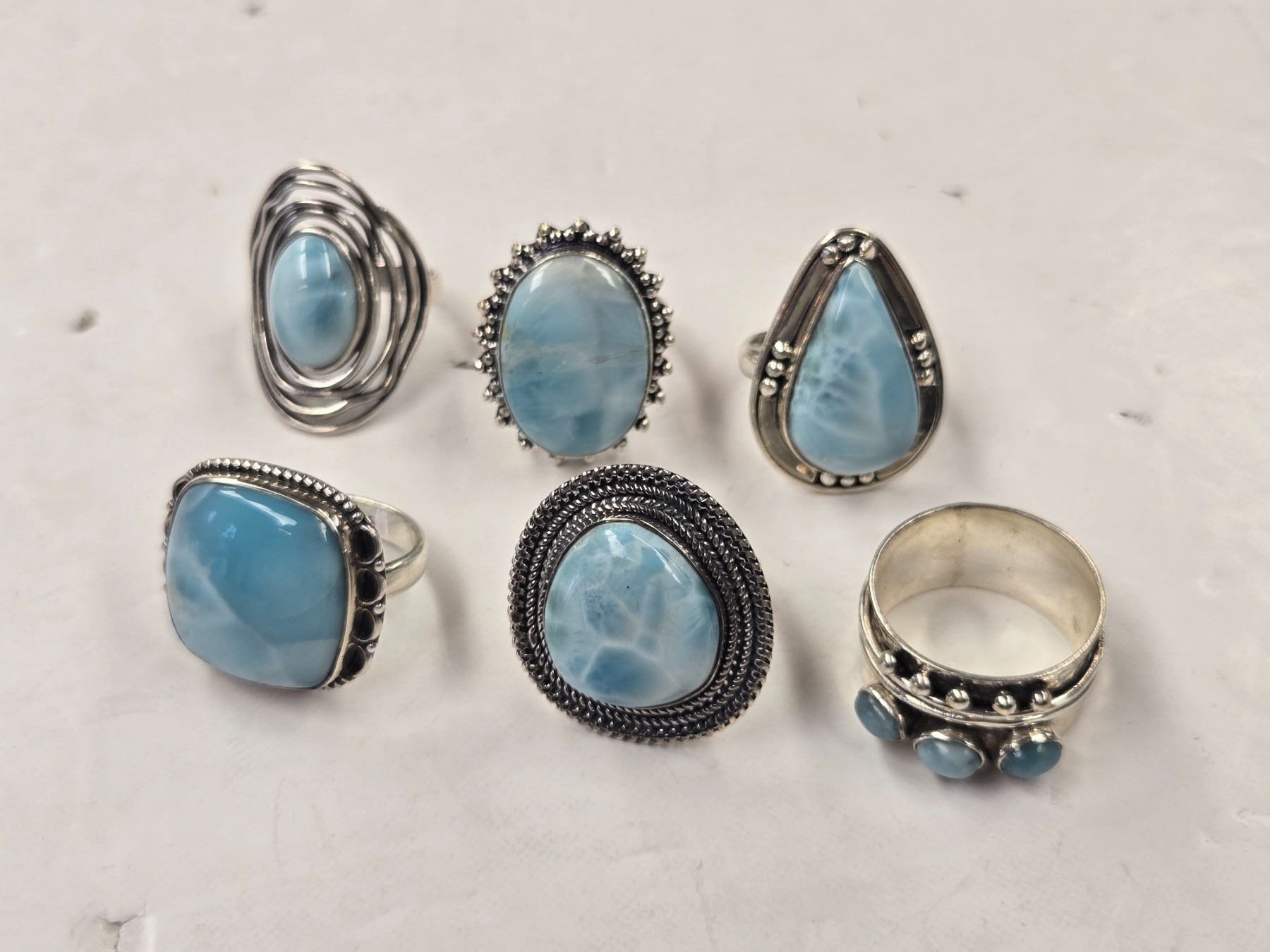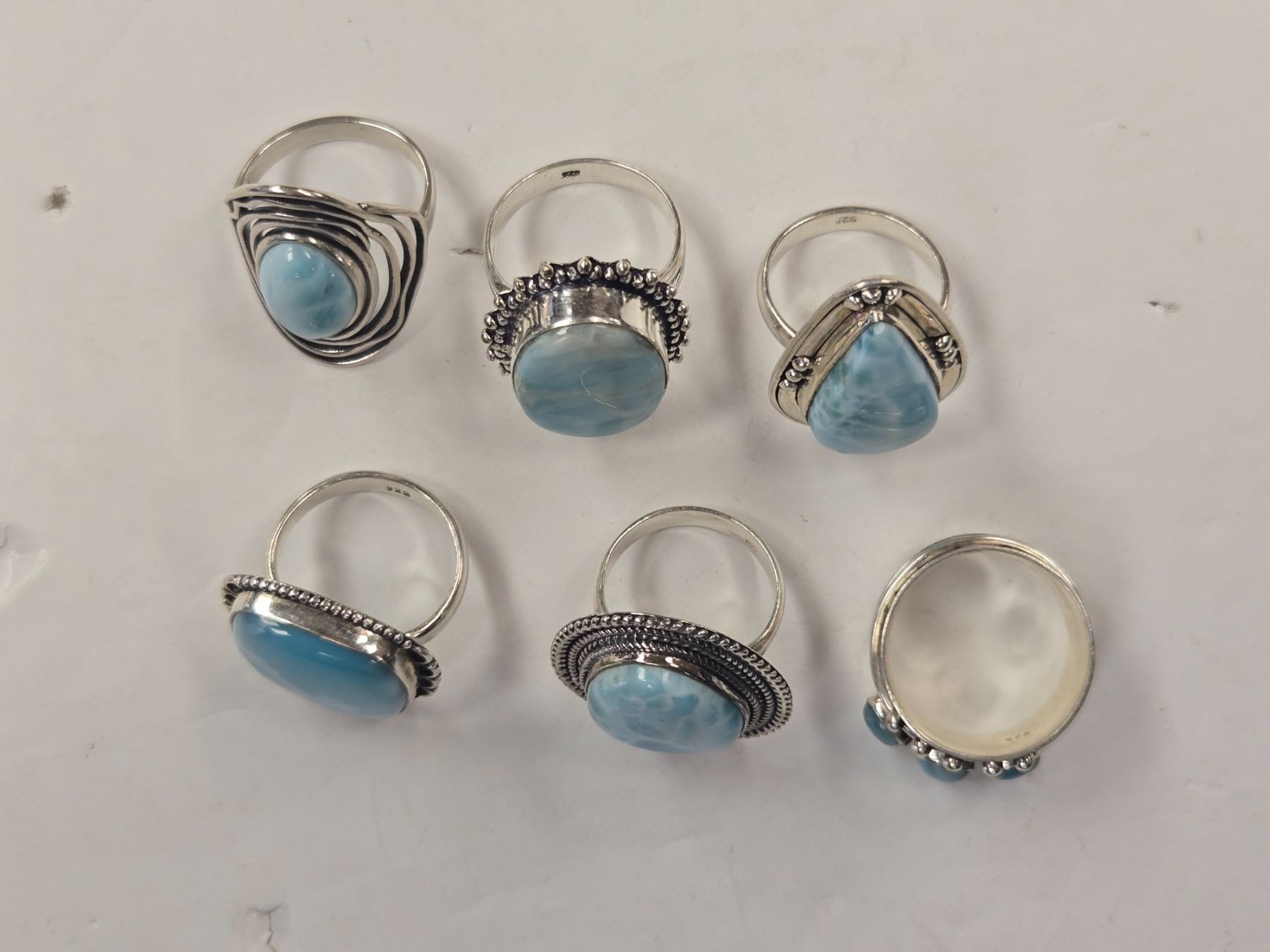 6 New Polished Larimar Stone Rings in Silver Settings - all stamped .925 - Total weight: 56.2 grams