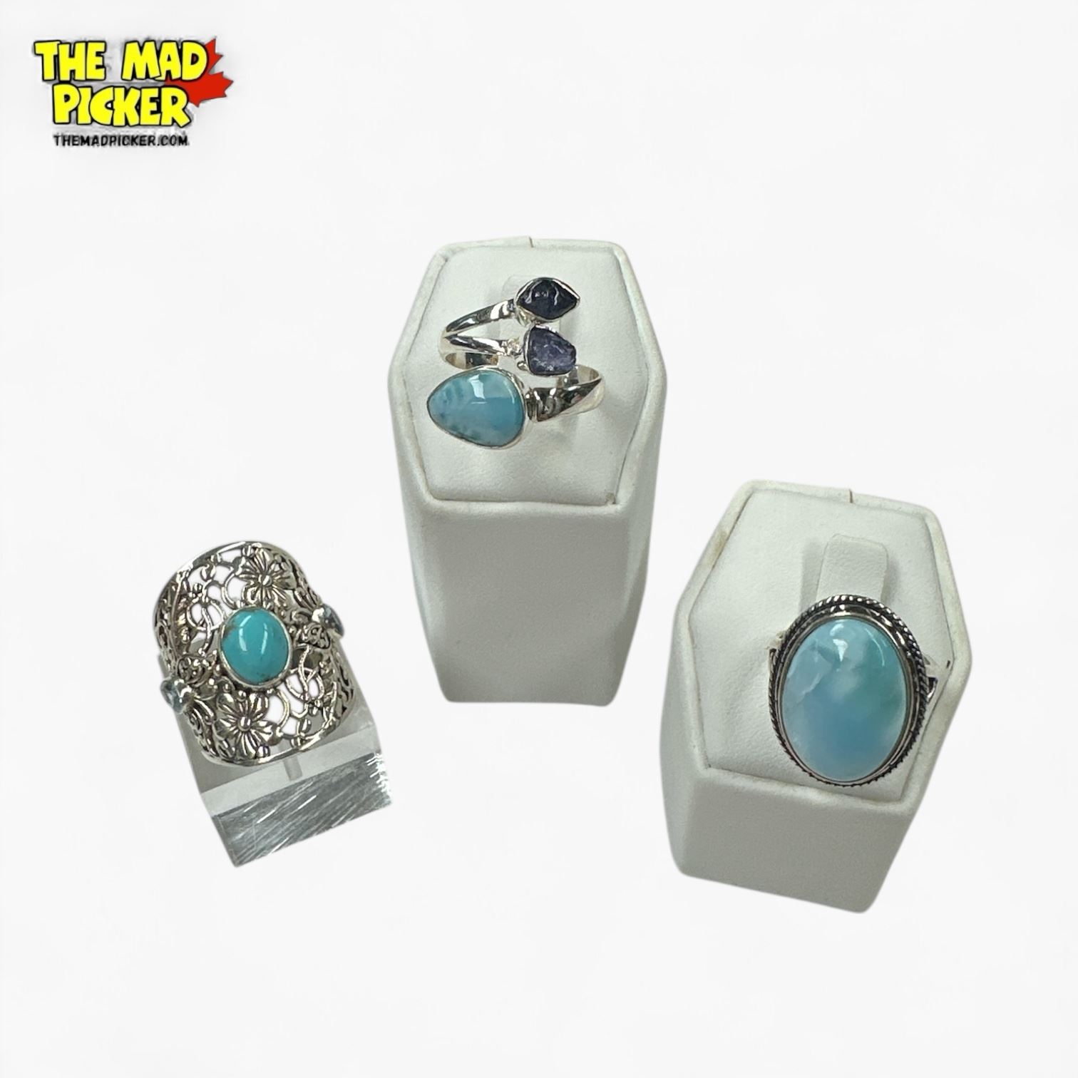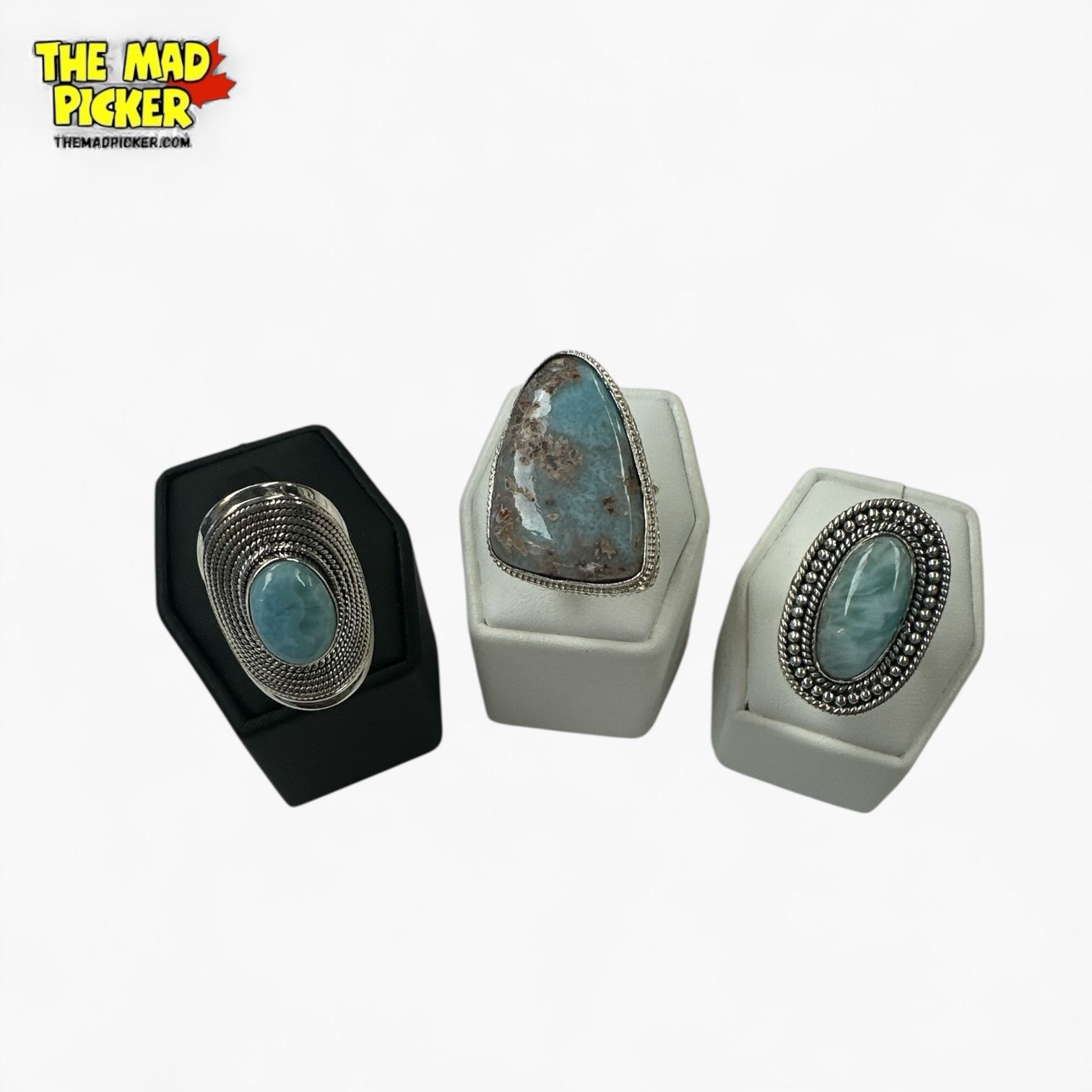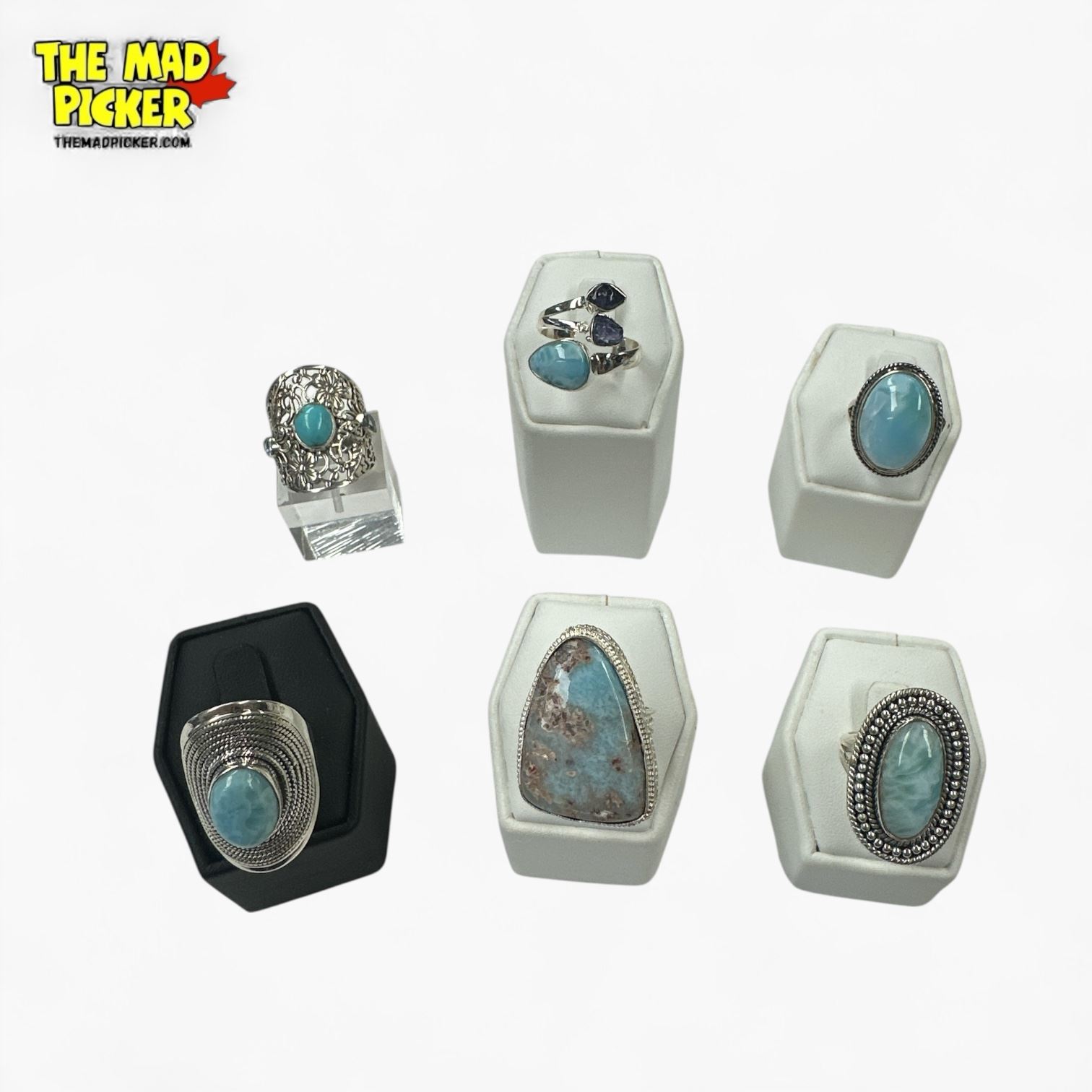 6 New Polished Larimar Stone Rings in Silver Settings (all stamped .925) Total weight: 57 grams
