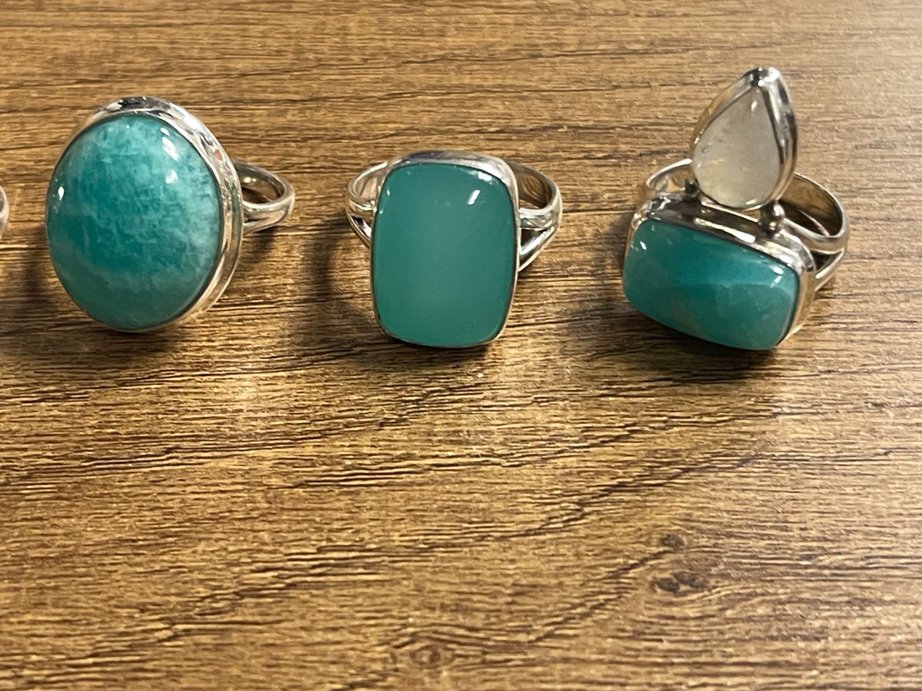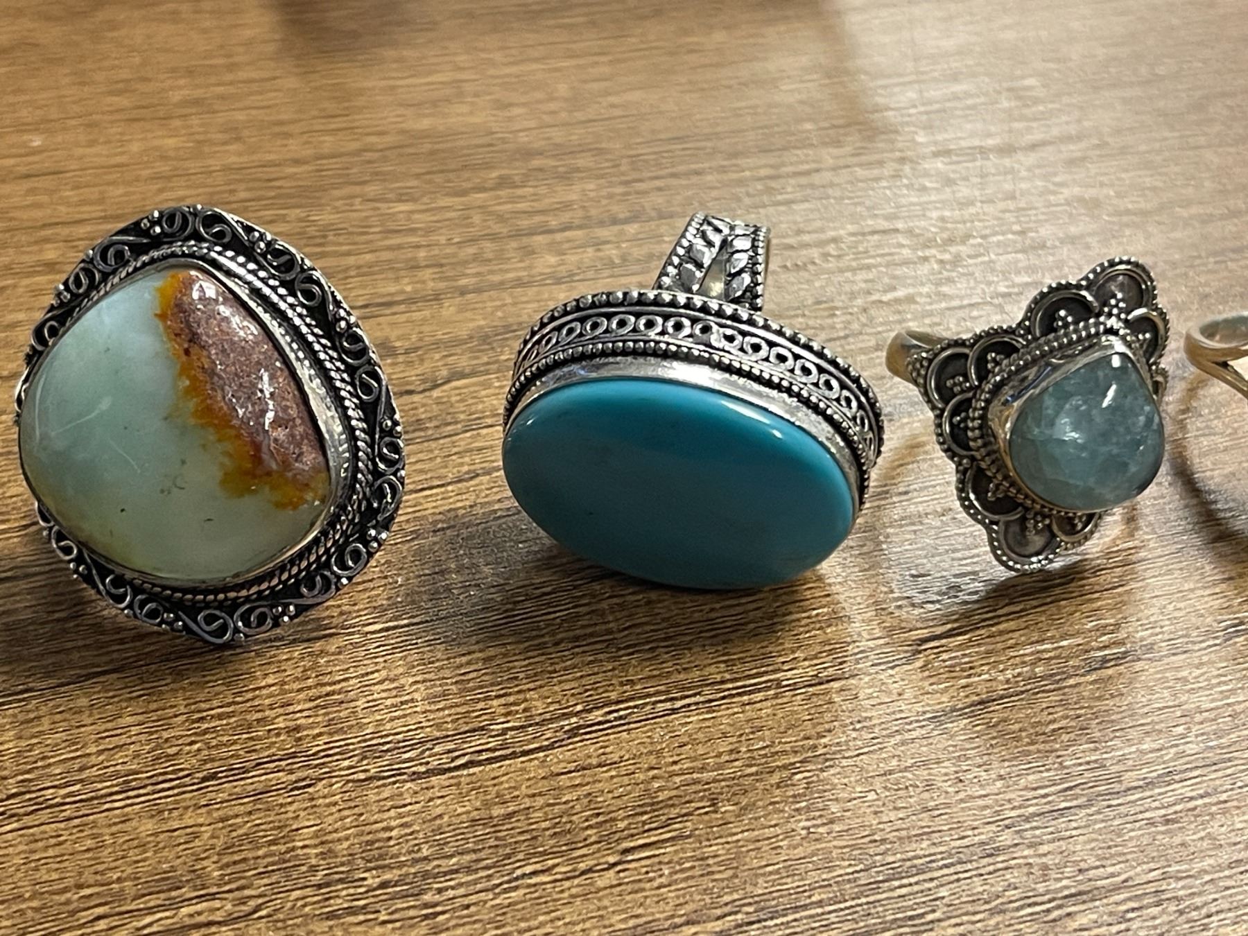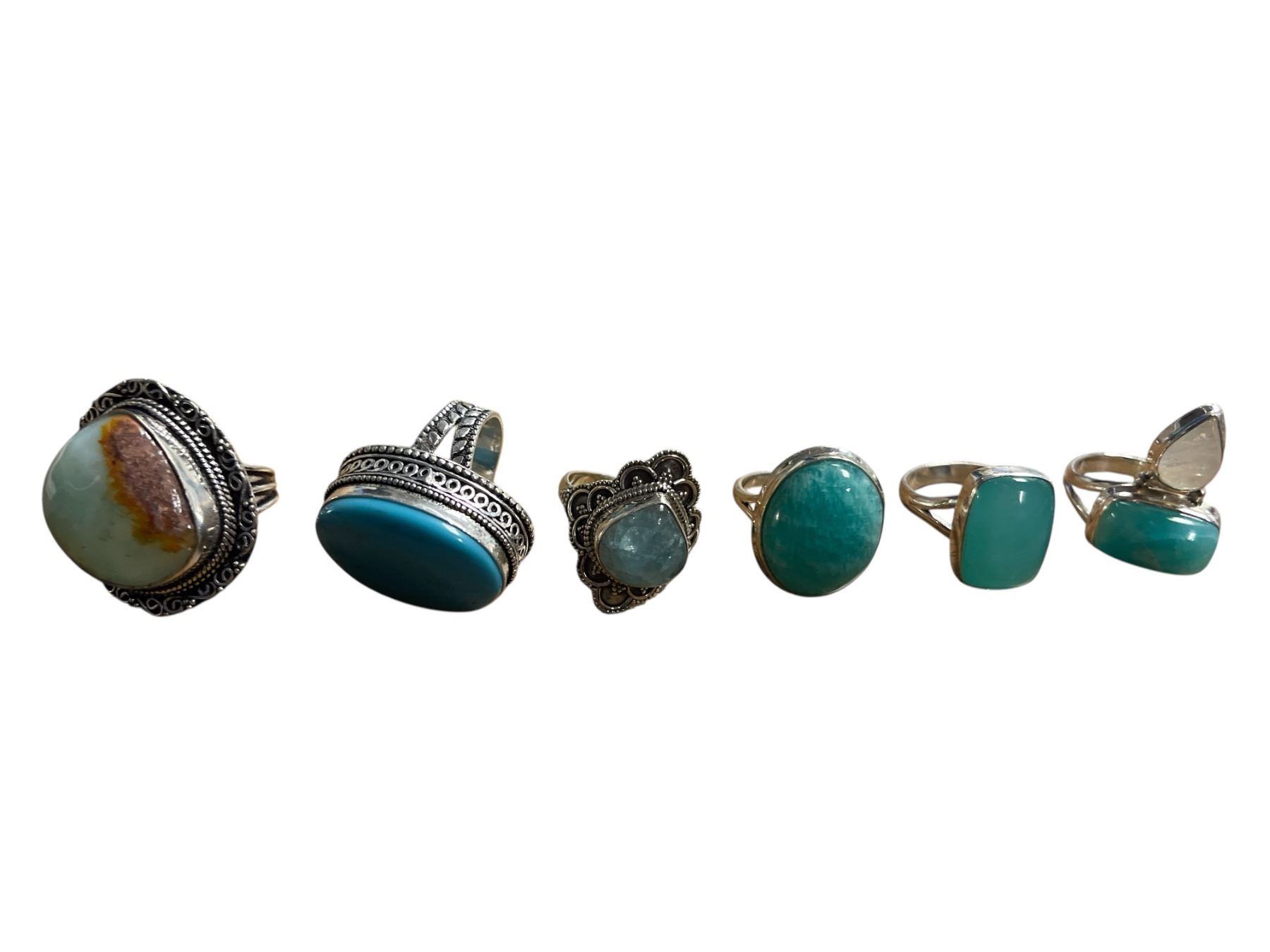 6 New Polished Natural Agate, Chalcedony, Turquoise & Larimar Stone Rings in Silver Settings - all stamped .925 (longest ring is 31 mm) Total weight: 55.8 grams