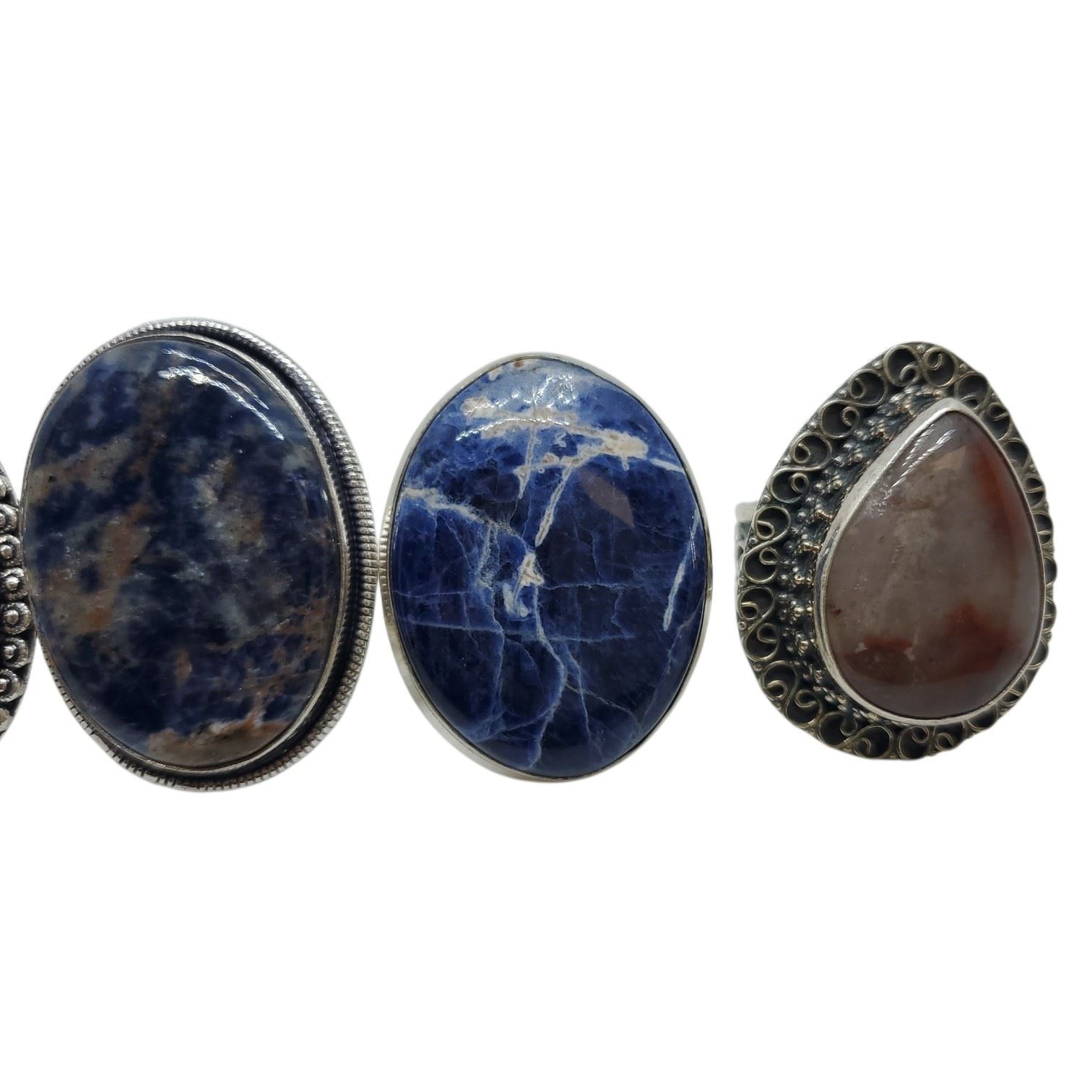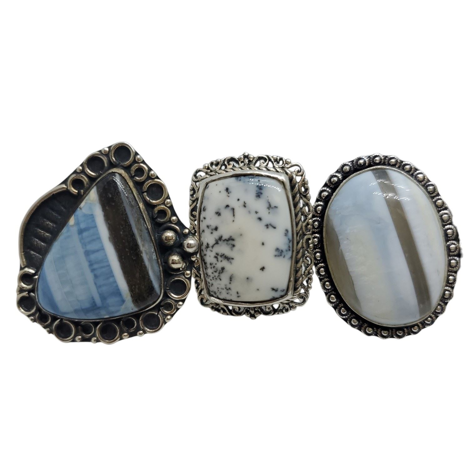 6 New Polished Natural Agate Rings in Silver Settings (Dendrite, Crazy Lace, Sodalite& More) * all stamped .925 (longest ring is 38 mm) * Total weight: 80 grams