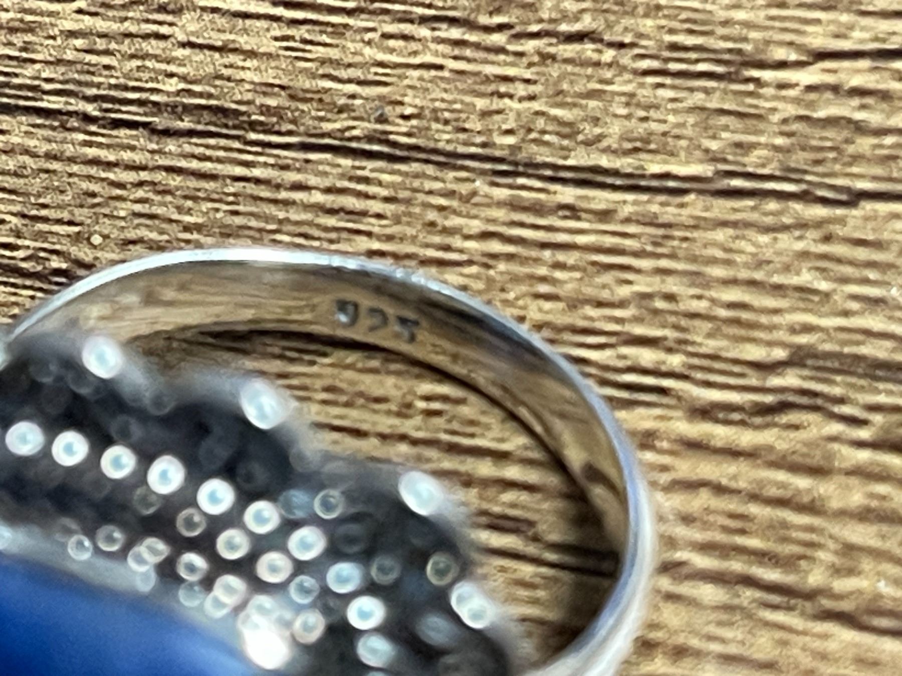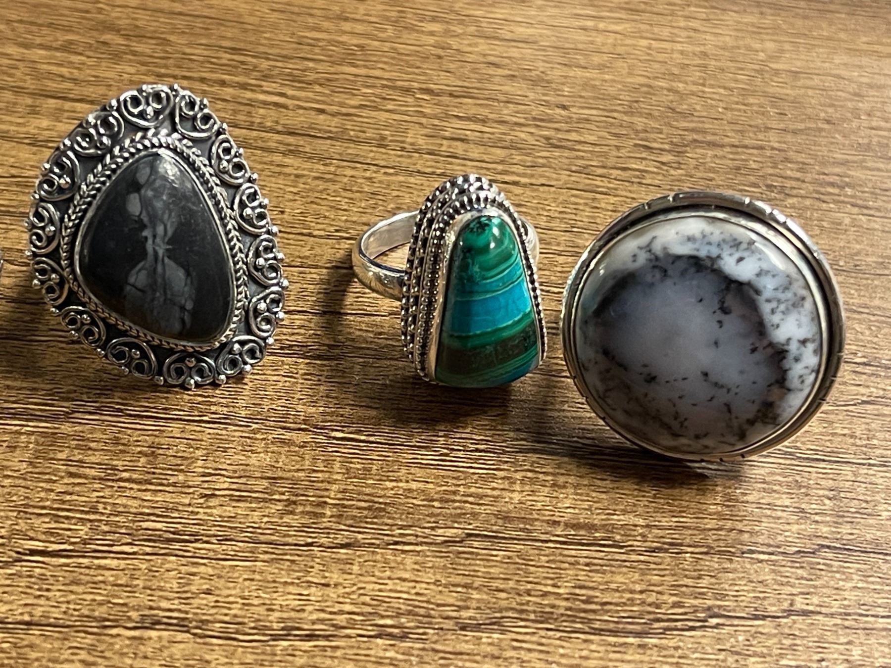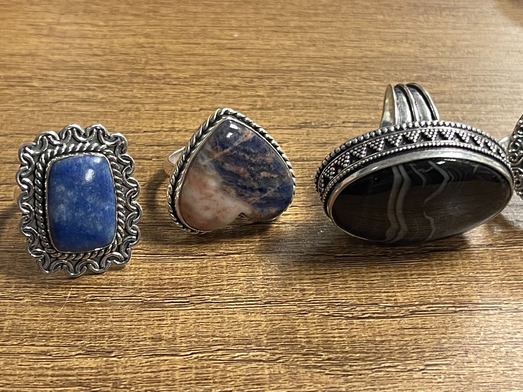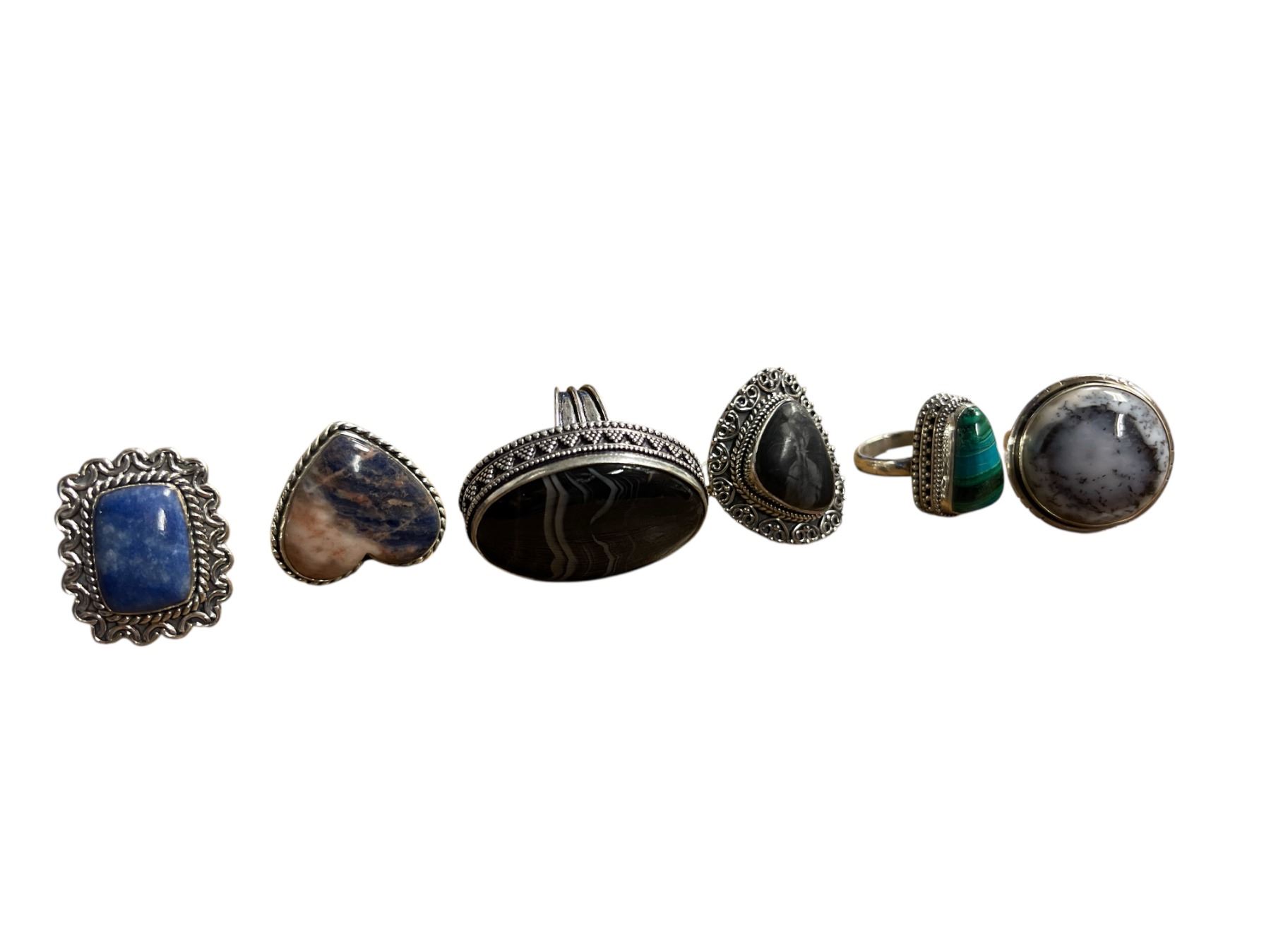 6 New Polished Natural Agate & Stone Rings in Silver Settings - all stamped .925 (longest ring is 38 mm) Total weight: 64.2 grams
