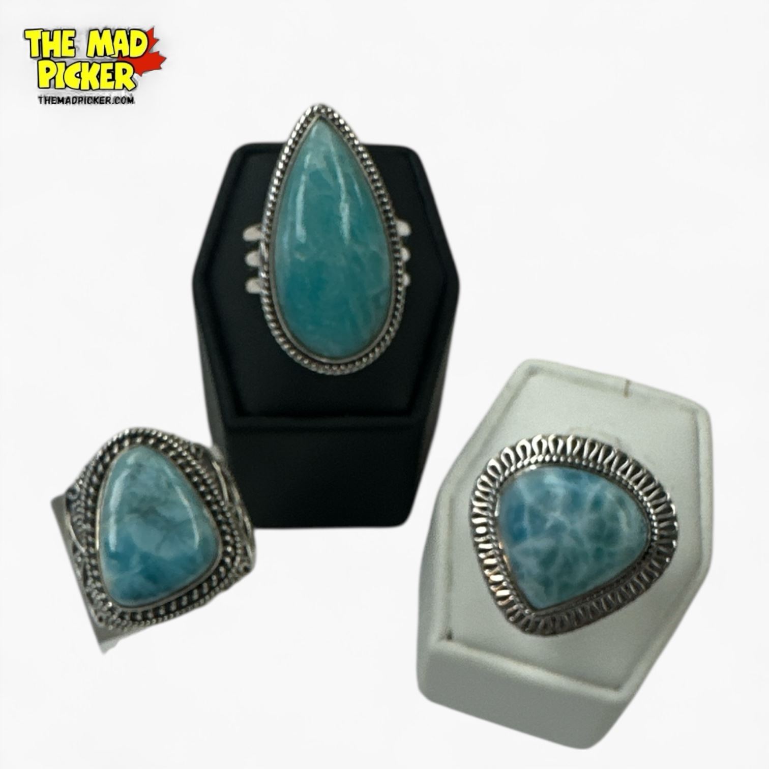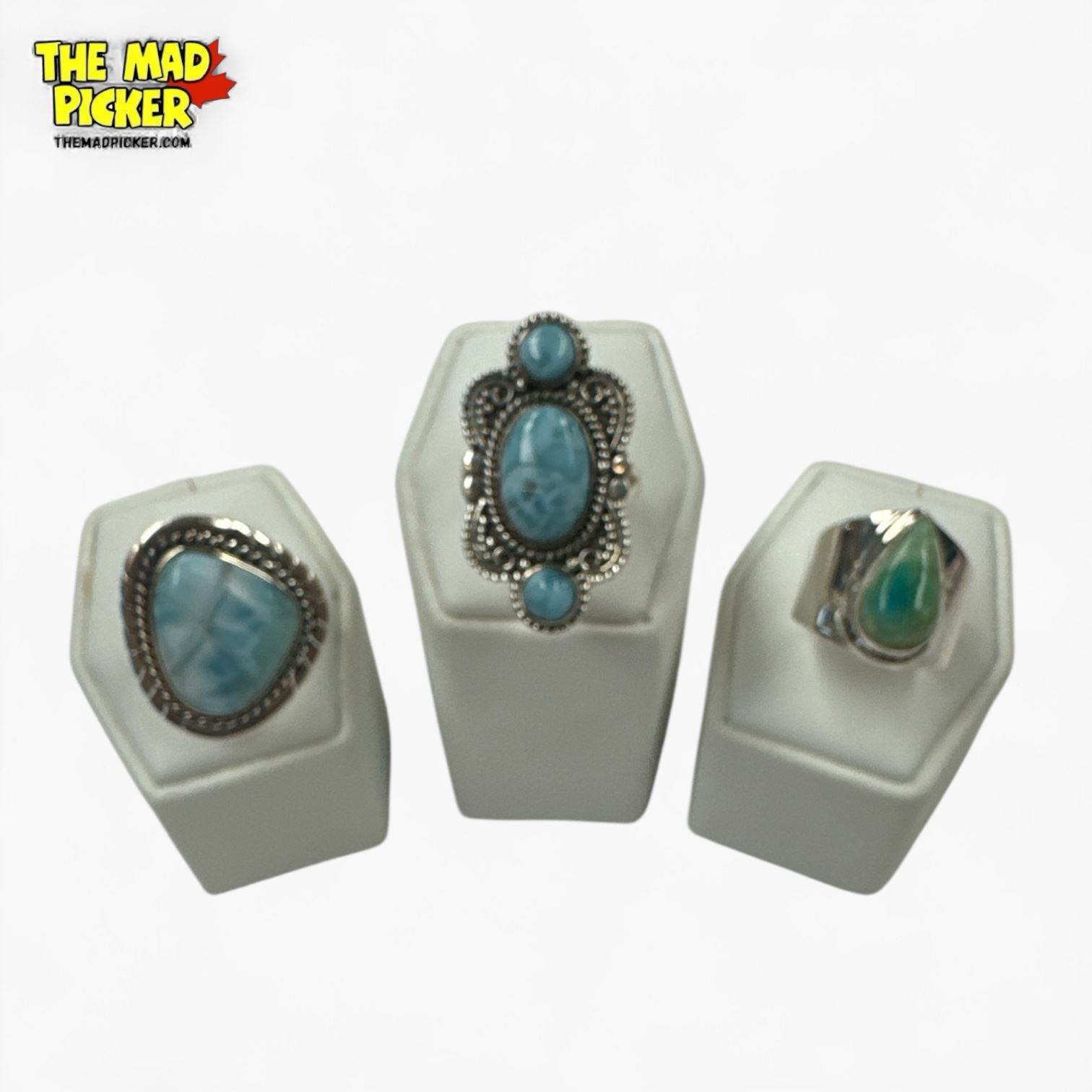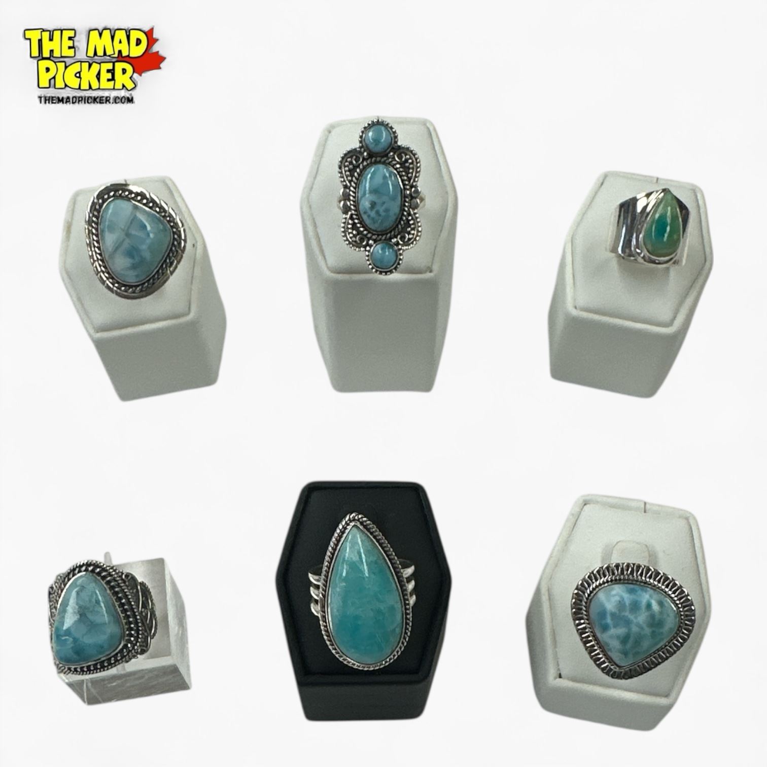 6 New Polished Natural Blue Larimar Stone Rings in Silver Settings (all stamped .925) Total weight: 55.7 grams