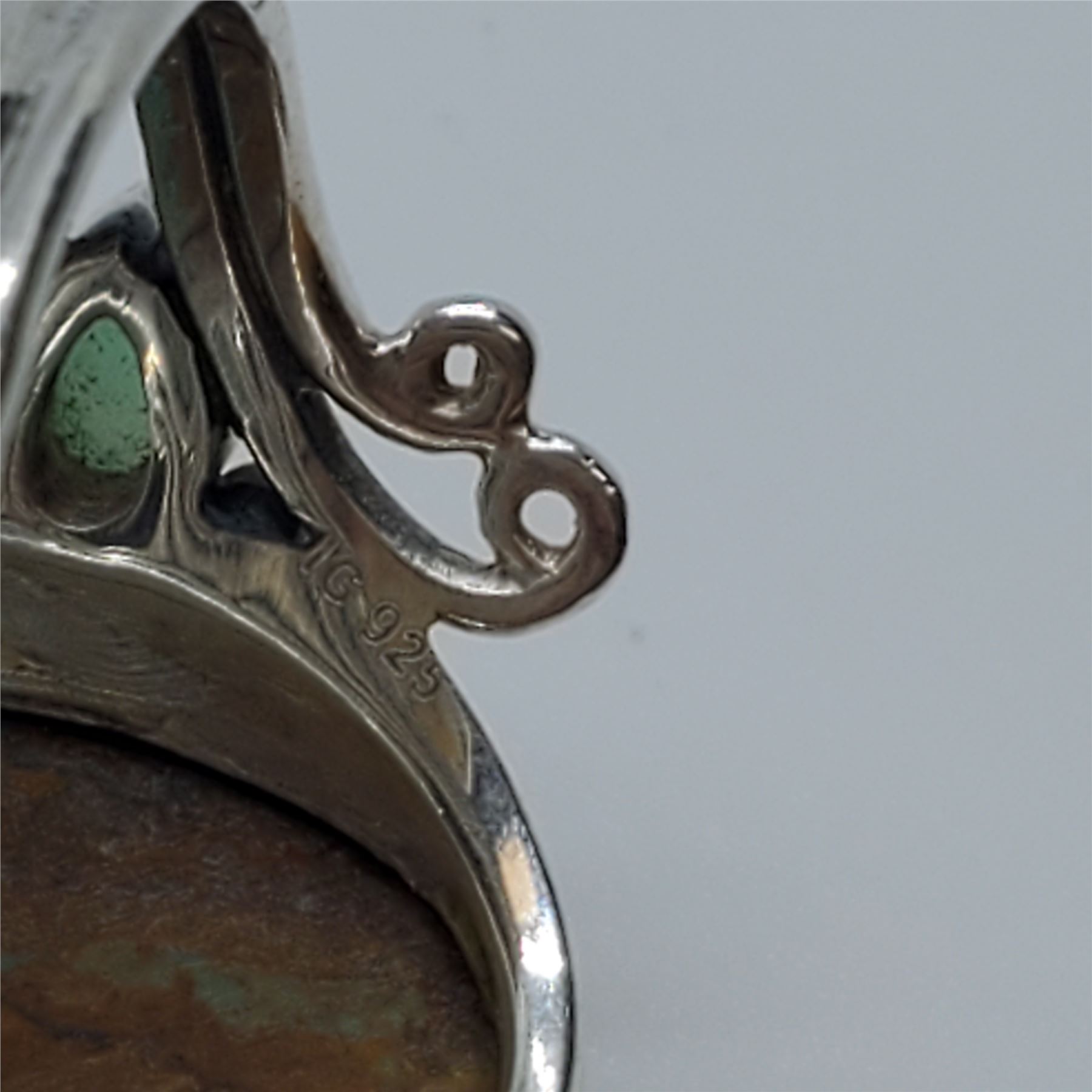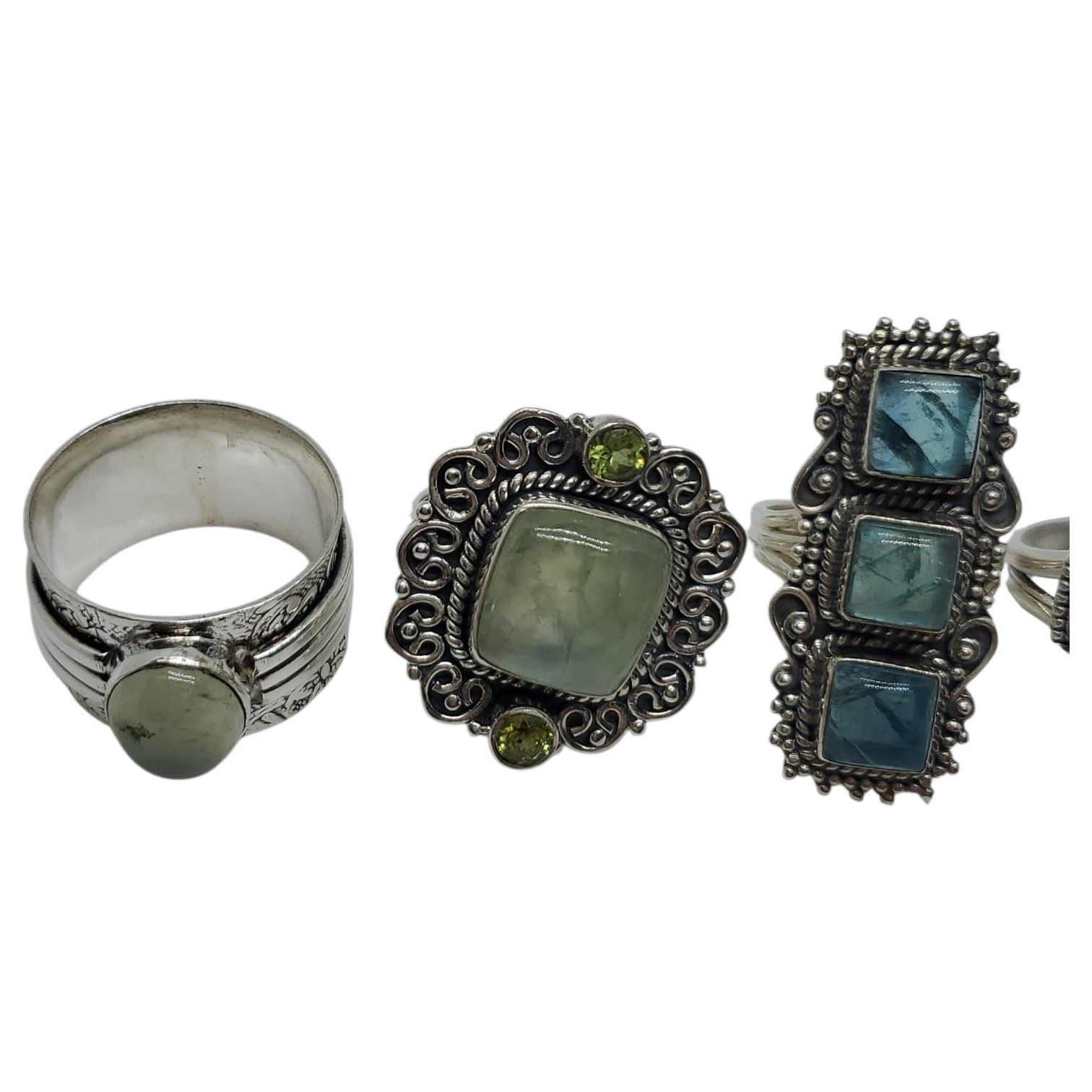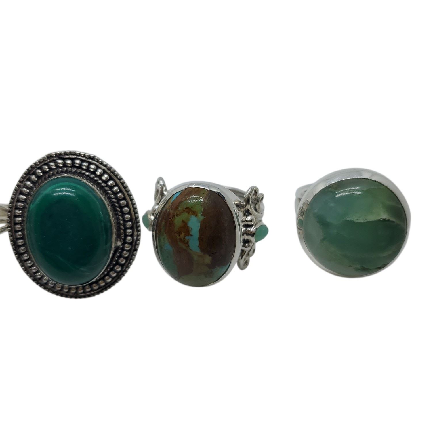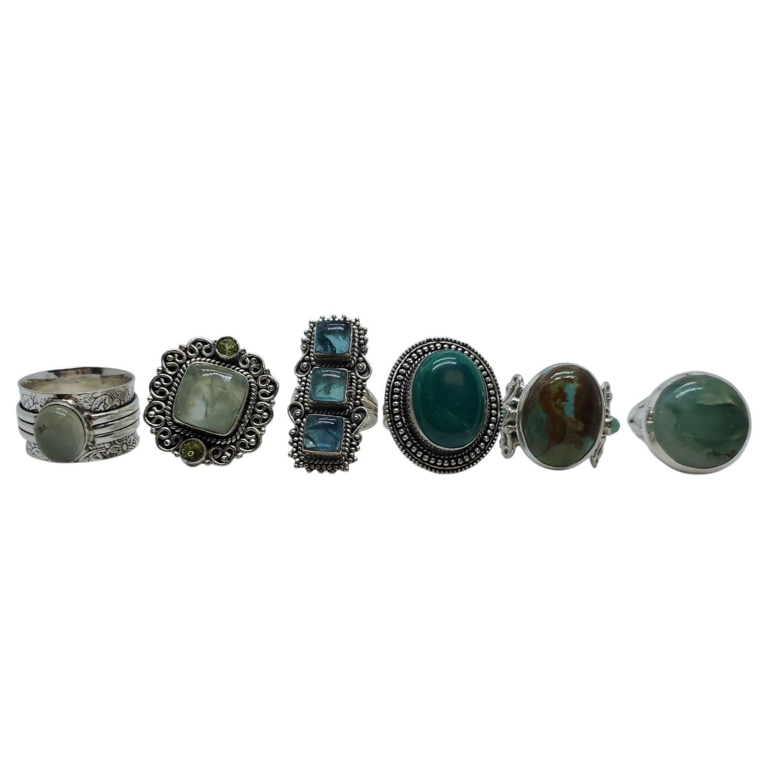 6 New Polished Natural Green Agate, Jade, Green Turquoise & Prehnite Rings in Silver Settings * all stamped .925 (longest ring is 35 mm) * Total weight: 58.2 grams