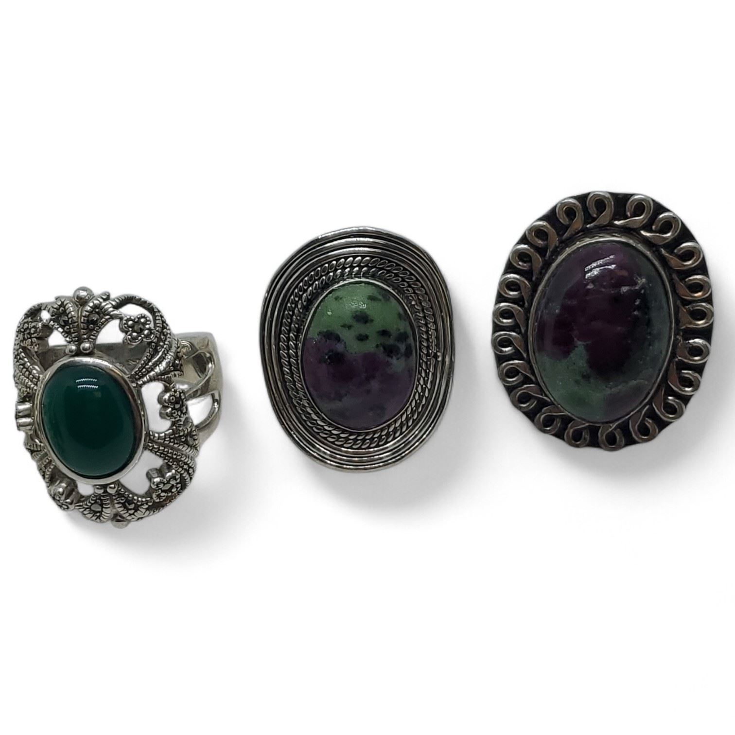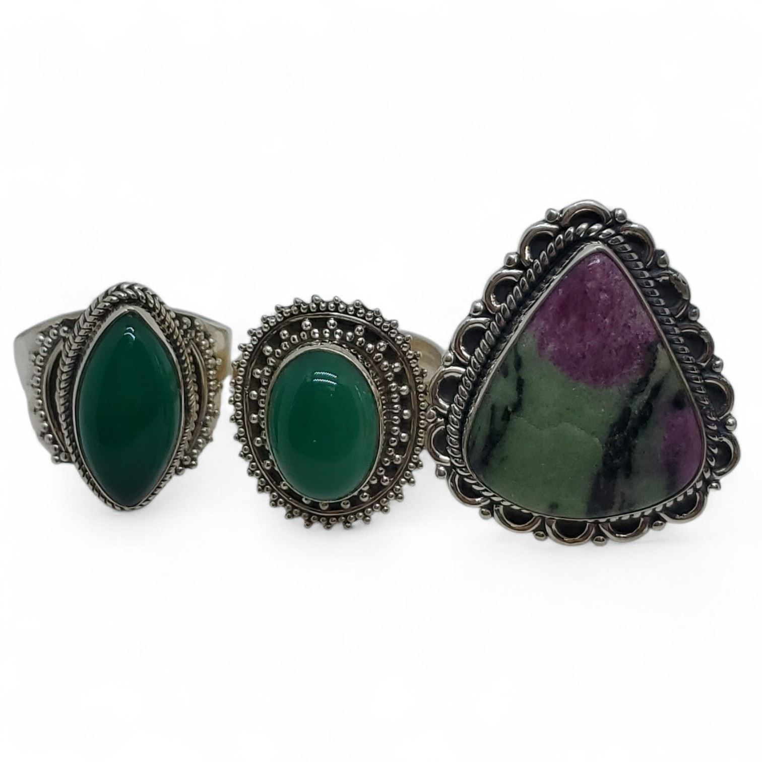 6 New Polished Natural Green Agate & Ruby Zoisite Rings in Silver Settings * all stamped .925 (longest ring is 31 mm) * Total weight: 47.9 grams