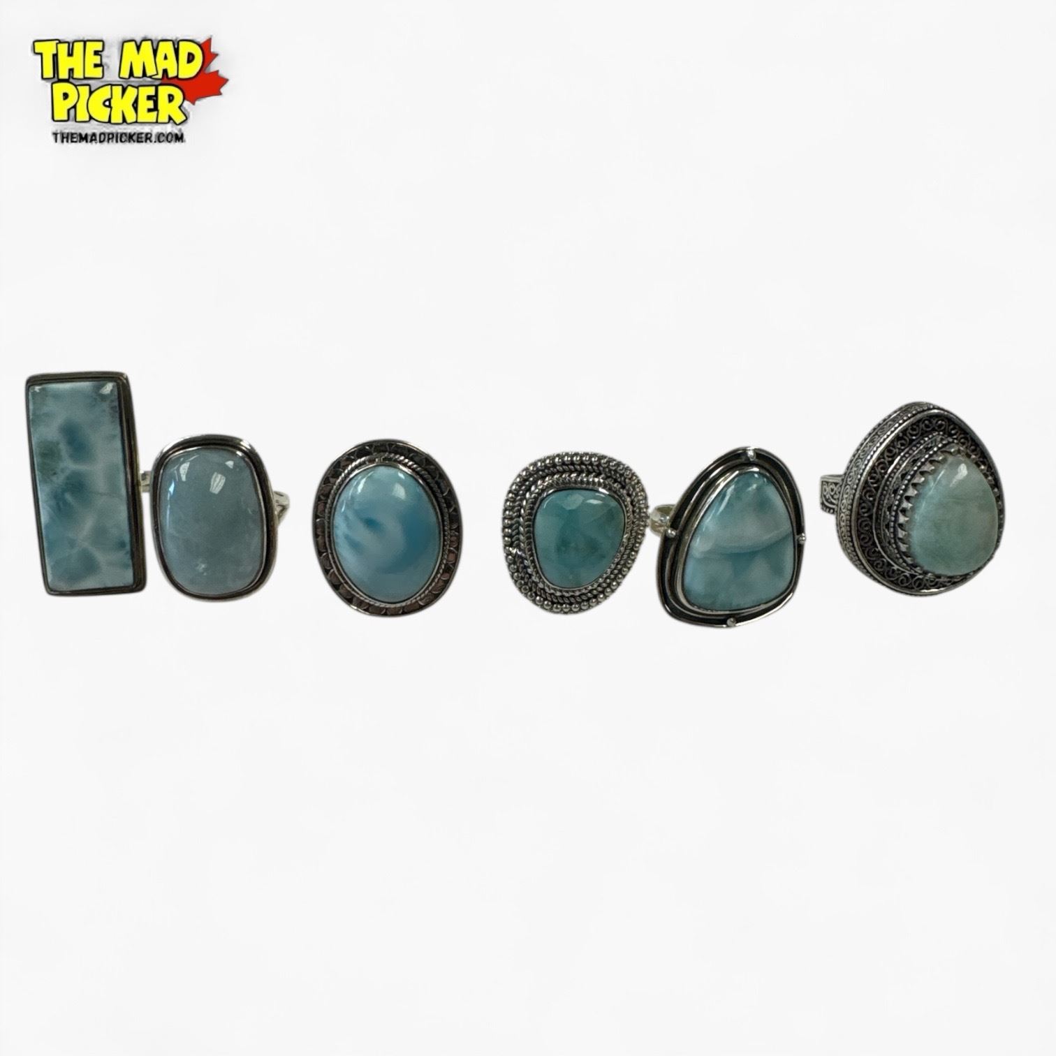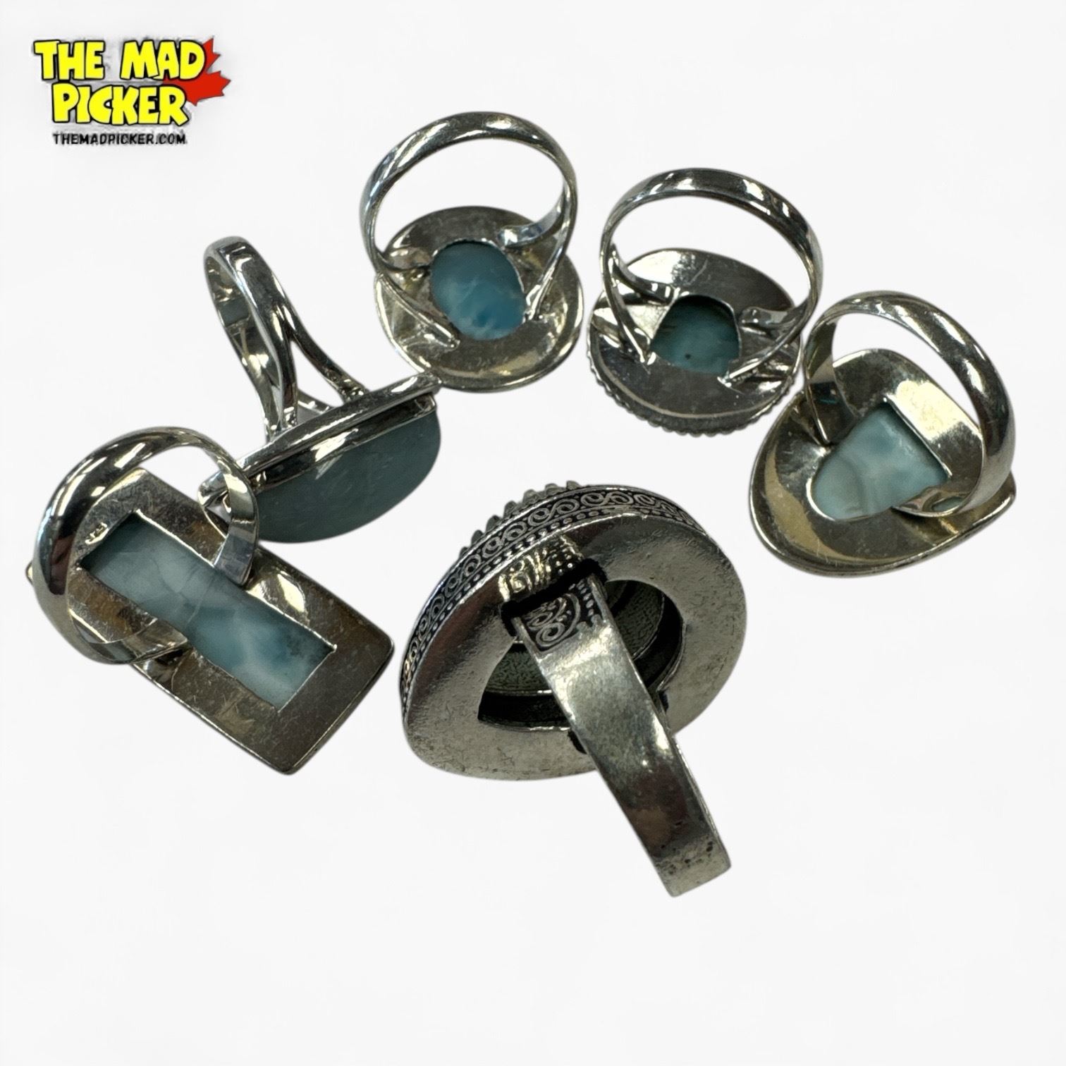 6 New Polished Natural Larimar (Dolphin Stone) Rings in Silver Settings (all stamped .925) * Total weight: 65 grams
