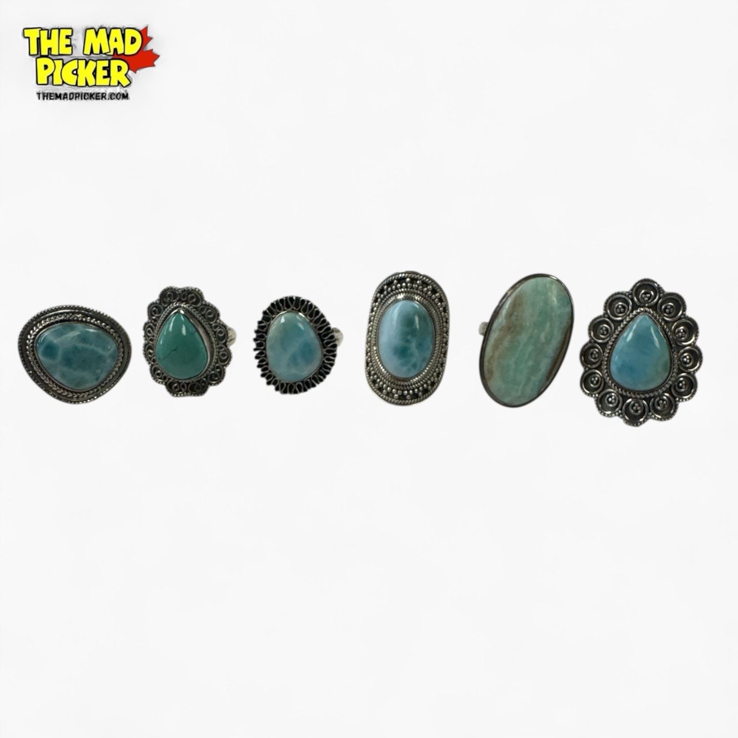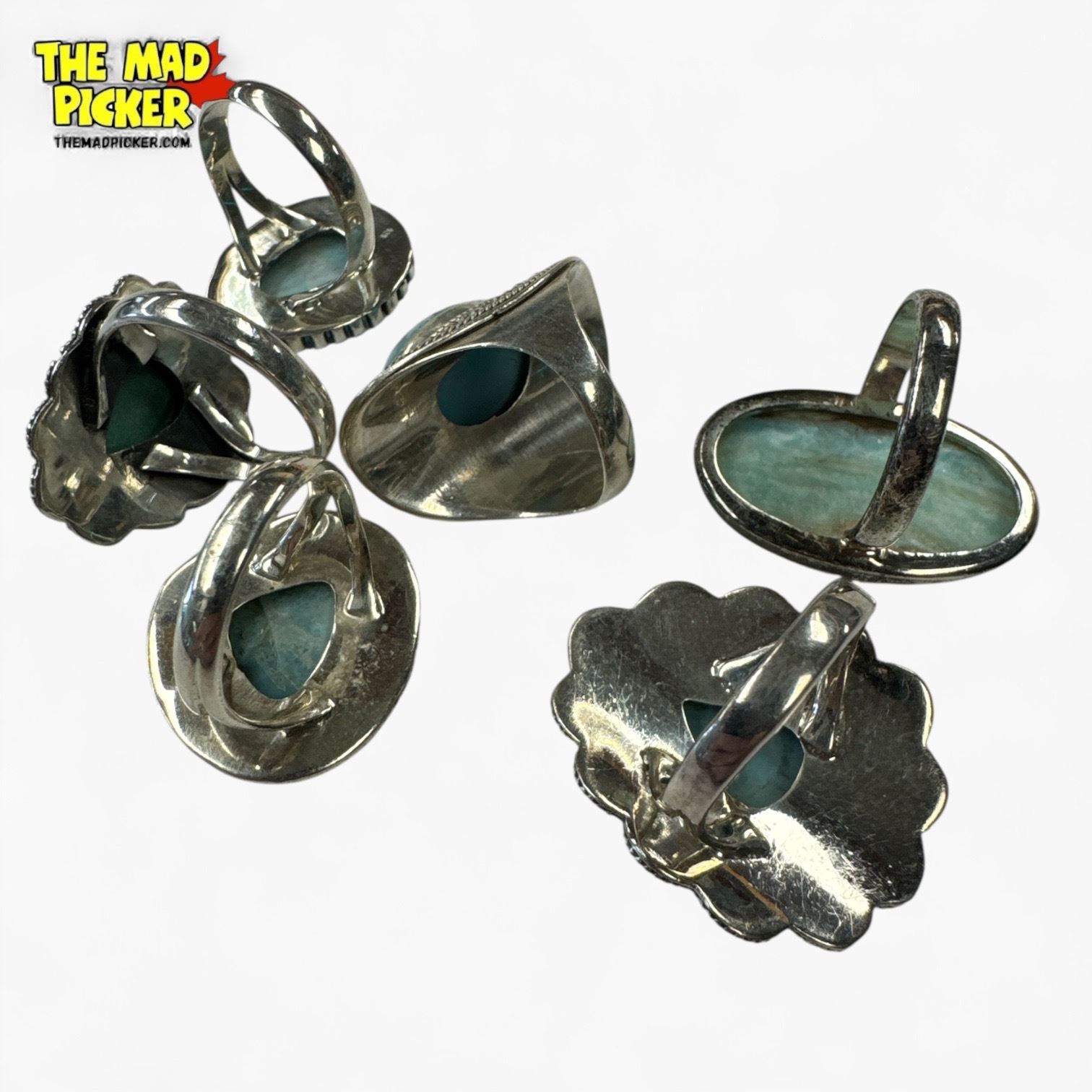 6 New Polished Natural Larimar (Dolphin Stone) Rings in Silver Settings (all stamped .925) * Total weight: 59.7 grams