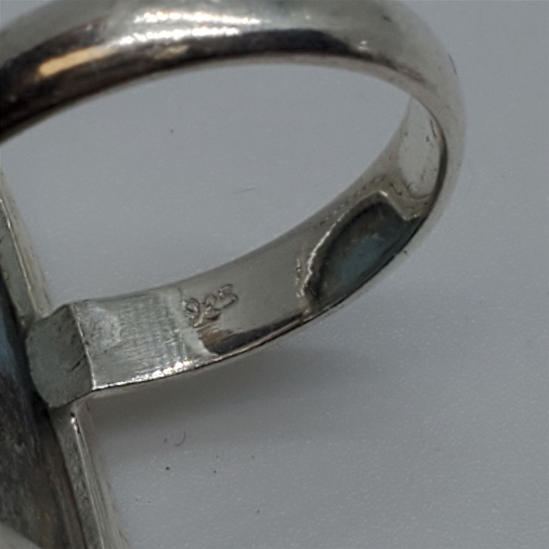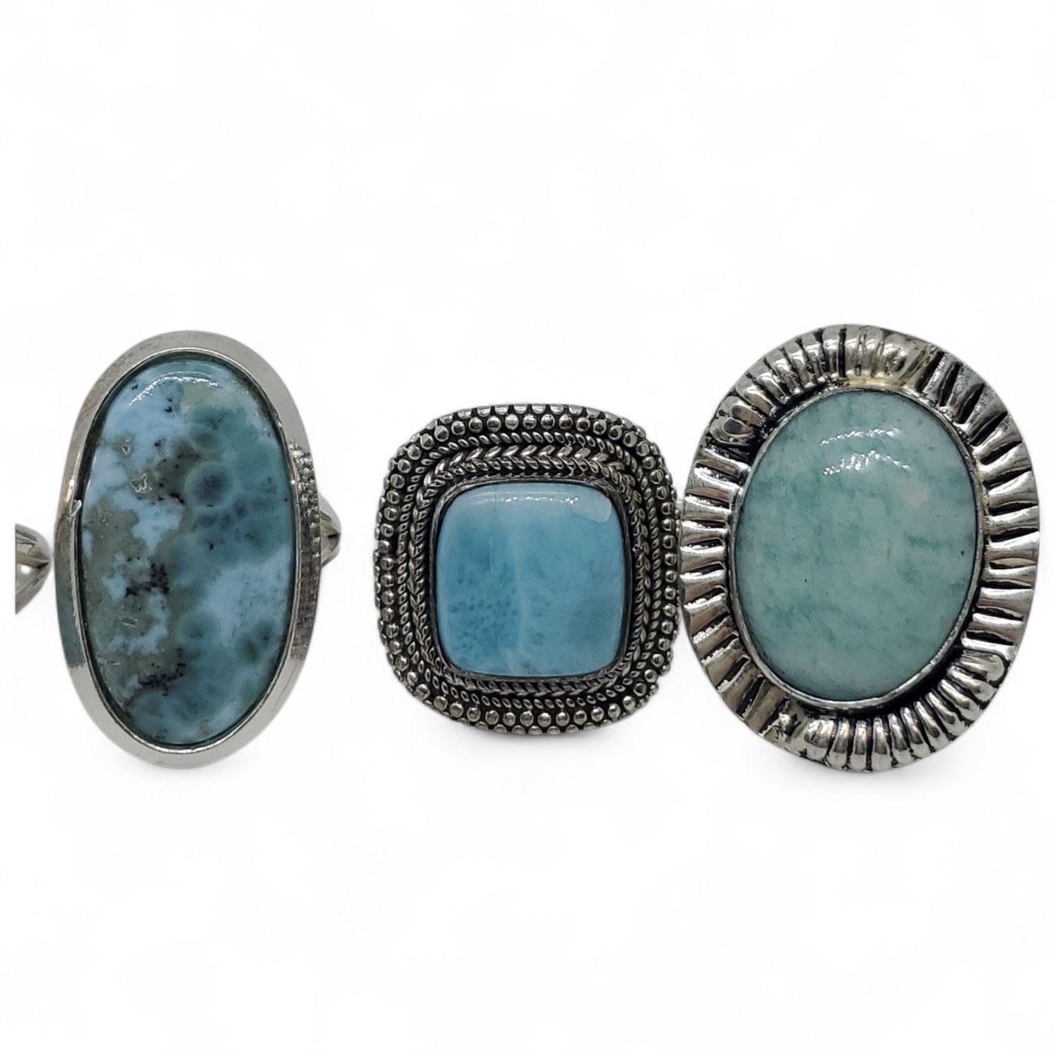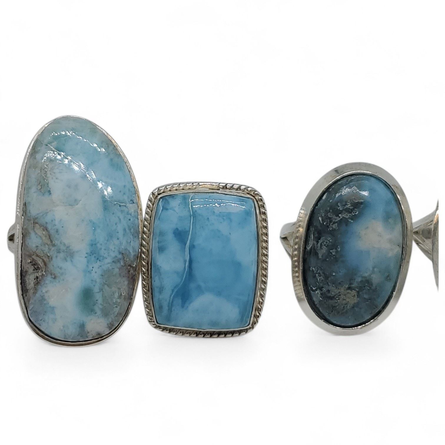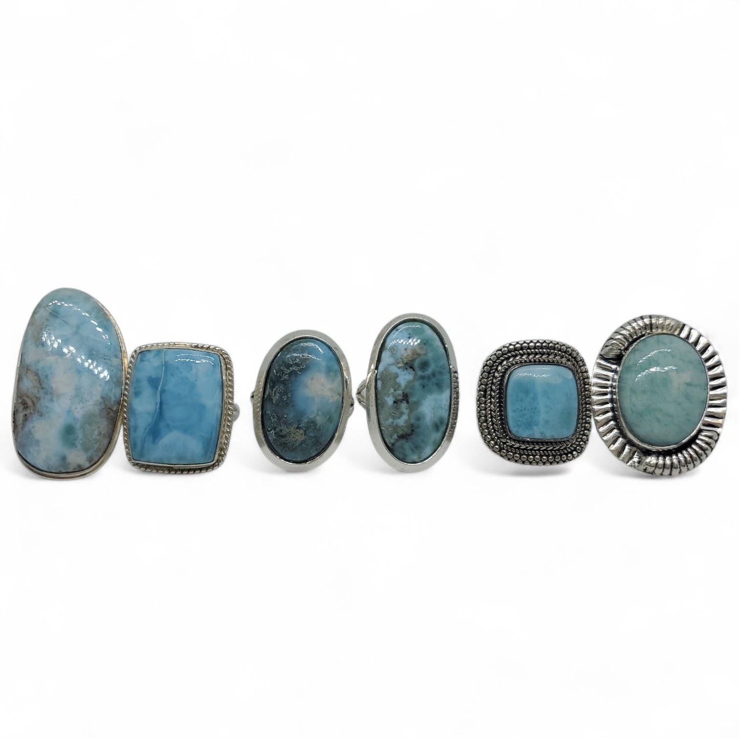 6 New Polished Natural Larimar Rings in Silver Settings * all stamped .925 (longest ring is 36 mm) * Total weight: 63 grams