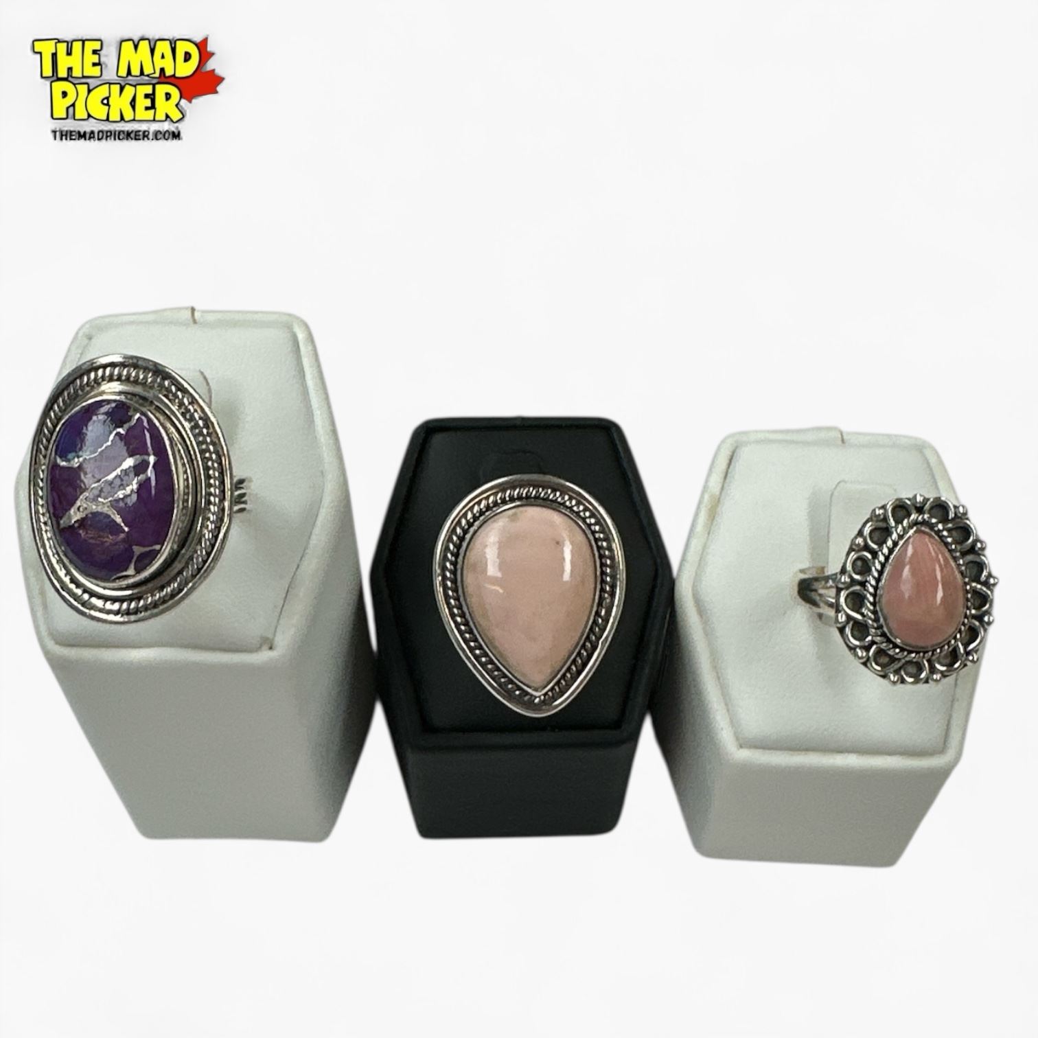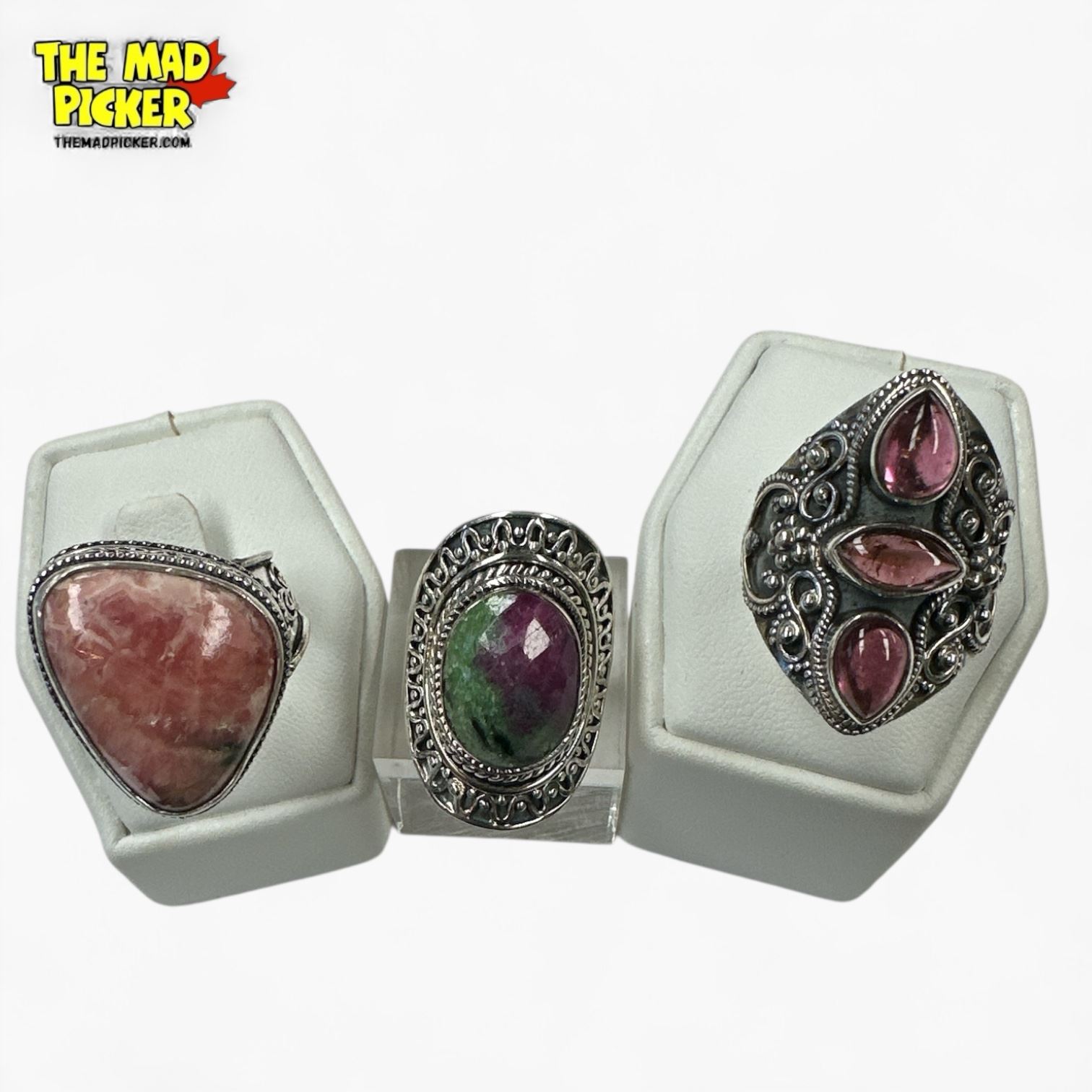 6 New Polished Natural Stone Cabochon Rings in Silver Settings - Rhodonite, Garnet, Watermelon Agate and Andean Opal (all stamped .925) Total weight: 54.7 grams