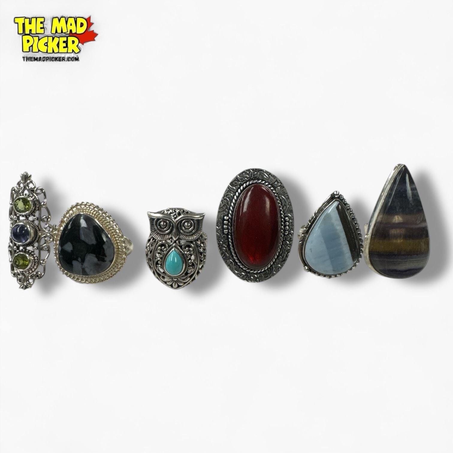 6 New Polished Natural Stone Rings in Silver Settings - all marked .925 (Fluorite, Larimar, Owyhee Opal, Iron Tiger Eye, an Peridot) Total weight: 75.7 grams