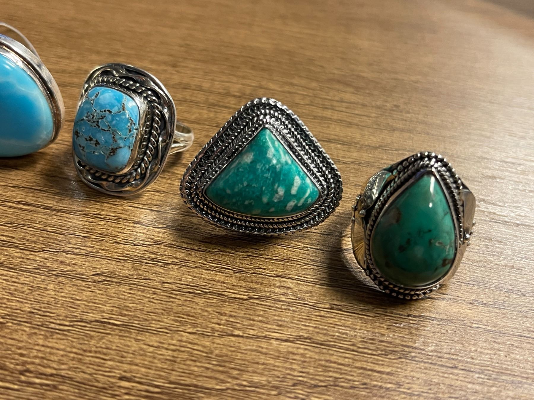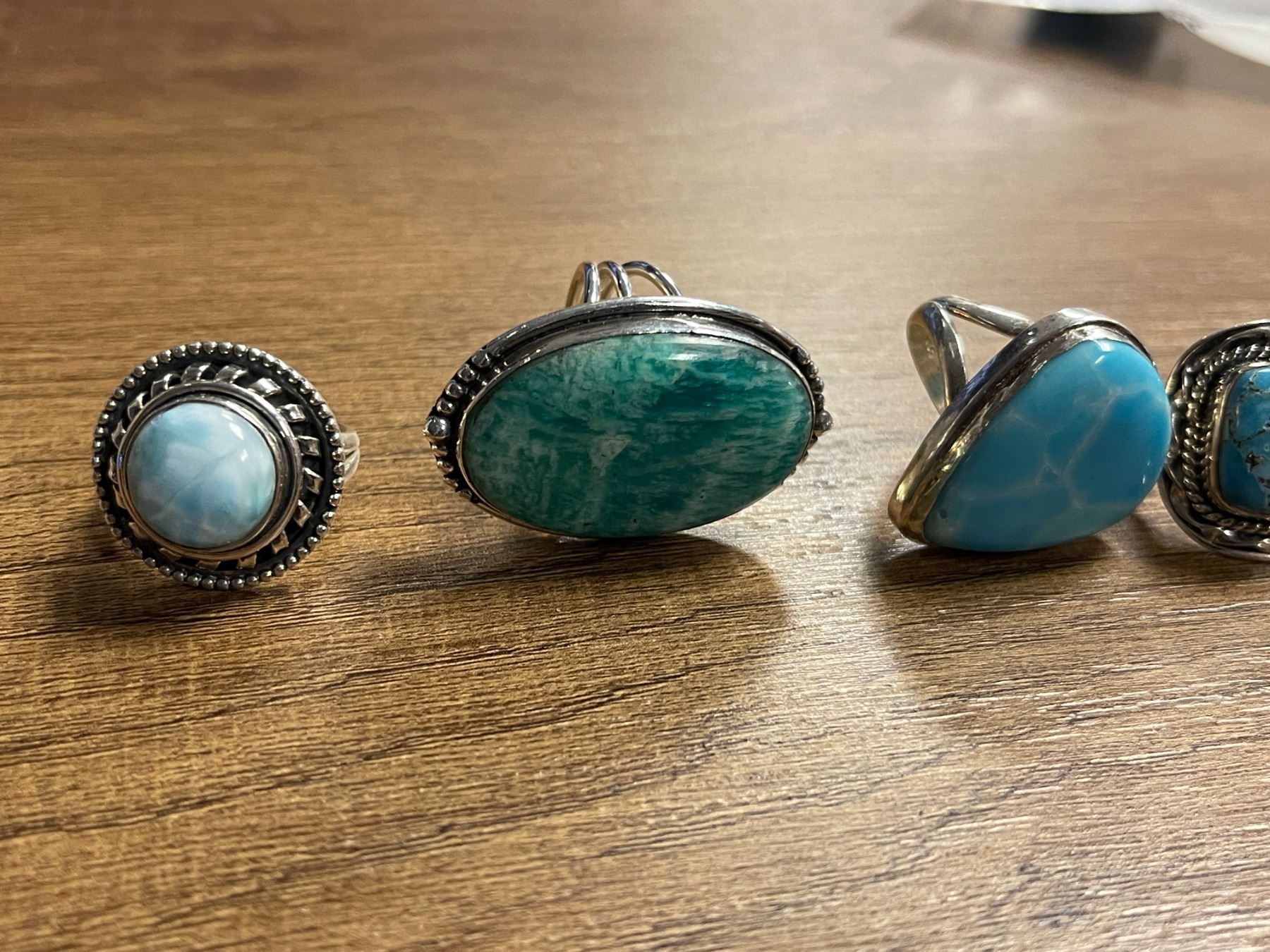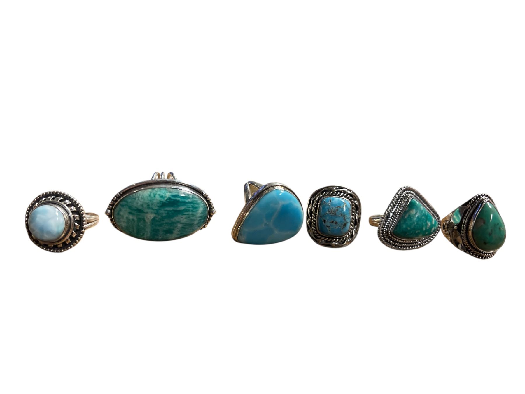 6 New Polished Natural Turquoise, Larimar and Amazonite Rings in Silver Settings - all stamped .925 (longest ring is 41 mm) Total weight: 65.1 grams