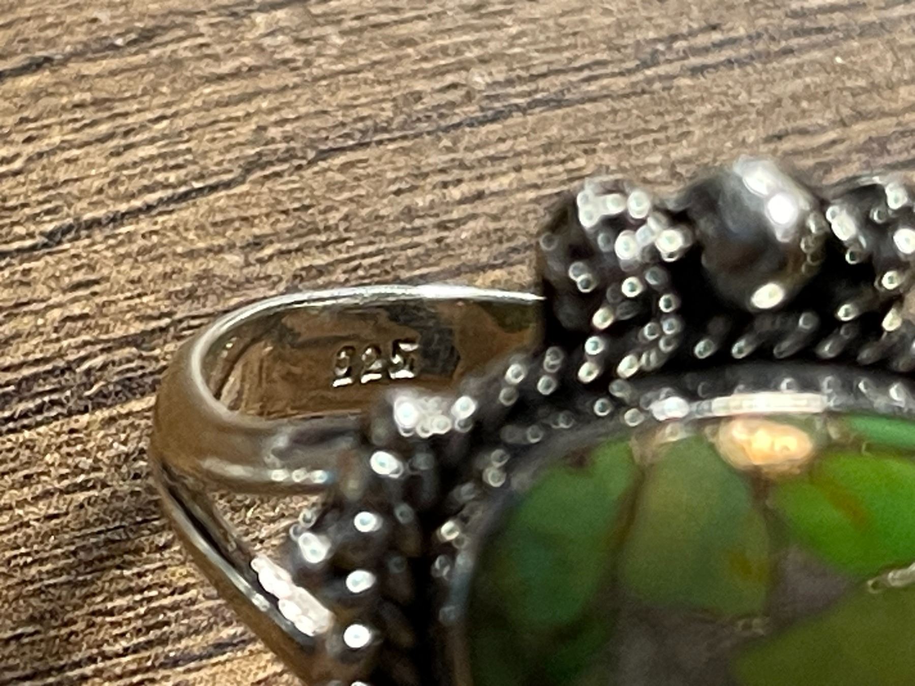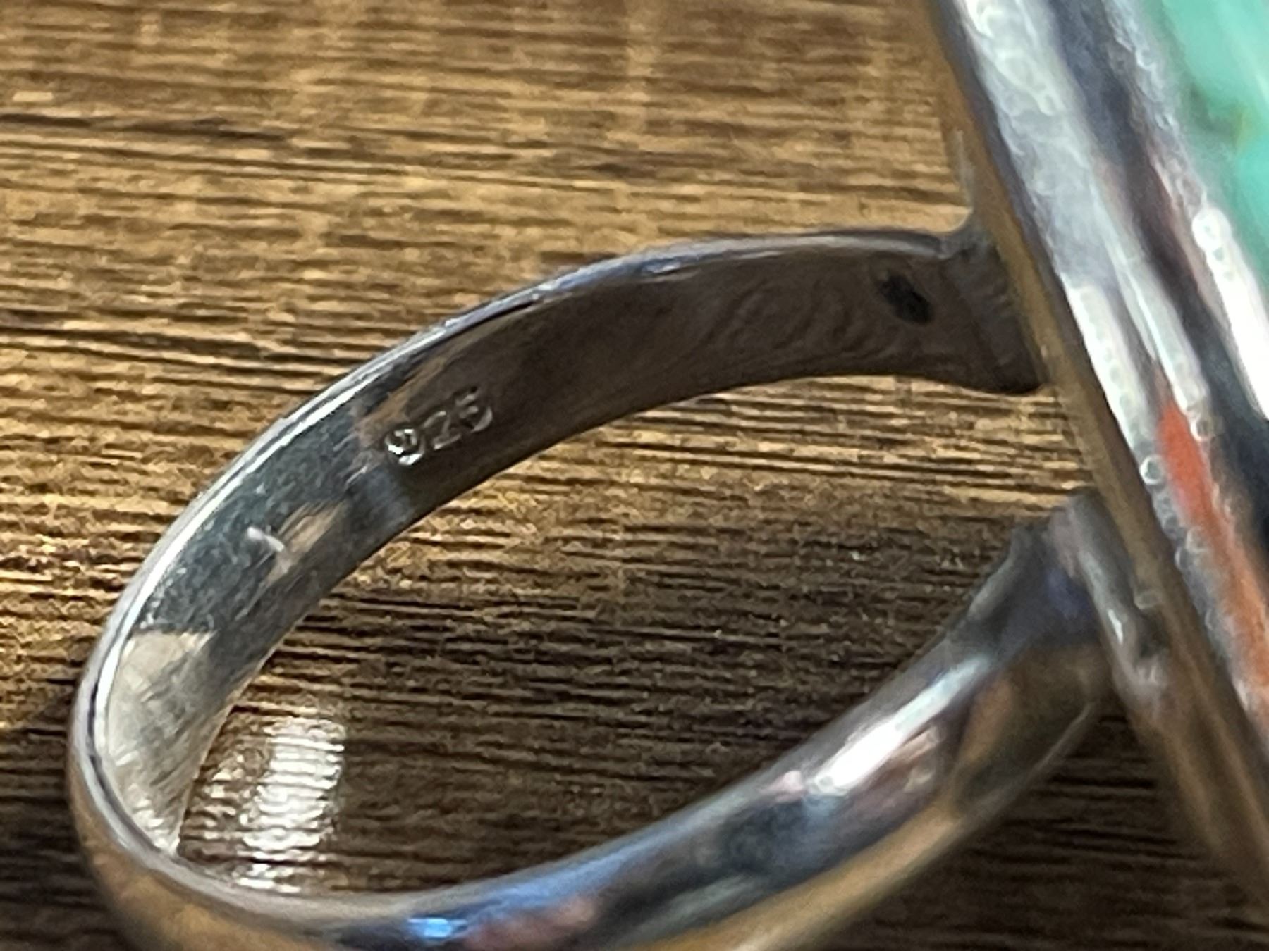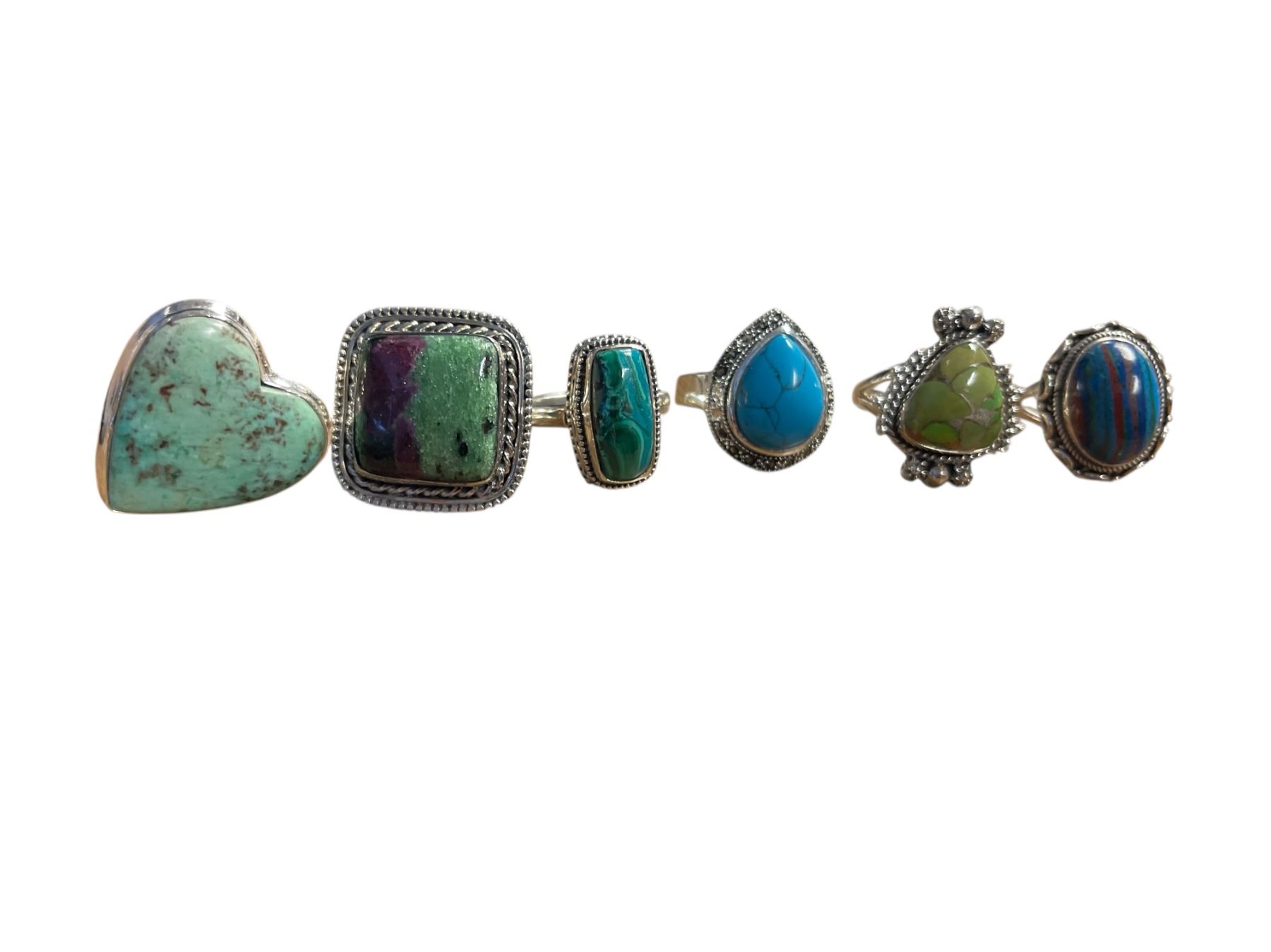 6 New Polished Natural Turquoise, Larmar, Ruby Zoisite & Malachite Rings in Silver Settings - all stamped .925 (longest ring is 27 mm) Total weight: 53.4 grams