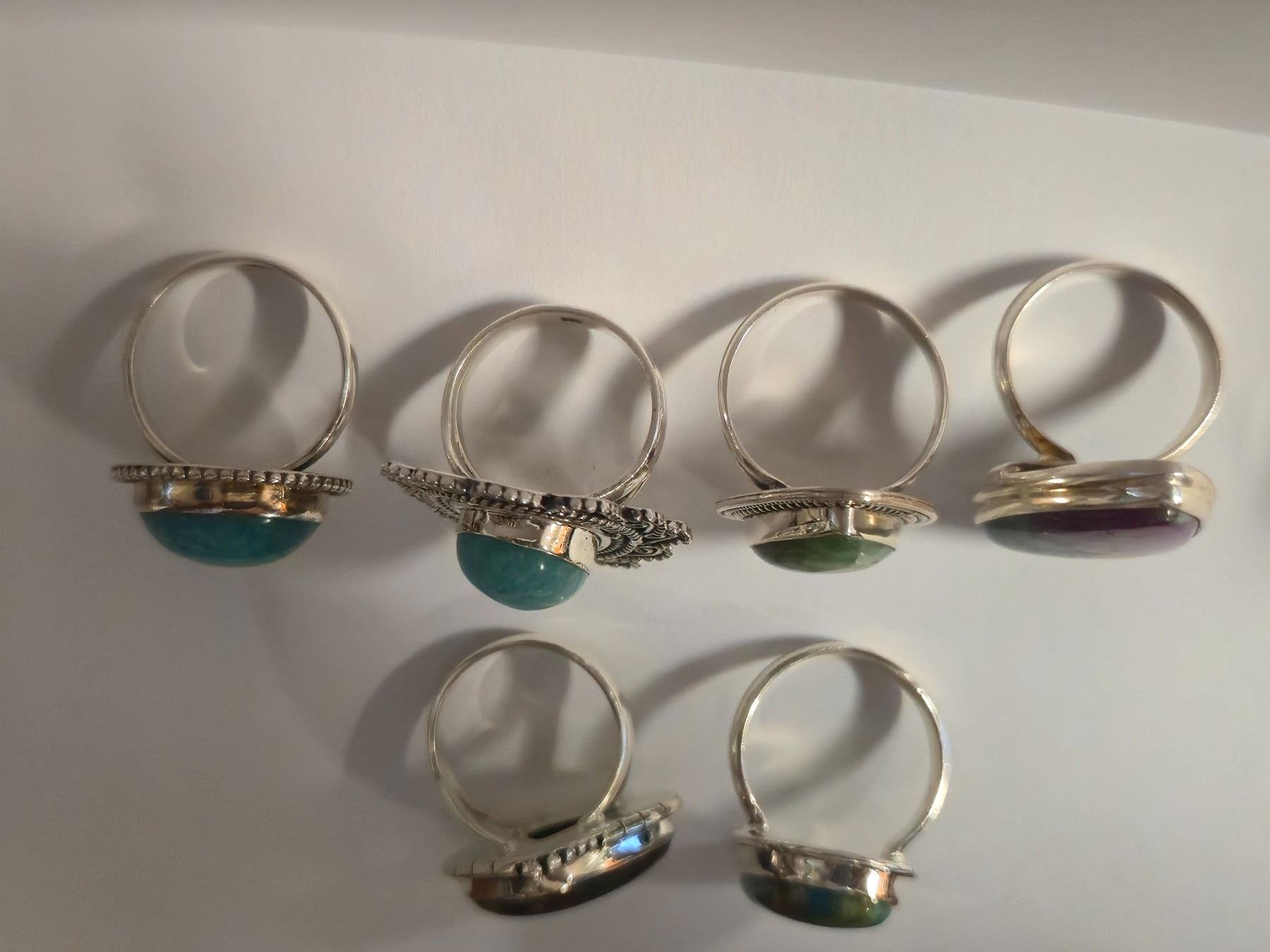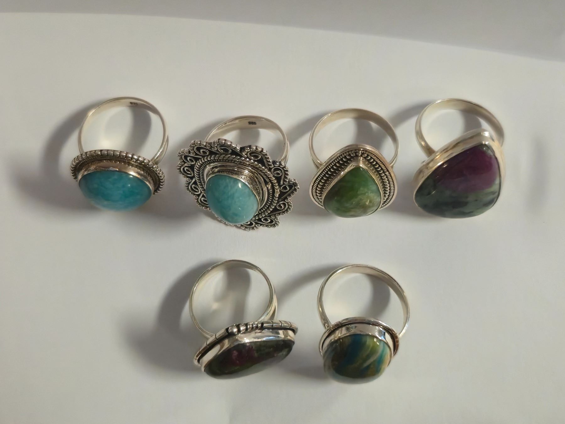 6 New Polished Natural Turquoise, Larmar, Ruby Zoisite & Malachite Rings in Silver Settings - all stamped .925 (longest ring is 31 mm) Total weight: 55.0 grams