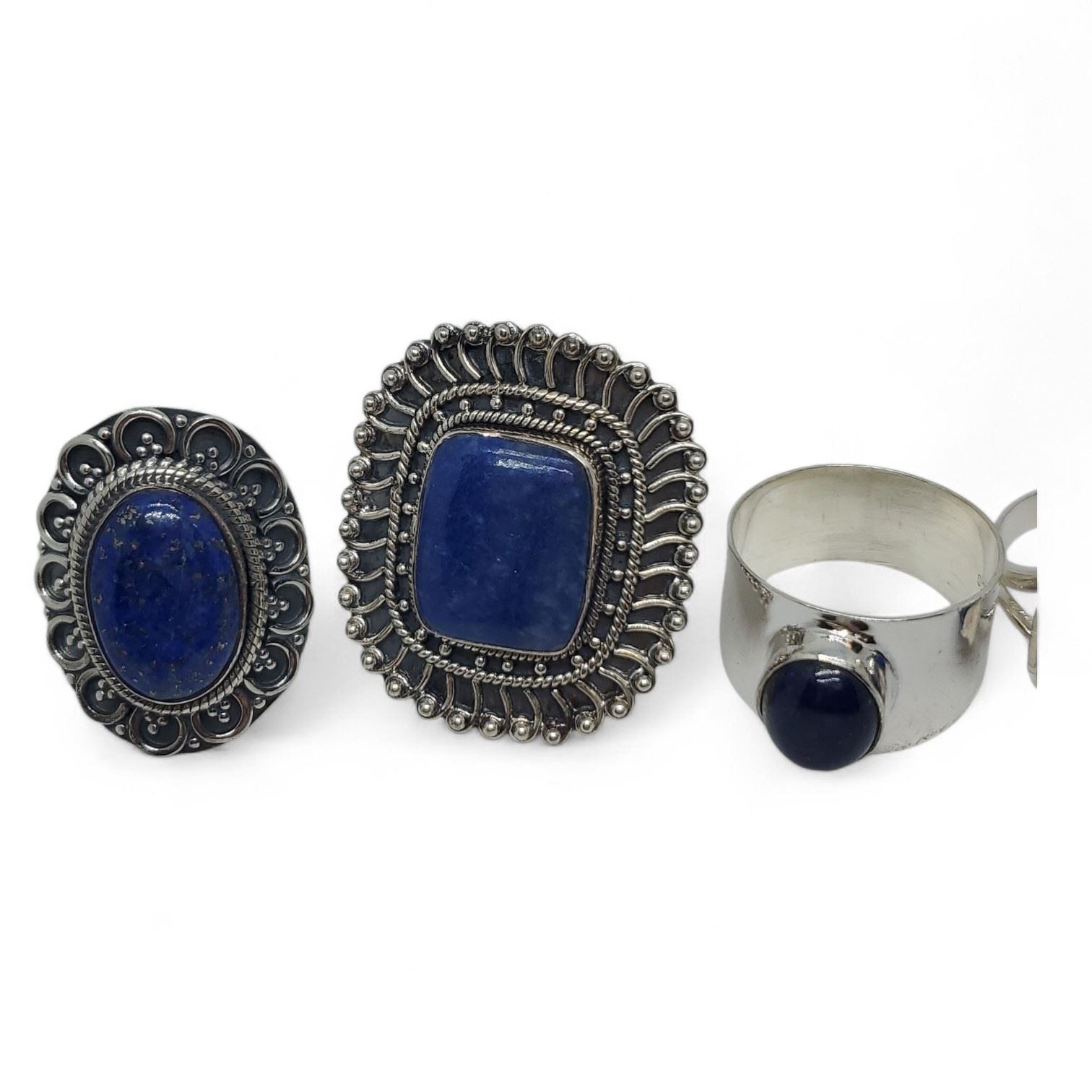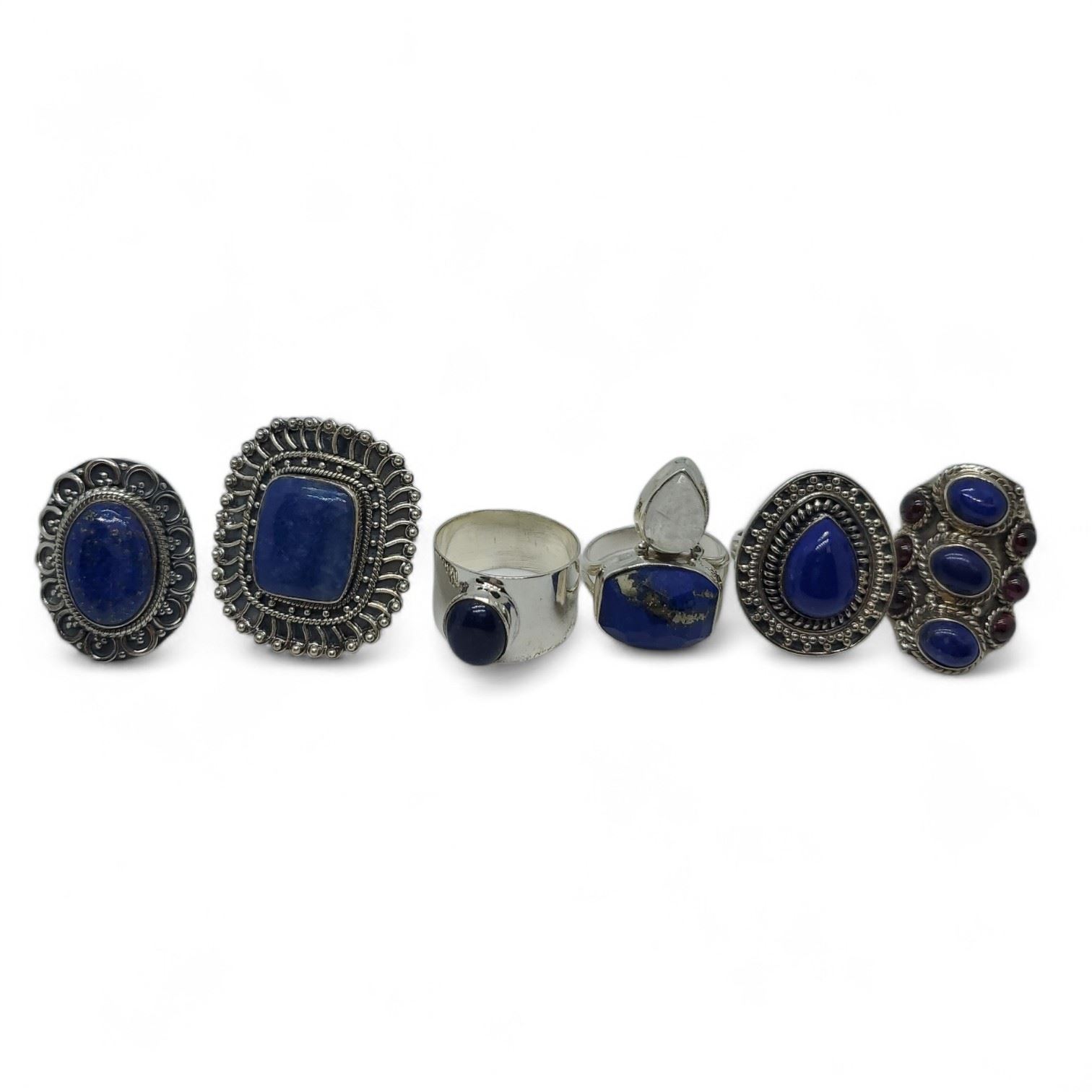 6 New Polished Natural larimar, Moonstone & Blue Lace Agate Rings in Silver Settings * all stamped .925 (longest ring is 35 mm) * Total weight: 69.4 grams