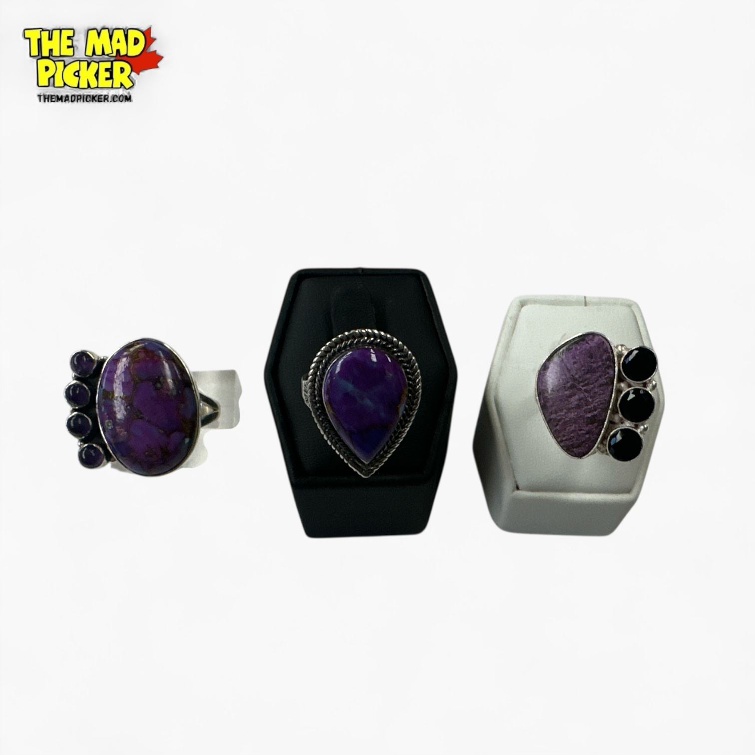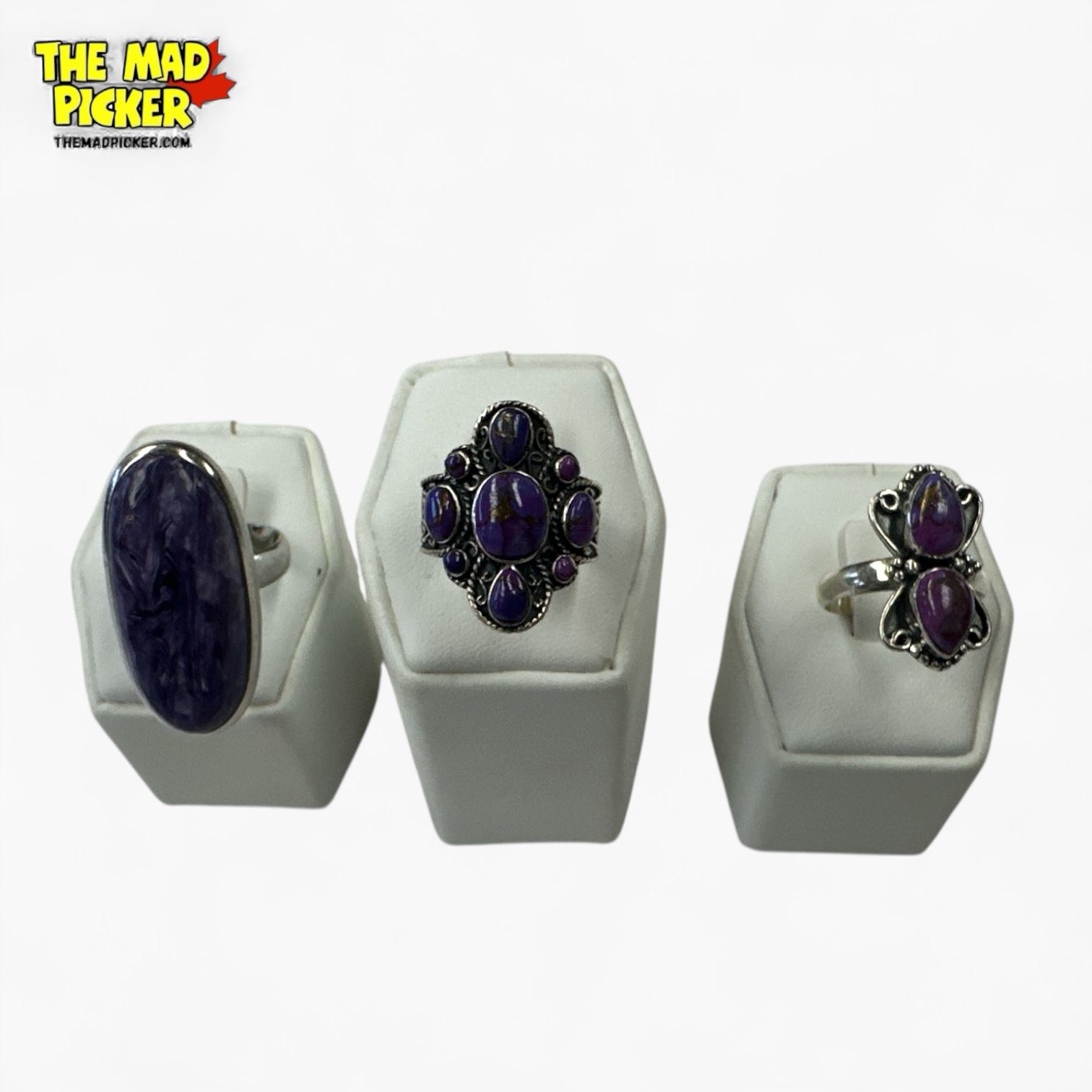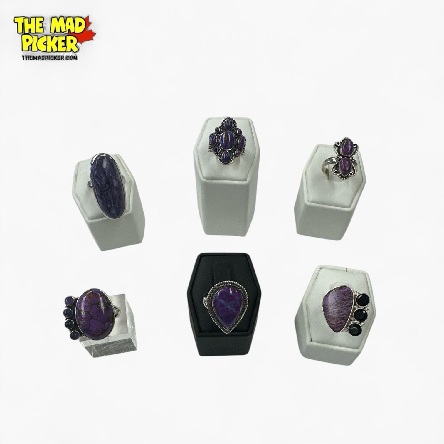6 New Polished Purple Charoite Rings in Silver Settings (all stamped .925) A few of the rings also have faceted gemstones. Total weight: 52.6 grams
