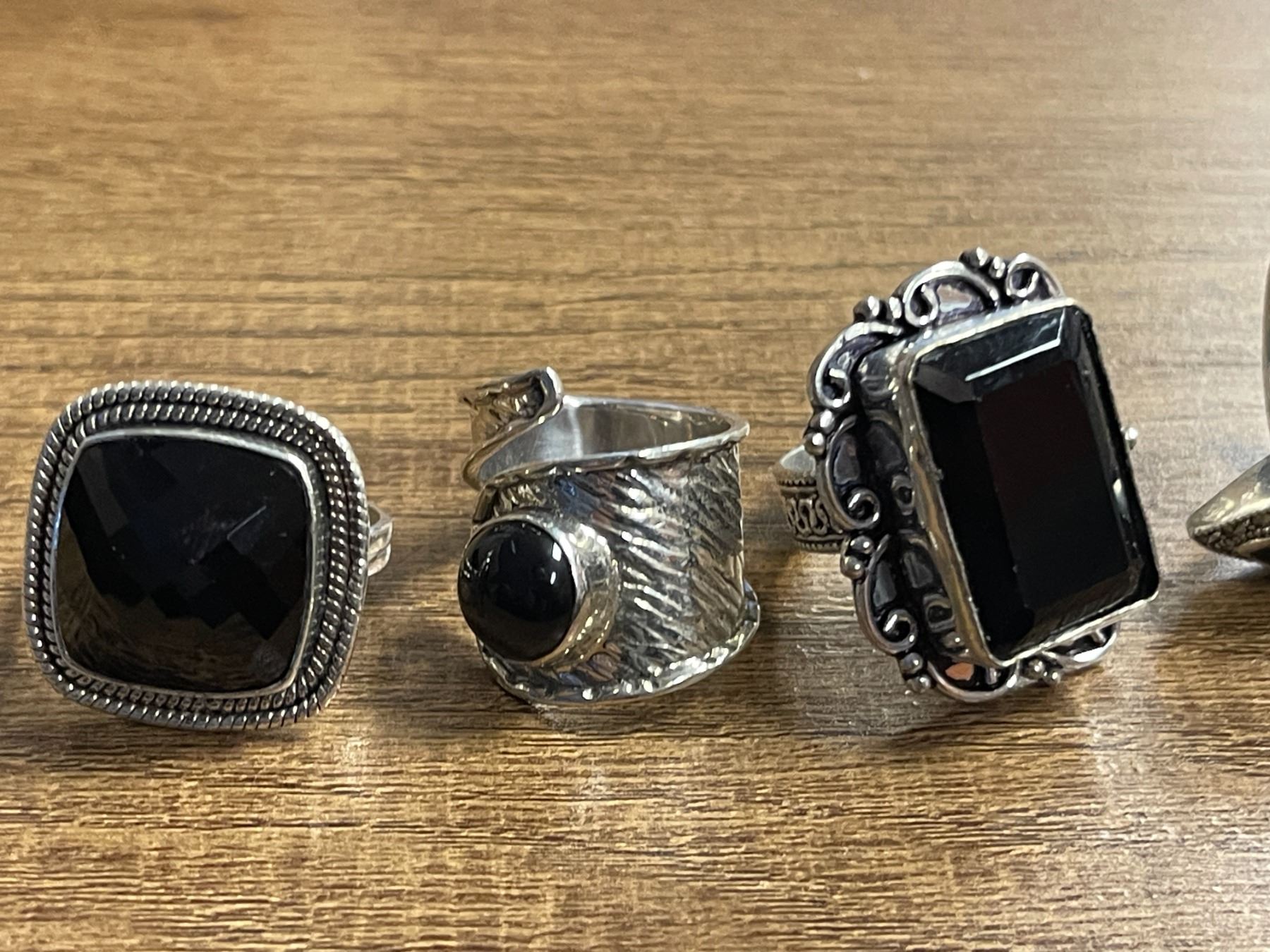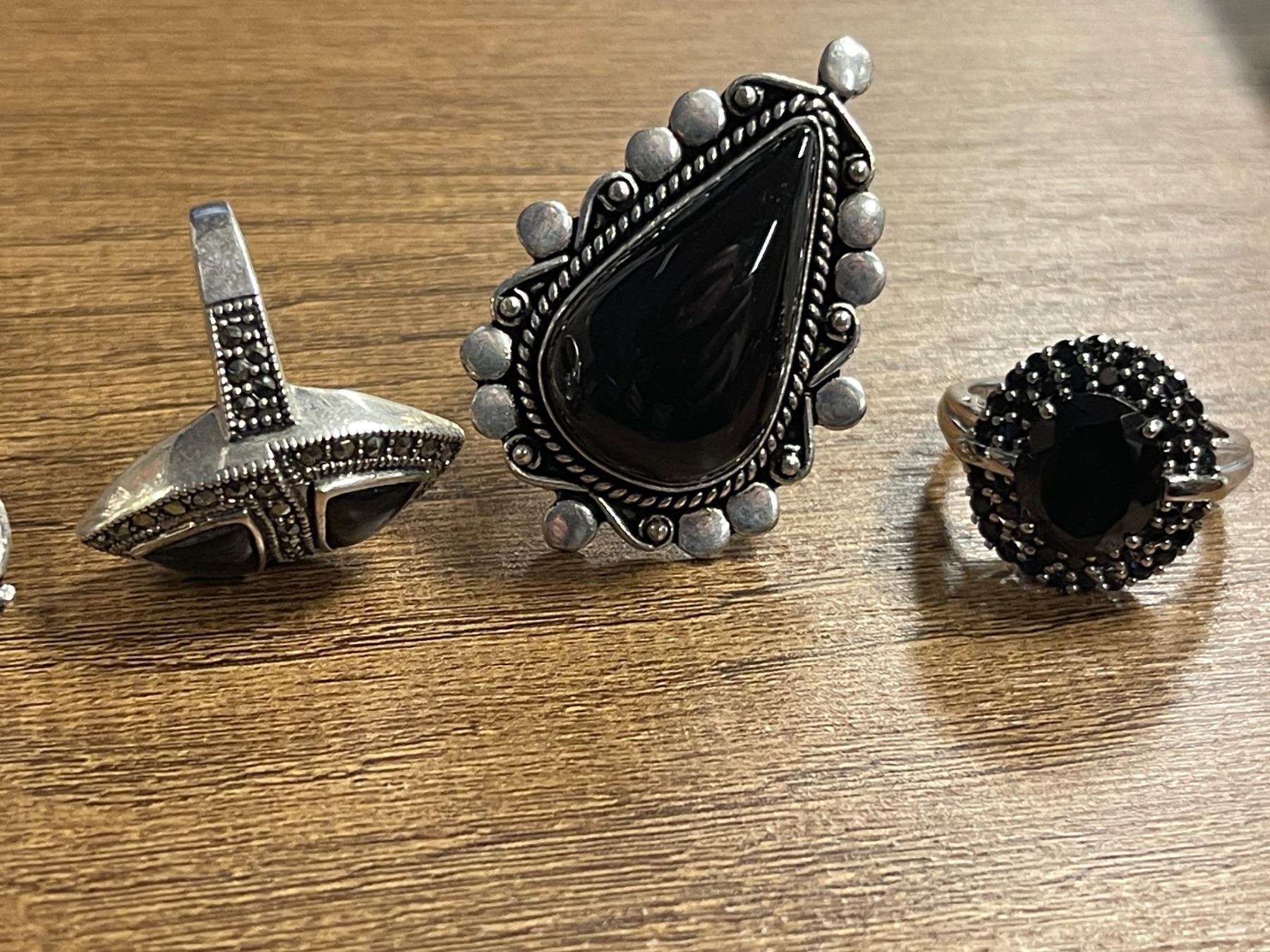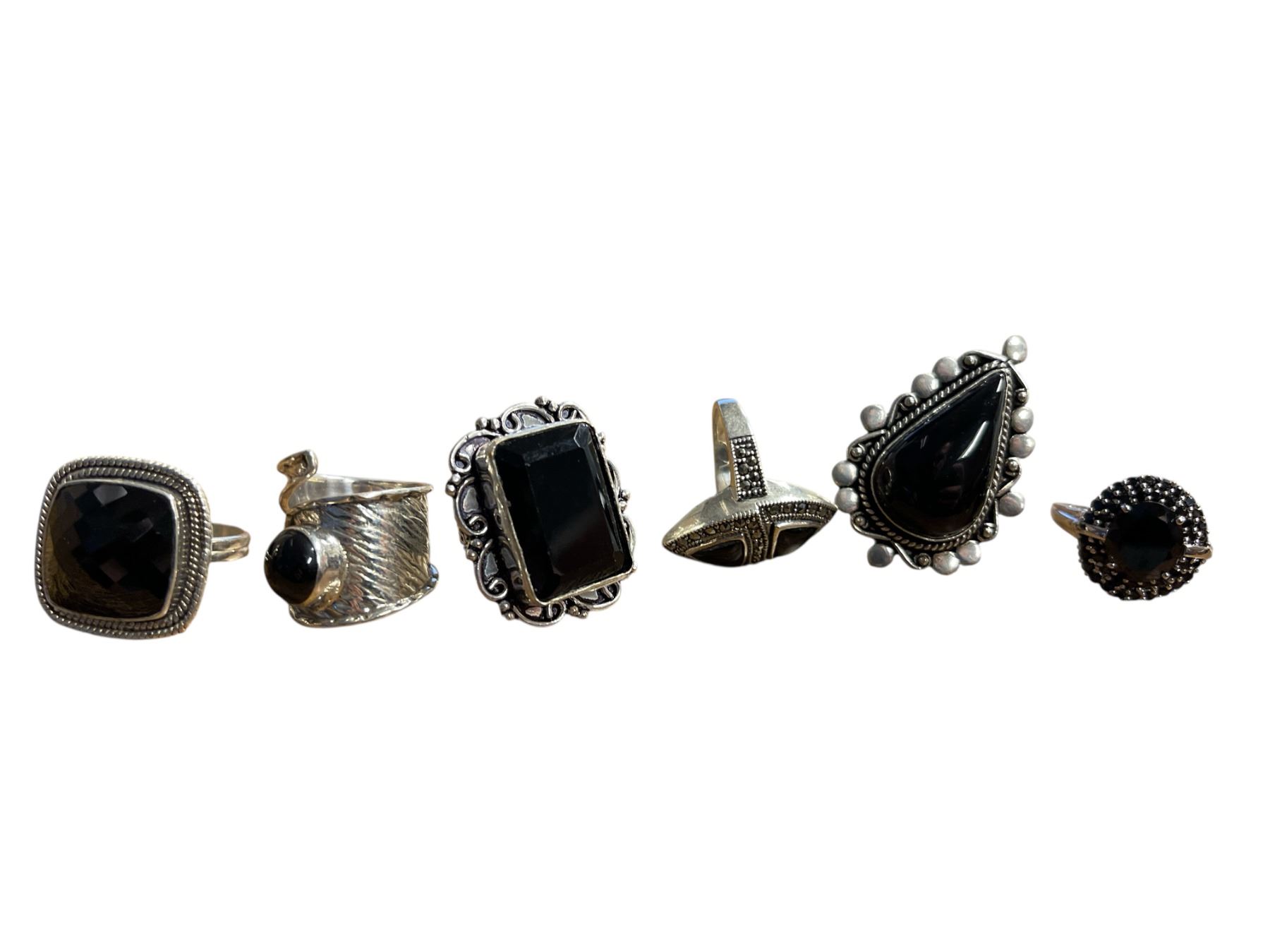 6 New Polished or Faceted Black Onyx, Hematite & Crystal Rings in Silver Settings - all stamped .925 (longest ring is 31.7 mm) Total weight: 51.9 grams