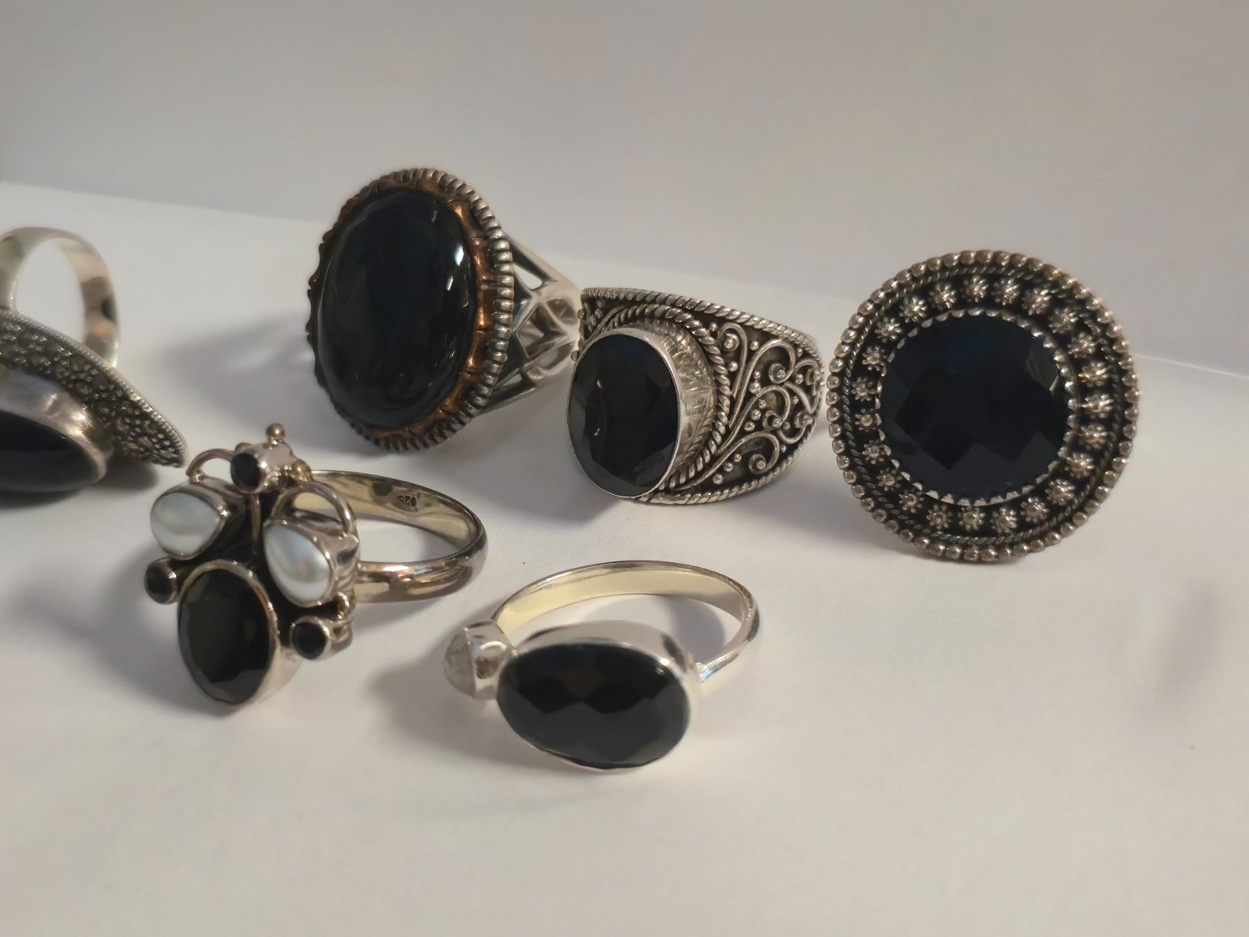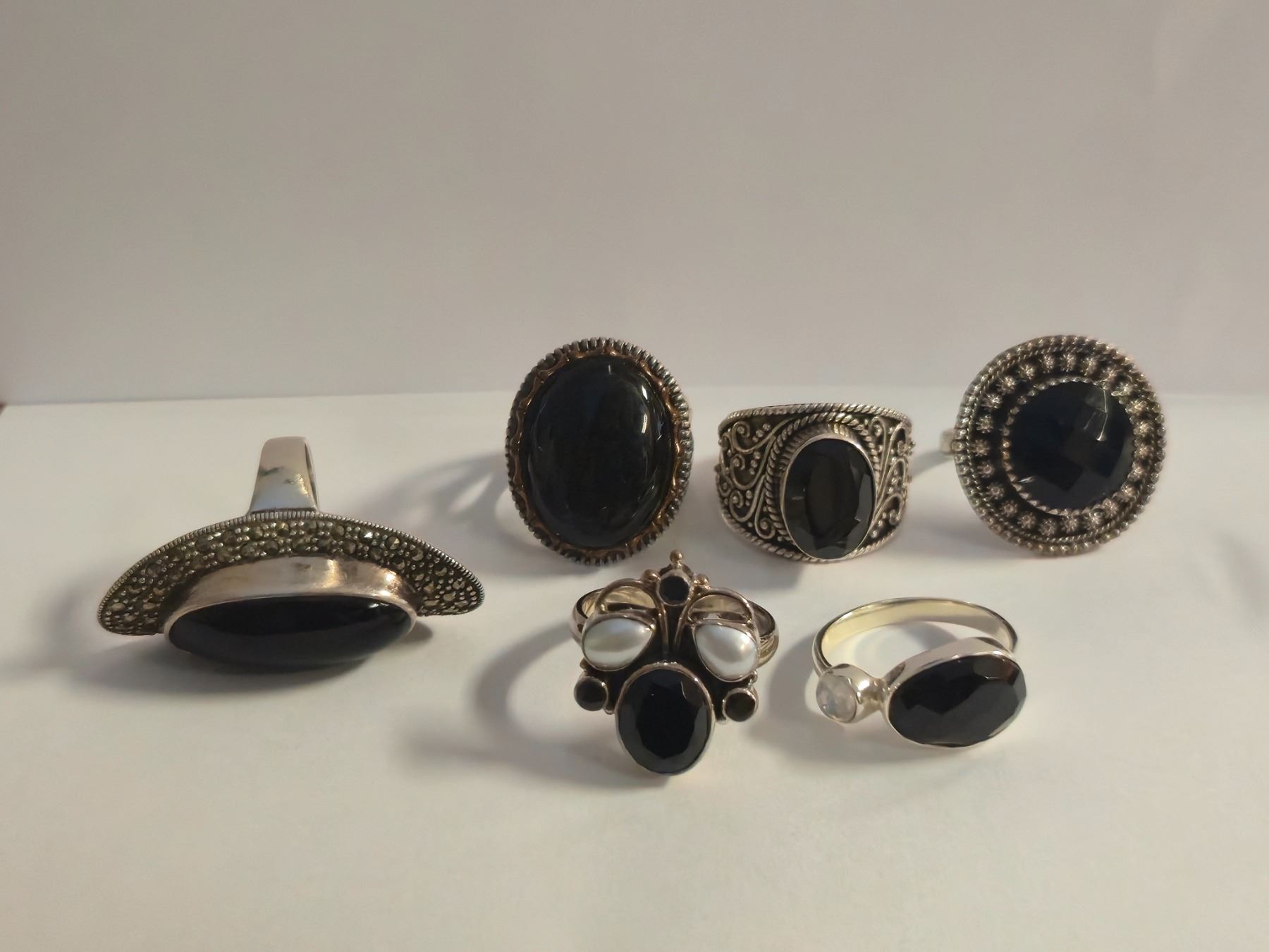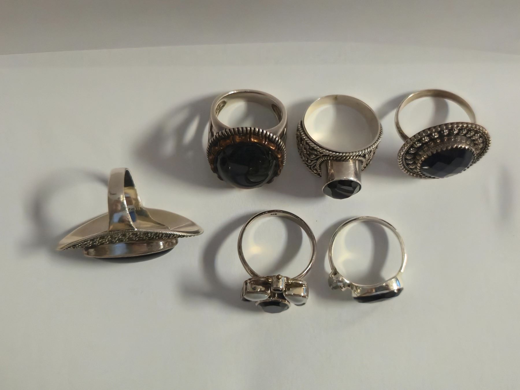 6 New Polished or Faceted Black Onyx, Hematite & Crystal Rings in Silver Settings - all stamped .925 (longest ring is 40 mm) Total weight: 52.8 grams