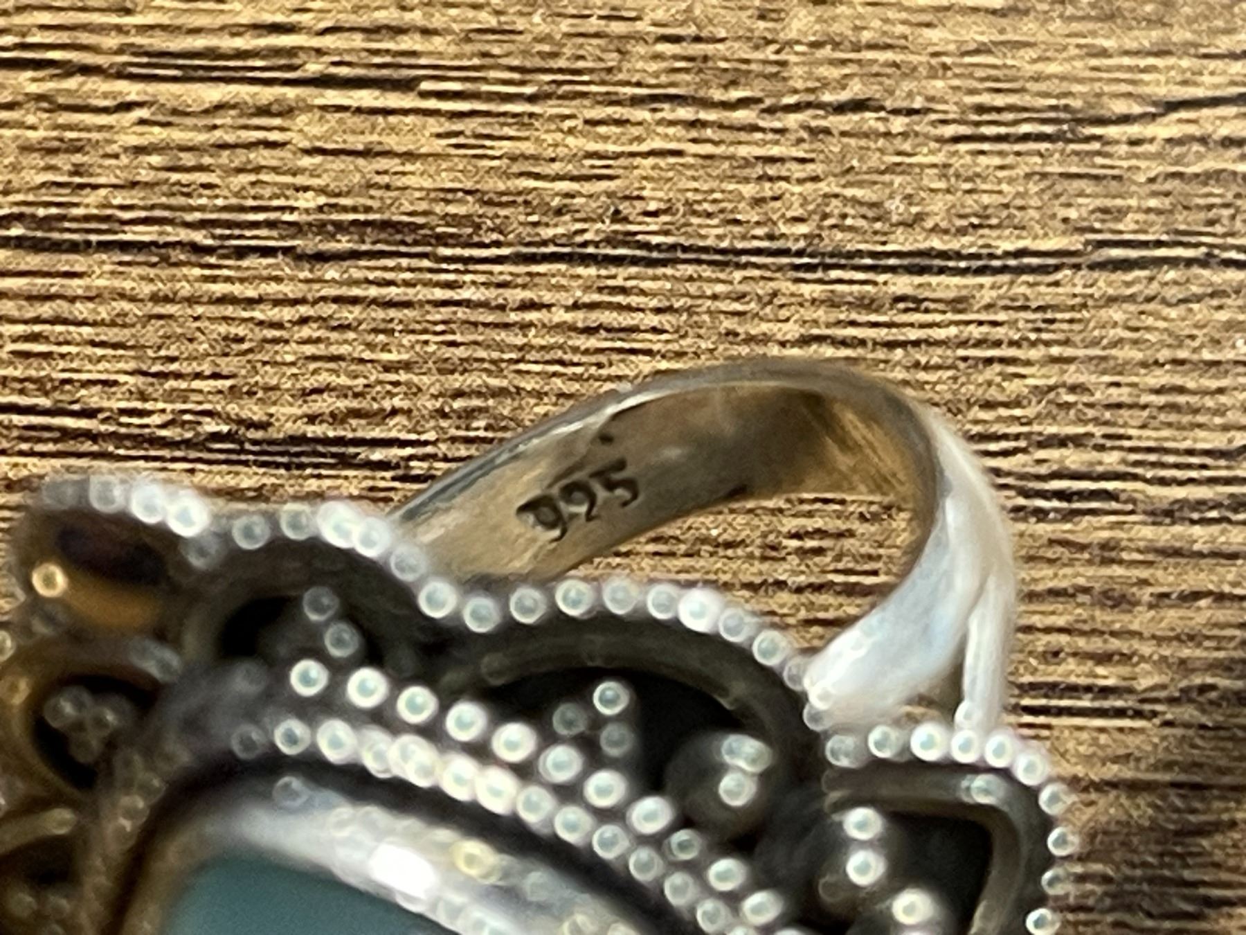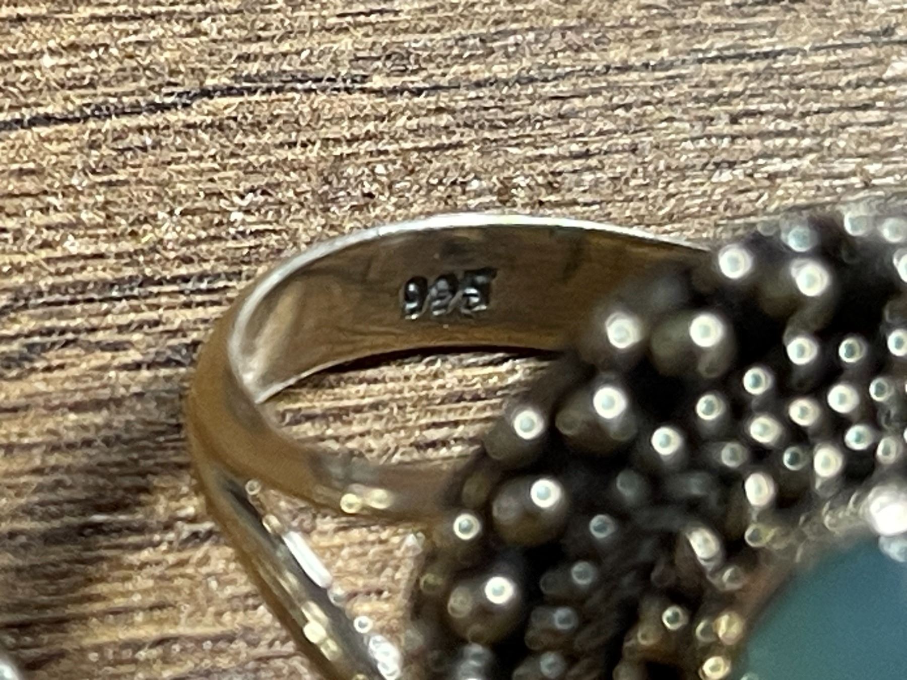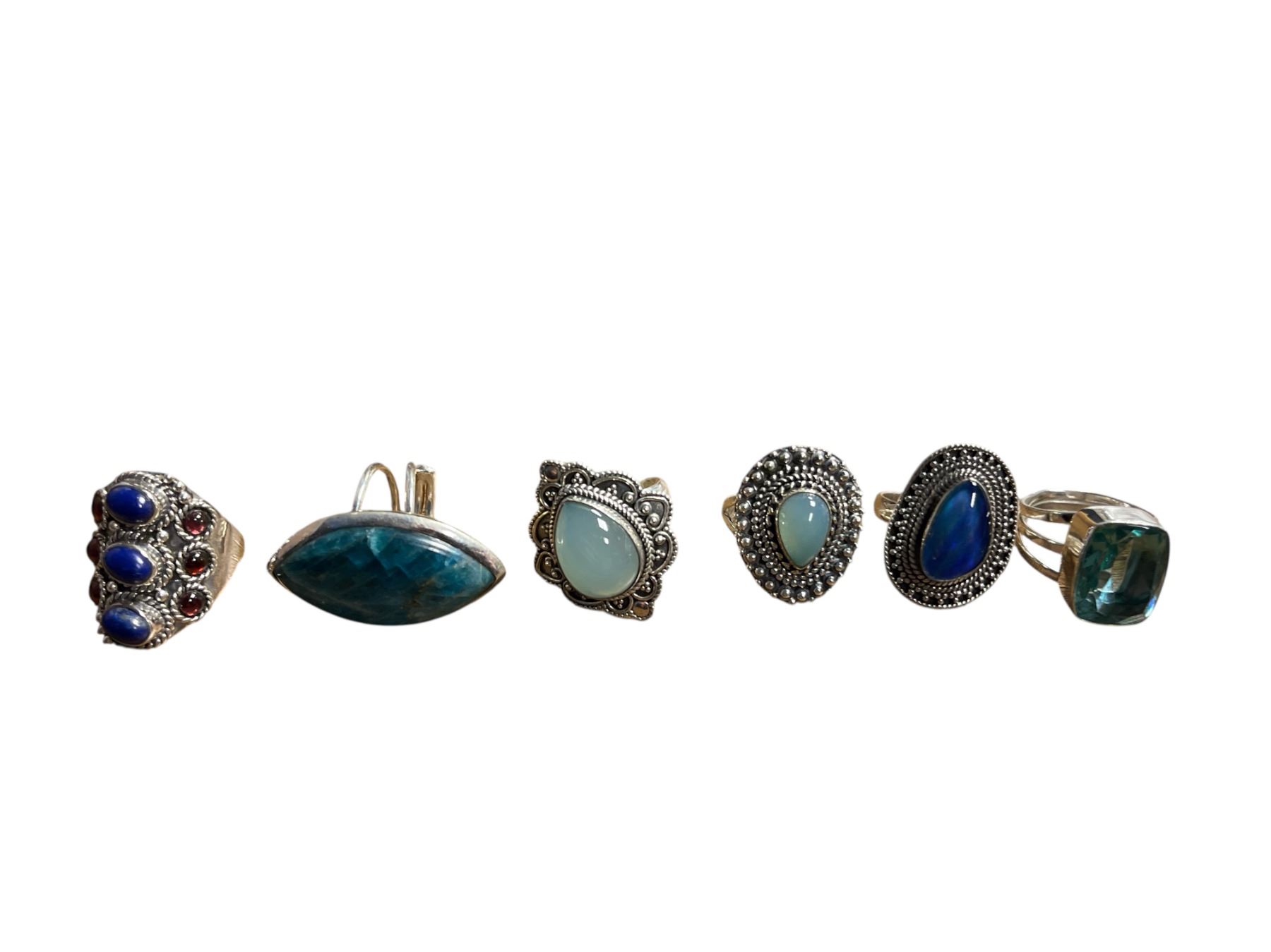 6 New Polished or Faceted Chalcedony, Agate, & Lapis Rings in Silver Settings - all stamped .925 (longest ring is 37 mm) Total weight: 50.1 grams