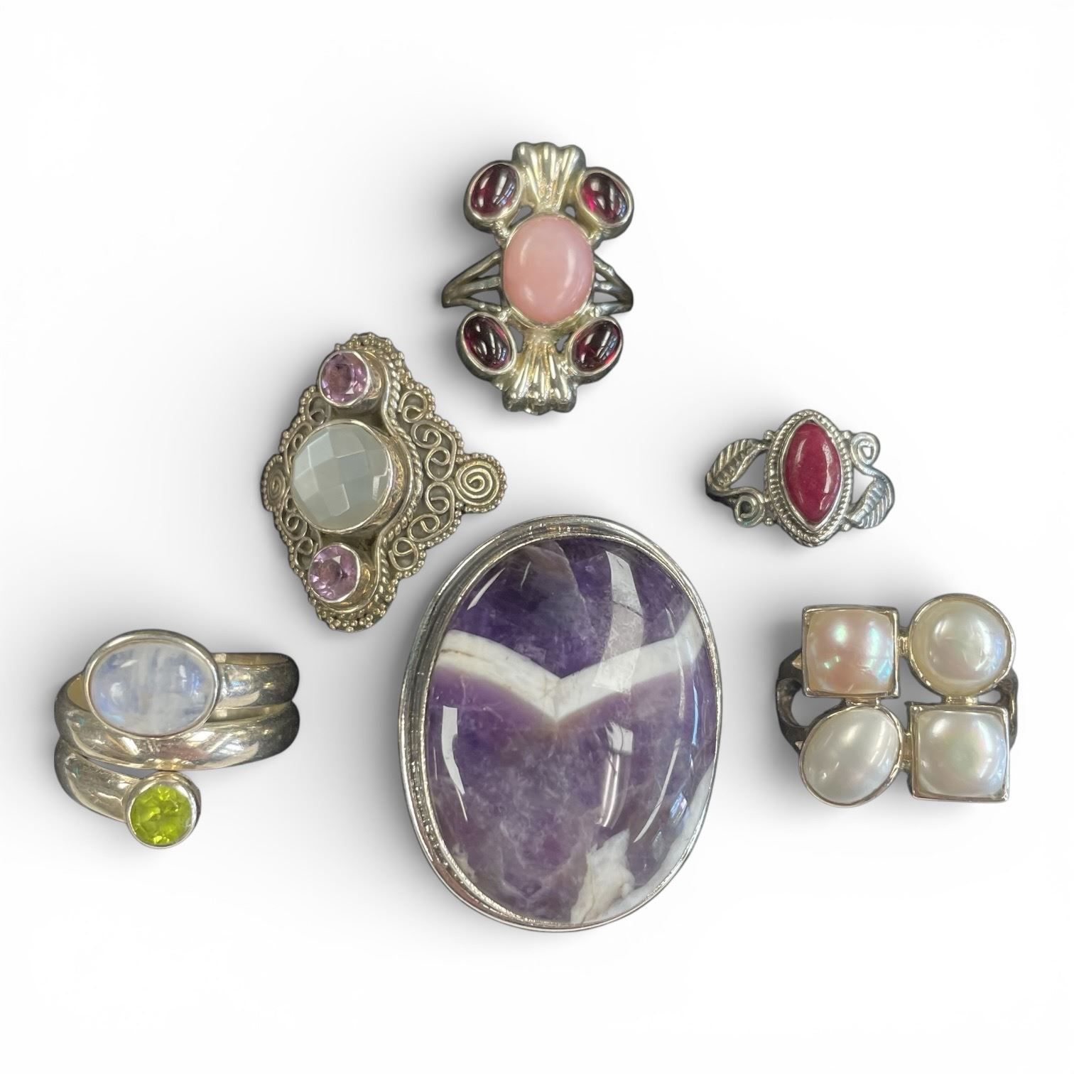 6 New Rings * all stamped .925 * (Chevron Amethyst, Pink Andean Opal, Moonstone & Faux Pearl & More) Longest ring is 37 mm * Total weight: 48 grams