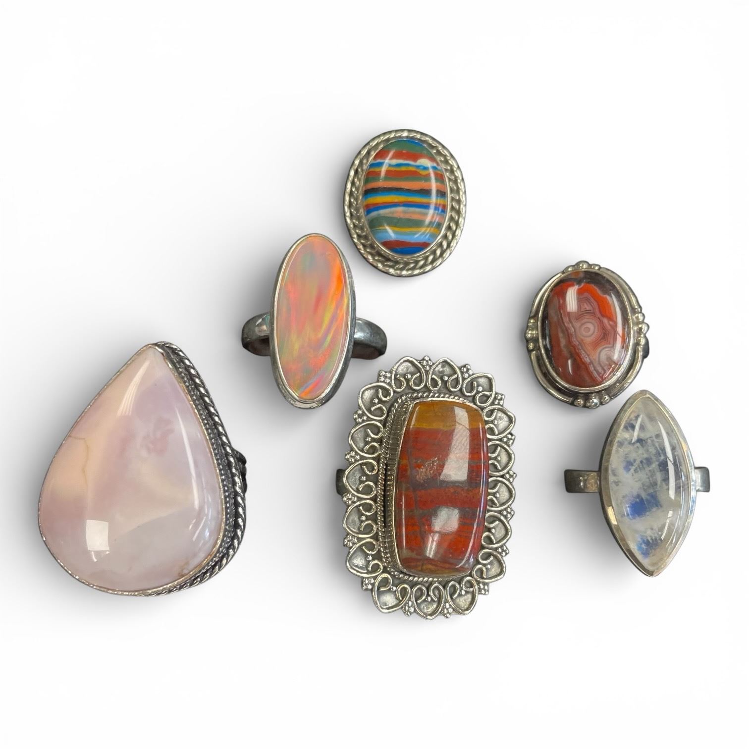 6 New Rings * all stamped .925 * (Iron Tigers Eye, Pink Andean Opal, Moonstone, Rainbow Calsilica & More) Longest ring is 35 mm * Total weight: 53 grams