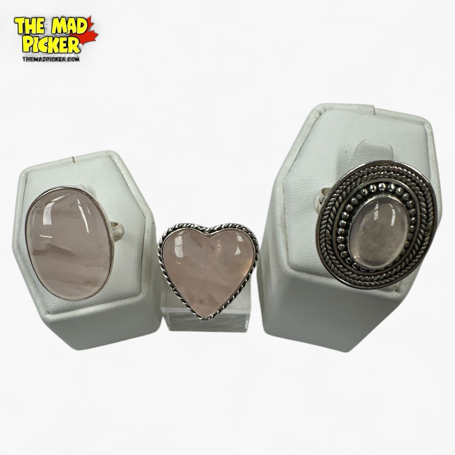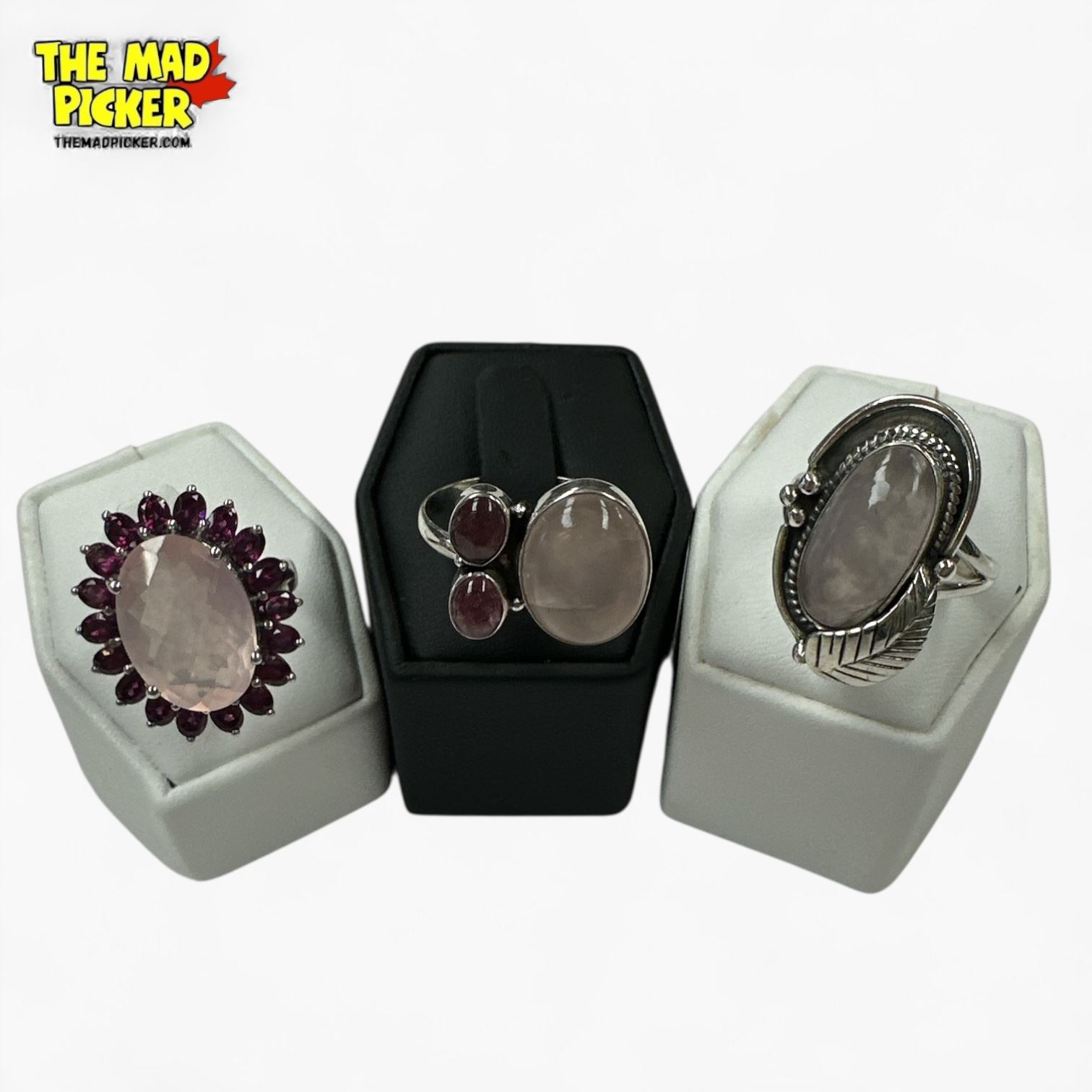 6 New Rose Quartz Rings in Silver Settings (all stamped .925) Total weight: 52.5 grams