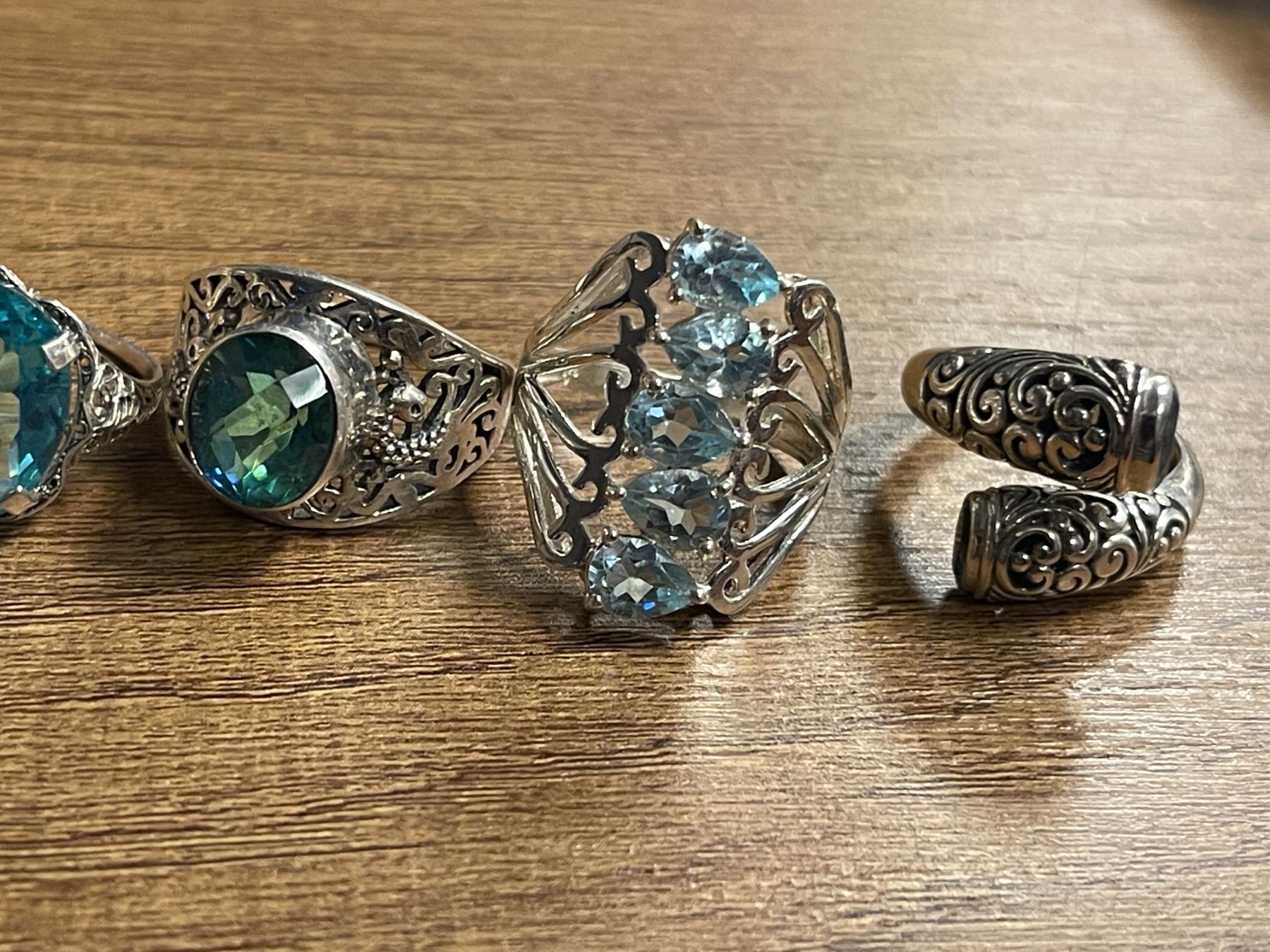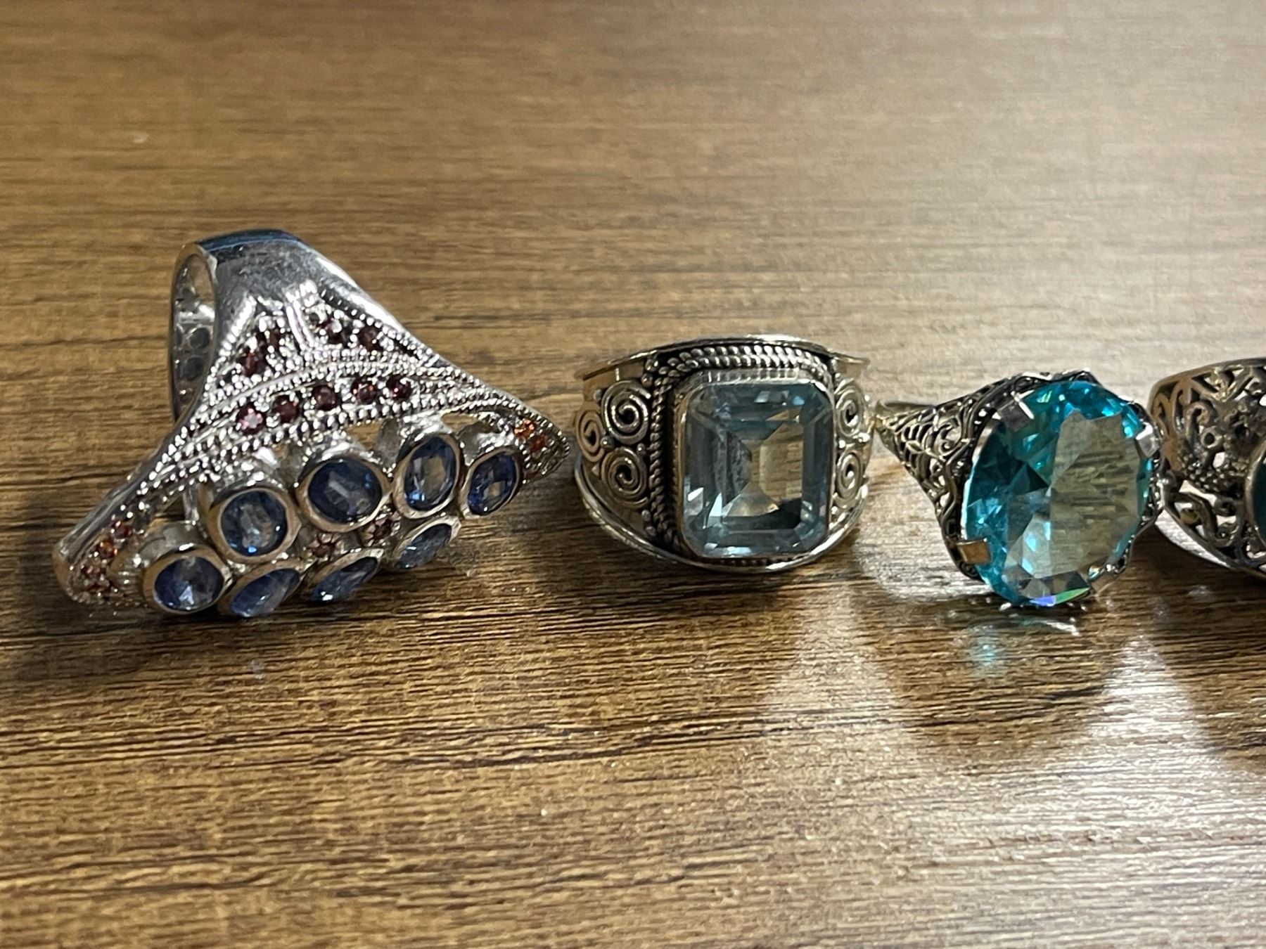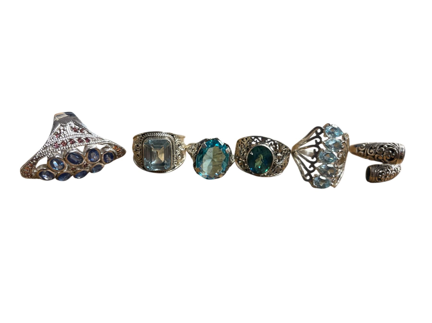 6 New Topaz Crystal Rings in Silver Settings - all stamped .925 (longest ring is 36 mm) Total weight: 42 grams