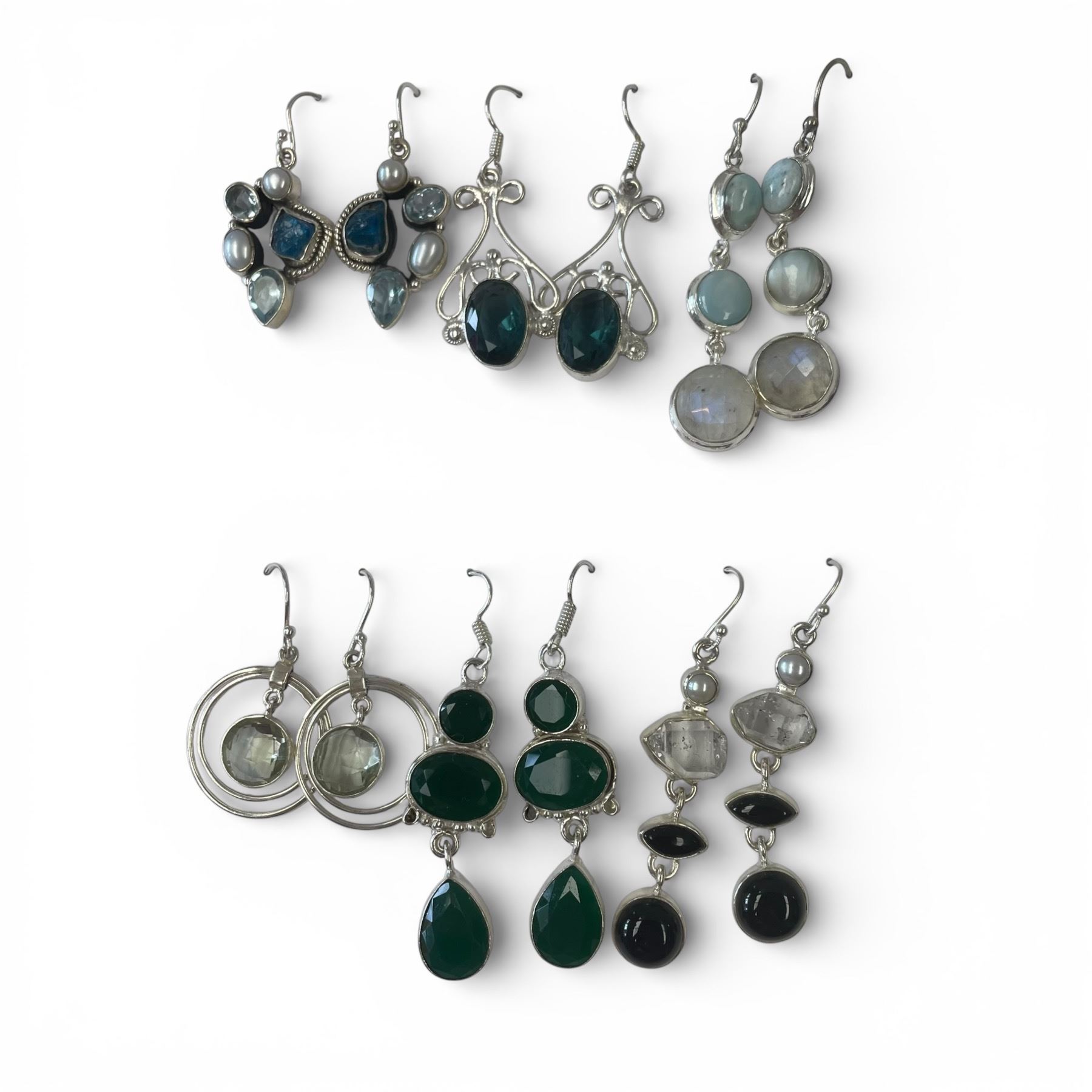 6 Pairs of Earrings in Silver Settings (Topaz Crystal, Green Agate, Onyx, Larimar, Moonstone & More) * Majority are stamped .925 * Longest is 2.5"