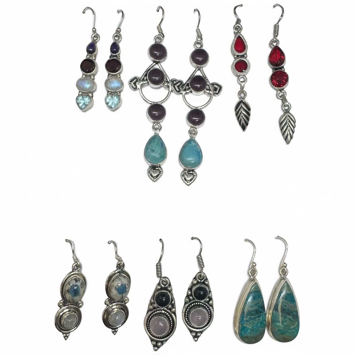 6 Pairs of Polished Natural Gemstone & Crystal Earrings in Silver Settings (Garnet, Amethyst, Rose Quartz, Topaz, Apatite & More) * Majority are stamped .925 * Longest is 3"