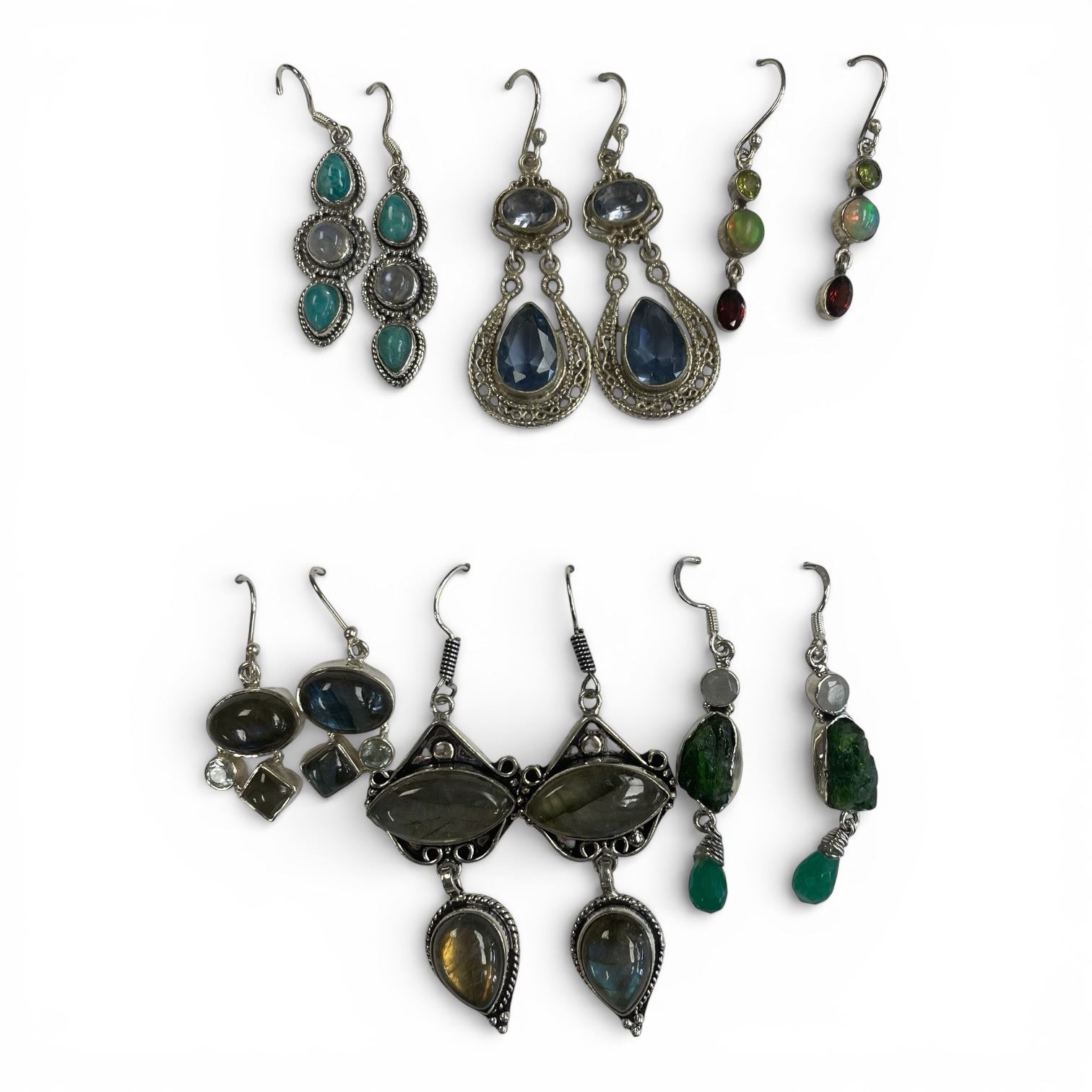 6 Pairs of Polished Natural Gemstone & Crystal Earrings in Silver Settings (Labradorite, Blue Topaz Crystal, Peridot, Opal, & More) * Majority are stamped .925 * Longest is 2"
