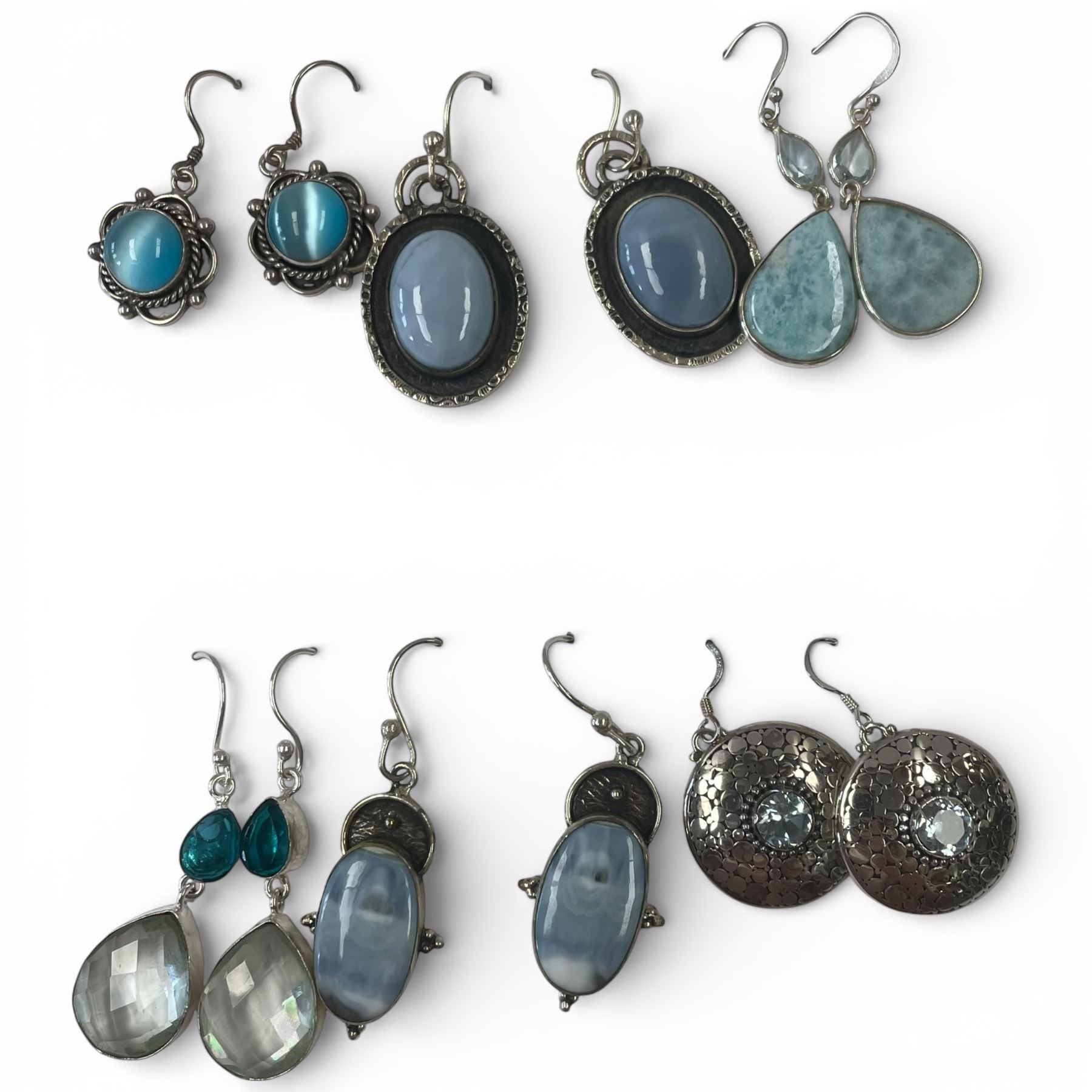 6 Pairs of Polished Natural Gemstone & Crystal Earrings in Silver Settings (Larimar, Blue Chalcedony, Clear Quartz Crystal, Topaz, & More) * Majority are stamped .925 * Longest is 1.75"