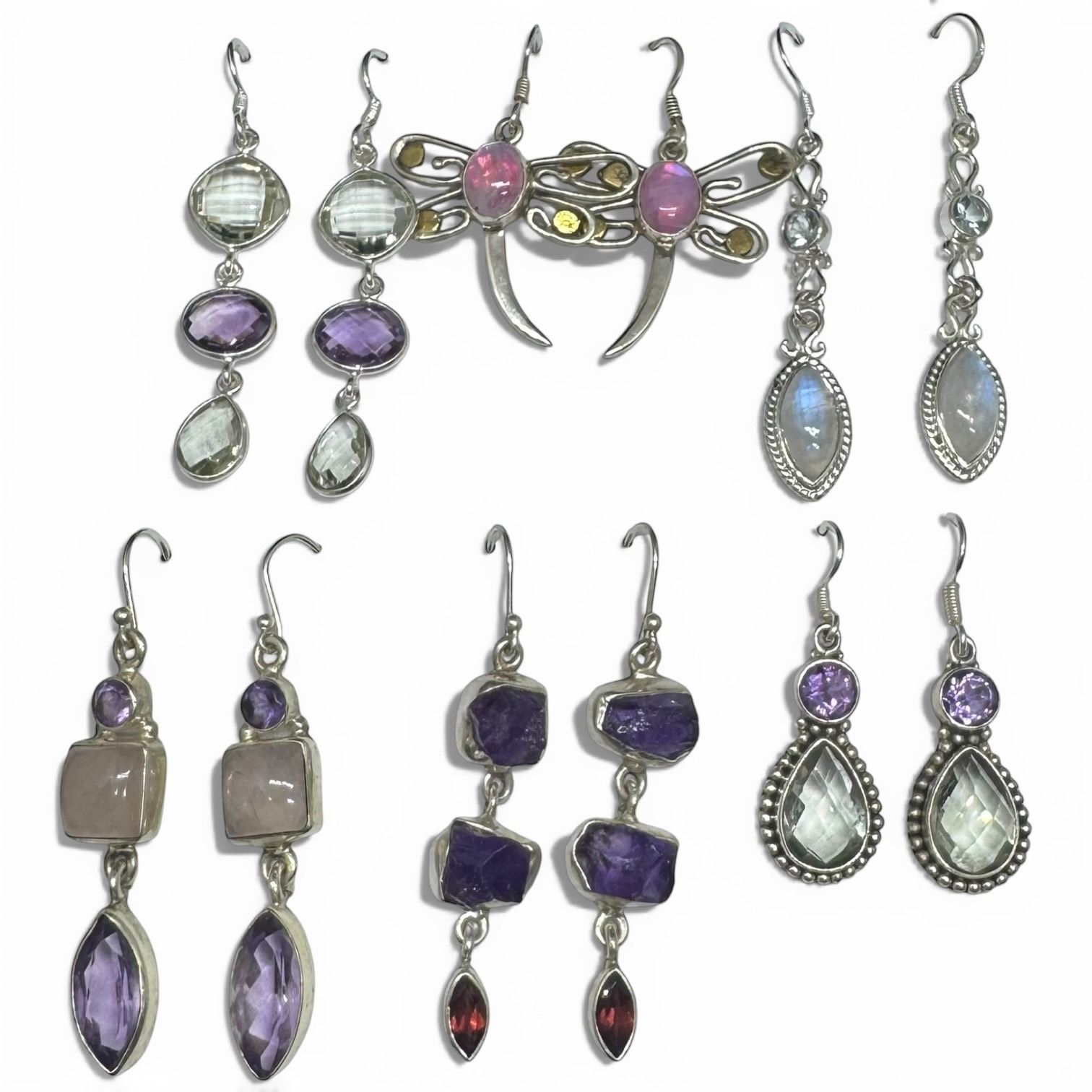 6 Pairs of Polished Natural Gemstone & Crystal Earrings in Silver Settings (Triplet Opal, Amethyst, Garnet, Rose Quartz, Moonstone, & More) * Majority are stamped .925 * Longest is 2"